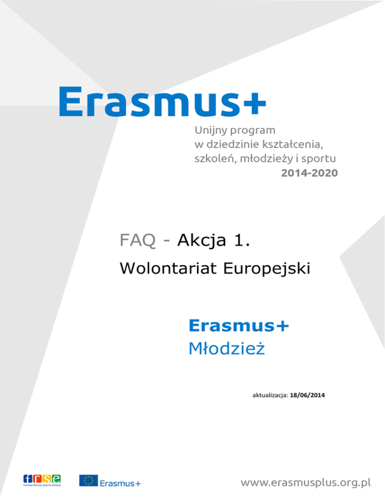 FAQ - Akcja 1. Wolontariat Europejski Erasmus+ Młodzież aktualizacja: 18/06/2014 FAQ – Erasmus+ Kształcenie i szkolenia zawodowe 1. CHCIELIBYŚMY GOŚCIĆ I WYSYŁAĆ WOLONTARIUSZY. JAKIE WARUNKI MUSIMY SPEŁNIĆ? 2. KTO MOŻE WZIĄĆ UDZIAŁ W WOLONTARIACIE I CO MUSI ZROBIĆ ŻEBY WYJAZD BYŁ MOŻLIWY? 3. ZA MIESIĄC SKOŃCZĘ 30 LAT. CZY TO DYSKWALIFIKUJE MNIE JAKO POTENCJALNEGO UCZESTNIKA PROGRAMU? 4. CZY WOLONTARIUSZ PONOSI JAKIEŚ KOSZTY W ZWIĄZKU Z UDZIAŁEM W WOLONTARIACIE? 5. CZY OSOBY, KTÓRE BYŁY NA WOLONTARIACIE W RAMACH PROGRAMU „MŁODZIEŻ W DZIAŁANIU” MOGĄ UBIEGAĆ SIĘ O WYJAZD NA WOLONTARIAT W RAMACH PROGRAMU ERASMUS+? 6. CZY UDZIAŁ W PROJEKCIE "NA DUŻĄ SKALĘ" WYKLUCZA UDZIAŁ W WOLONTARIACIE DŁUGOTERMINOWYM? 7. JAK OPISAĆ WIZYTĘ PRZYGOTOWAWCZĄ WE WNIOSKU? 8. JAK OBLICZYĆ DNI WYMIANY? 9. GDZIE WE WNIOSKU WPISUJE SIĘ TERMIN REALIZACJI DZIAŁAŃ? 10. JAK OBLICZYĆ PODRÓŻ GRUPY POLSKIEJ OD 0 DO 99 KM? 11. GDZIE WPISAĆ LIDERÓW I OPIEKUNÓW? 12. CZY AKREDYTACJA JEST KONIECZNA W PRZYPADKU UBIEGANIA SIĘ O DOFINANSOWANIE WYMIANY MŁODZIEŻOWEJ? 13. W KTÓREJ CZĘŚCI WNIOSKU OBLICZA SIĘ BUDŻET – RYCZAŁT NA WSPARCIE ORGANIZACYJNE? 14. CZY W WYMIANACH MOŻNA OTRZYMAĆ DOFINANSOWANIE NA INDYWIDUALNE WSPARCIE UCZESTNIKÓW I WSPARCIE JĘZYKOWE? 15. CO NALEŻY ZAŁĄCZYĆ DO WNIOSKU? 17. JAK WPROWADZIĆ ADRES E-MAIL DO DANYCH ORGANIZACJI? Narodowa Agencja Programu Erasmus+ Dokument dostępny na: www.erasmusplus.org.pl/faq Strona 2 16. JAKIE DZIAŁANIA NIE MOGĄ ZOSTAĆ DOFINANSOWANE JAKO WYMIANY MŁODZIEŻY? FAQ – Erasmus+ Kształcenie i szkolenia zawodowe 18. CZY PROJEKT 4-DNIOWEGO SZKOLENIA BĄDŹ SEMINARIUM DLA PRACOWNIKÓW MŁODZIEŻOWYCH, KTÓRY RAZEM Z PRZYGOTOWANIAMI I EWALUACJĄ TRWA PONAD 3 MIESIĄCE TO PROJEKT DŁUGO CZY KRÓTKOTERMINOWY? 19. GDZIE NALEŻY WPISAĆ EWENTUALNYCH TRENERÓW I EKSPERTÓW PRZY PROJEKTACH SZKOLENIOWYCH? 20. JAKICH DOKUMENTÓW DOTYCZY PUNKT E.2.: „CZY PLANUJĄ PAŃSTWO WYKORZYSTANIE JAKICHKOLWIEK KRAJOWYCH DOKUMENTÓW/CERTYFIKATÓW? JEŚLI TAK, TO JAKICH?” 21. JAKIE DZIAŁANIA MOŻNA ZREALIZOWAĆ W AKCJI 3. ROZWÓJ POLITYKI MŁODZIEŻOWEJ? 22. JAKIE DZIAŁANIA MOŻNA PROWADZIĆ W RAMACH AKCJI 3.? 23. W JAKI SPOSÓB STWORZYĆ BUDŻET PROJEKTU I JAKIŚ PROCENT WKŁADU WŁASNEGO JEST WYMAGANY W PROJEKCIE? 24. JESTEŚMY SZKOŁĄ, CHCEMY ZREALIZOWAĆ PROJEKT NA RZECZ MŁODZIEŻY – CZY SEKTOR MŁODZIEŻOWY JEST WŁAŚCIWY DLA NAS? 25. ILE ORGANIZACJI PARTNERSKICH MOŻE REALIZOWAĆ PROJEKT AKCJI 2. W SEKTORZE MŁODZIEŻY? 26. CZY W RAMACH AKCJI 2. PARTNERSTWA STRATEGICZNE MOŻNA ORGANIZOWAĆ MIĘDZYNARODOWE INICJATYWY MŁODZIEŻOWE? 27. CZY W PROJEKTOWE DZIAŁANIA MUSZĄ BYĆ ZAANGAŻOWANA MŁODZIEŻ? 28. JAK ROZUMIEĆ „STRATEGICZNE PARTNERSTWO”? 29. KTO MOŻE STARAĆ SIĘ O DOFINANSOWANIE TAKICH PROJEKTÓW? Strona 31. PLANUJEMY ZREALIZOWAĆ PROJEKT, W KTÓRYM POZA PRACOWNIKAMI MŁODZIEŻOWYMI, CHCEMY RÓWNIEŻ WŁĄCZYĆ NAUCZYCIELI, TAK ABY W RAMACH PROJEKTY NABYLI WIEDZĘ, POTRZEBNĄ IM W CODZIENNEJ PRACY, CZY SEKTOR MŁODZIEŻOWY JEST WŁAŚCIWY DLA TAKIEGO PROJEKTY? 3 30. NA CZYM POLEGAJĄ MIĘDZYNARODOWE INICJATYWY MŁODZIEŻOWE? Narodowa Agencja Programu Erasmus+ Dokument dostępny na: www.erasmusplus.org.pl/faq FAQ – Erasmus+ Kształcenie i szkolenia zawodowe 1. Chcielibyśmy gościć i wysyłać wolontariuszy. Jakie warunki musimy spełnić? Każda organizacja, która chce wziąć udział w Wolontariacie Europejskim i gościć lub wysyłać wolontariuszy musi zdobyć akredytację. W tym celu należy złożyć „Wniosek o Akredytację” ze wszystkimi niezbędnymi załącznikami. Wnioski te można składać w dowolnym terminie. Wystąpienie o akredytację powinno nastąpić z wyprzedzeniem, przed złożeniem wniosku o środki finansowe na projekt Wolontariatu Europejskiego , aby nie doszło do odrzucenia projektu ze względu na to, że niektóre uczestniczące w nim organizacje nie otrzymały akredytacji do czasu złożenia wniosku. Organizacja, która chce składać wniosek o dofinansowanie (a nie tylko być partnerem w projekcie) musi ubiegać się o status tzw. organizacji koordynującej. Kto może wziąć udział w wolontariacie i co musi zrobić żeby wyjazd był możliwy? 4 Na Wolontariat Europejski może wyjechać każda osoba w wieku 17-30 lat, legalnie przebywająca na terenie Polski. Pierwszym krokiem jest znalezienie organizacji wysyłającej (najlepiej w pobliżu miejsca zamieszkania) lub goszczącej. Wszystkie dalsze kroki przedstawia poniższy schemat. Strona 2. Narodowa Agencja Programu Erasmus+ Dokument dostępny na: www.erasmusplus.org.pl/faq FAQ – Erasmus+ Kształcenie i szkolenia zawodowe 3. Za miesiąc skończę 30 lat. Czy to dyskwalifikuje mnie jako potencjalnego uczestnika programu? Nie, w przypadku Wolontariatu Europejskiego górną granicą wieku jest 30 lat, więc w momencie składania wniosku wolontariusz nie może mieć skończonych 31 lat. 4. Czy wolontariusz ponosi jakieś koszty w związku z udziałem w wolontariacie? Wolontariusz nie ponosi prawie żadnych kosztów w związku z udziałem w projekcie Wolontariatu Europejskiego. Jedynym jego udziałem może być wkład w koszty podróży. Organizacja otrzymuje dofinansowanie kosztów podróży, jednakże może się ono okazać nie wystarczające na przejazd na określonej trasie. W takim przypadku organizacja może poprosić wolontariusza o sfinansowanie części kosztów podroży we własnym zakresie. Wolontariusz pokrywa również swoje własne, prywatne wydatki, które wykraczają ponad kieszonkowe, które otrzymuje od organizacji. 5. Czy osoby, które były na wolontariacie w ramach programu „Młodzież w działaniu” mogą ubiegać się o wyjazd na wolontariat w ramach programu Erasmus+? W projektach Wolontariatu Europejskiego można wziąć udział tylko raz w życiu. Dotyczy to zarówno do obcego Programu jak i poprzednich edycji. Wyjątek dotyczy tylko wolontariuszy, którzy brali udział w projektach trwając