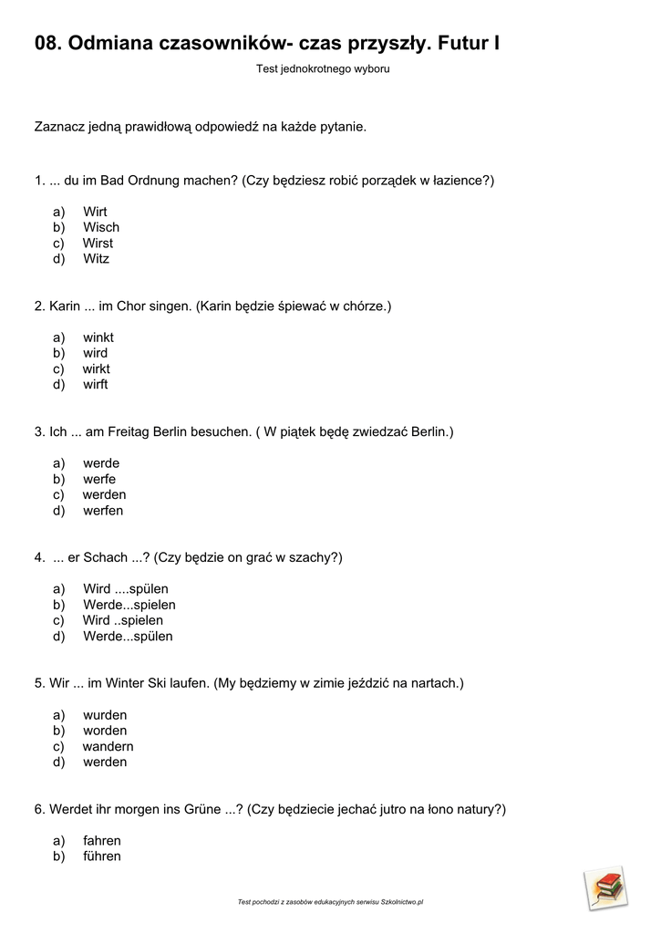 08. Odmiana czasowników- czas przyszły. Futur I Test jednokrotnego wyboru Zaznacz jedną prawidłową odpowiedź na każde pytanie. 1. ... du im Bad Ordnung machen? (Czy będziesz robić porządek w łazience?) a) b) c) d) Wirt Wisch Wirst Witz 2. Karin ... im Chor singen. (Karin będzie śpiewać w chórze.) a) b) c) d) winkt wird wirkt wirft 3. Ich ... am Freitag Berlin besuchen. ( W piątek będę zwiedzać Berlin.) a) b) c) d) werde werfe werden werfen 4. ... er Schach ...? (Czy będzie on grać w szachy?) a) b) c) d) Wird ....spülen Werde...spielen Wird ..spielen Werde...spülen 5. Wir ... im Winter Ski laufen. (My będziemy w zimie jeździć na nartach.) a) b) c) d) wurden worden wandern werden 6. Werdet ihr morgen ins Grüne ...? (Czy będziecie jechać jutro na łono natury?) a) b) fahren führen Test pochodzi z zasobów edukacyjnych serwisu Szkolnictwo.pl c) d) fechten folgen 7. ... Sie Schlittschuh laufen? (Czy będzie pani jeździć na łyżwach?) a) b) c) d) Welpen Werden Westen Werke 8. Ich ... bis spät am Computer .... (Ja będę pracować do późna na komputerze.) a) b) c) d) werdet...arbeiten werde ...abreisen werde...arbeiten werdet...abreisen 9. Er wird im Mai Geburtstag .... (On będzie w maju świętował urodziny.) a) b) c) d) feiern feigen feilen feinen 10. Du wirst morgen frische Luft .... (Ty będziesz jutro delektować się świeżym powietrzem.) a) b) c) d) genossen geniesst geniessen geniesse 11. Wir ... heute nicht die Suppe .... (My nie będziemy dzisiaj gotować zupy.) a) b) c) d) werden...kochen wirst....kochen werden...kommen wirst...kommen 12. Ihr ... nach Amerika Schiff fahren. (Wy popłyniecie statkiem do Ameryki.) a) b) c) d) wendet wessen werdet wertet 13. Im August werde ich im Meer .... (W sierpniu będę pływać w morzu.) Test pochodzi z zasobów edukacyjnych serwisu Szkolnictwo.pl a) b) c) d) schwitzen schwingen schwirren schwimmen 14. Wirst du die Orange ...? (Czy będziesz kroić pomarańczę?) a) b) c) d) schneiden schreiben schneien schnitzen 15. Wir werden heute .... (Będziemy się dzisiaj śmiać.) a) b) c) d) lassen laufen lachen lächeln Test pochodzi z zasobów edukacyjnych serwisu Szkolnictwo.pl
