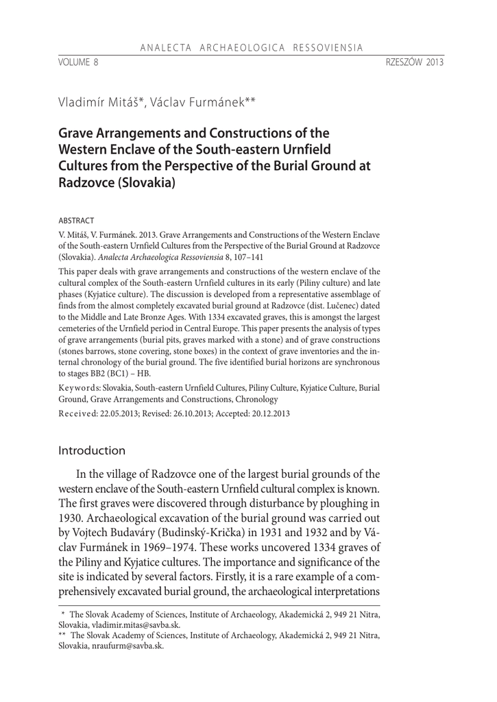 A N A L E C TA A R C H A E O L O G I C A R E S S O V I E N S I A VOLUME 8 Vladimír Mitáš*, Václav Furmánek** Grave Arrangements and Constructions of the Western Enclave of the South-eastern Urnfield Cultures from the Perspective of the Burial Ground at Radzovce (Slovakia) ABSTRACT V. Mitáš, V. Furmánek. 2013. Grave Arrangements and Constructions of the Western Enclave of the South-eastern Urnfield Cultures from the Perspective of the Burial Ground at Radzovce (Slovakia). Analecta Archaeologica Ressoviensia 8, 107–141 This paper deals with grave arrangements and constructions of the western enclave of the cultural complex of the South-eastern Urnfield cultures in its early (Piliny culture) and late phases (Kyjatice culture). The discussion is developed from a representative assemblage of finds from the almost completely excavated burial ground at Radzovce (dist. Lučenec) dated to the Middle and Late Bronze Ages. With 1334 excavated graves, this is amongst the largest cemeteries of the Urnfield period in Central Europe. This paper presents the analysis of types of grave arrangements (burial pits, graves marked with a stone) and of grave constructions (stones barrows, stone covering, stone boxes) in the context of grave inventories and the internal chronology of the burial ground. The five identified burial horizons are synchronous to stages BB2 (BC1) – HB. Keywords: Slovakia, South-eastern Urnfield Cultures, Piliny Culture, Kyjatice Culture, Burial Ground, Grave Arrangements and Constructions, Chronology Received: 22.05.2013; Revised: 26.10.2013; Accepted: 20.12.2013 Introduction In the village of Radzovce one of the largest burial grounds of the western enclave of the South-eastern Urnfield cultural complex is known. The first graves were discovered through disturbance by ploughing in 1930. Archaeological excavation of the burial ground was carried out by Vojtech Budaváry (Budinský-Krička) in 1931 and 1932 and by Václav Furmánek in 1969–1974. These works uncovered 1334 graves of the Piliny and Kyjatice cultures. The importance and significance of the site is indicated by several factors. Firstly, it is a rare example of a comprehensively excavated burial ground, the archaeological interpretations * The Slovak Academy of Sciences, Institute of Archaeology, Akademická 2, 949 21 Nitra, Slovakia, [email protected]. ** The Slovak Academy of Sciences, Institute of Archaeology, Akademická 2, 949 21 Nitra, Slovakia, [email protected]. RZESZÓW 2013 108 | Vladimír Mitáš, Václav Furmánek of which are supported by interdisciplinary support and cooperation, including from anthropology (Stloukal, Furmánek 1982; Furmánek, Stloukal 1985; 1986), archaeobotany (Hajnalová 1978a; 1978b) and archaeozoology (Ambros 1982). In addition, in 1978 and 1979 a contemporary settlement was partly uncovered (Furmánek 1990; 2010) adding further scientific value to the site, and also providing a comprehensive view of chronology, typology of finds, population dynamics and the demography of the micro-region and wider adjacent area. The location of the Urnfield Period site The township of Radzovce is located in the south of central Slovakia, in the Cerová Highland, in the basin of the Belina stream and its tributaries. The site lies on an important communication route connecting the Lučenec Basin and other areas in central Slovakia with the Zagyva river basin in present-day Hungary, along the Tisza region, and also with the entire Carpathian area from prehistoric times. The Urnfield settlement is situated about four kilometres from this communication route, probably enough to ensure that the settlement was a safe distance away from the route, which on the one hand mediated important contacts with outside areas, but also brought the treat of devastating raids. The investigated burial ground lies on the northern edge of the seclusion Monosa, in the valley of the Cerová Highlands; about 200 m north of the present-day course of the Monosa stream (Fig. 1). During the excavation it was shown that necropolis was located on the right side of a small former stream course which flowed into the Monosa stream on the right side. The valley where the burial ground and contemporary settlement were situated is protected from the north by the slopes of the Monosa hill (elevation 583.9 m) and Belina hill (500.4 m). To the south and south-east it was open. The burial ground was located on a gentle E‒W slope with an inclination of 6–8° to the south, at an altitude of 248.0 to 255.0 m. Main characteristics of the burial rite The detailed information from the Radzovce site, including it location and topography and the archaeological materials, provide an Grave Arrangements and Constructions of the Western Enclave of the South-eastern Urnfield Cultures… | 109 Fig. 1. Radzovce. A – localization of the burial ground, B – location of examined burial ground in Monosa (Monica) position on the base map (Photo V. Furmánek, map M. Bartík) Ryc. 1. Radzovce. A – położenie cmentarzyska, B – położenie badanego cmentarzyska w Monosa (Monica) na mapie bazowej (Zdjęcie V. Furmánek, mapa M. Bartík) 110 | Vladimír Mitáš, Václav Furmánek excellent basis for wider discussion of the burial rite of the Piliny and Kyjatice cultures (Furmánek, Mitáš 2010). For both these and consecutive cultures cremation was the characteristic burial rite. Burial grounds were usually situated on gentle hill slopes or on the foothills and always distinctly separated from contemporary settlements. At many sites, the spheres of the living and the dead were symbolically separated by a watercourse, usually a stream. These typical manifestations of spiritual notions of the Piliny and Kyjatice cultures also apply to Radzovce. The Piliny culture graves are most numerous, with less than 20% of graves belonging to the Kyjatice culture and about 2% of graves dated to the transitional Piliny-Kyjatice horizon. Some graves could not 