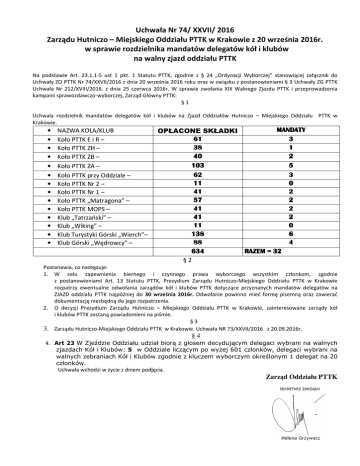 Uchwała Nr 74/ XXVII/ 2016 Zarządu Hutniczo – Miejskiego Oddziału PTTK w Krakowie z 20 września 2016r. w sprawie rozdzielnika mandatów delegatów kół i klubów na walny zjazd oddziału PTTK Na podstawie Art. 23.1.1-5 ust 1 pkt. 1 Statutu PTTK, zgodnie z § 24 „Ordynacji Wyborczej” stanowiącej załącznik do Uchwały ZO PTTK Nr 74/XXVII/2016 z dnia 20 września 2016 roku oraz w związku z postanowieniami § 3 Uchwały ZG PTTK Uchwała Nr 212/XVIII/2016. z dnia 25 czerwca 2016r. W sprawie zwołania XIX Walnego Zjazdu PTTK i przeprowadzenia kampanii sprawozdawczo-wyborczej, Zarząd Główny PTTK: §1 Uchwala rozdzielnik mandatów delegatów kół i klubów na Zjazd Oddziałów Hutniczo – Miejskiego Oddziału PTTK w Krakowie. • • • • • • • • • • • • • • NAZWA KOŁA/KLUB Koło PTTK E i R – Koło PTTK ZH – Koło PTTK ZB – Koło PTTK ZA – Koło PTTK przy Oddziale – Koło PTTK Nr 2 – Koło PTTK Nr 1 – Koło PTTK „Matragona” – Koło PTTK MOPS – Klub „Tatrzański” – Klub „Wiking” – Klub Turystyki Górski „Wierch”– Klub Górski „Wędrowcy” – MANDATY OPŁACONE SKŁADKI 61 3 38 1 40 2 103 5 103 62 3 11 0 41 2 57 2 41 2 41 2 11 0 138 6 138 88 4 634 RAZEM = 32 §2 Postanawia, co następuje: 1. W celu zapewnienia biernego i czynnego prawa wyborczego wszystkim członkom, zgodnie z postanowieniami Art. 13 Statutu PTTK, Prezydium Zarządu Hutniczo-Miejskiego Oddziału PTTK w Krakowie rozpatrzy ewentualne odwołania zarządów kół i klubów PTTK dotyczące przyznanych mandatów delegatów na ZJAZD oddziału PTTK najpóźniej do 30 września 2016r. Odwołanie powinno mieć formę pisemną oraz zawierać dokumentację niezbędną do jego rozpatrzenia. 2. O decyzji Prezydium Zarządu Hutniczo – Miejskiego Oddziału PTTK w Krakowie, zainteresowane zarządy kół i klubów PTTK zostaną powiadomieni na piśmie. §3 3. Zarządu Hutniczo-Miejskiego Oddziału PTTK w Krakowie. Uchwała NR 73/XXVII/2016 z 20.09.2016r. §4 4. Art 23 W Zjeździe Oddziału udział biorą z głosem decydującym delegaci wybrani na walnych zjazdach Kół i Klubów: 5 w Oddziale liczącym po wyżej 601 członków, delegaci wybrani na walnych zebraniach Kół i Klubów zgodnie z kluczem wyborczym określonym 1 delegat na 20 członków. Uchwała wchodzi w życie z dniem podjęcia. Zarząd Oddziału PTTK Po uzgodnieniu z Kołami i Klubami zrzeszonymi w Hutniczo-Miejskim Oddziale PTTK w Krakowie opłacalności składek członkowskich, przeprowadzono weryfikację przydzielonych mandatów dla delegatów na Walny Zjazd Oddziału. Wobec powyższego, zweryfikowana ilość delegatów na Walny Zjazd z poszczególnych Kół i Klubów zgodnie z Ordynacją Wyborczą, przedstawia się następująco: