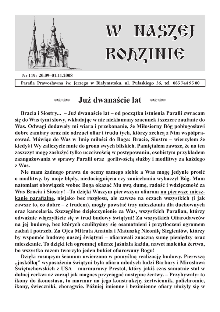 Nr 102; 119; 05.03. 20.09–01.11.2008 Nr – 15.04. 2006 Parafia Prawosławna św. Jerzego w Białymstoku, ul. Pułaskiego 36, tel. 085 744 95 00 •• Już dwanaście lat •• Bracia i Siostry... – Już dwanaście lat – od początku istnienia Parafii zwracam się do Was tymi słowy, wkładając w nie niekłamany szacunek i szczere zaufanie do Was. Odwagi dodawały mi wiara i przekonanie, że Miłosierny Bóg pobłogosławi dobre zamiary oraz nie odrzuci ofiar i trudu tych, którzy zechcą z Nim współpracować. Mówiąc do Was w Imię miłości do Boga: Bracie, Siostro – wierzyłem że kiedyś i Wy zaliczycie mnie do grona swych bliskich. Pamiętałem zawsze, że na ten zaszczyt mogę zasłużyć tylko uczciwością w postępowaniu, osobistym przykładem zaangażowania w sprawy Parafii oraz gorliwością służby i modlitwy za każdego z Was. Nie mam żadnego prawa do oceny samego siebie a Was mogę jedynie prosić o modlitwę, by moje błędy, niedociągnięcia czy zaniechania wybaczył Bóg. Mam natomiast obowiązek wobec Boga okazać Mu swą dumę, radość i wdzięczność za Was Bracia i Siostry! –To dzięki Waszym pierwszym ofiarom na pierwsze mieszkanie parafialne, niejako bez rozgłosu, ale zawsze na oczach wszystkich (i jak zawsze to, co dobre – z trudem), mogły powstać trzy mieszkania dla duchownych oraz kancelaria. Szczególne dziękczynienie za Was, wszystkich Parafian, którzy odważnie włączyliście się w trud budowy świątyni! Za wszystkich Ofiarodawców na jej budowę, bez których czulibyśmy się osamotnieni i przytłoczeni ogromem zadań i potrzeb. Za Ojca Mitrata Anatola i Matuszkę Nieoniłę Siegieniów, którzy by wspomóc budowę naszej świątyni – ofiarowali znaczną sumę pieniędzy oraz mieszkanie. To dzięki ich ogromnej ofierze jaśniała każda, nawet maleńka żertwa, bo wszystko razem tworzyło jeden bukiet ofiarowany Bogu! Dzięki rosnącym ścianom uwierzono w pomyślną realizację budowy. Pierwszą „jaskółką” wyposażenia świątyni była ofiara młodych ludzi Barbary i Mirosława Świętochowskich z USA – marmurowy Prestoł, który jakiś czas samotnie stał w dolnej cerkwi aż zaczął jak magnes przyciągać następne żertwy. – Przybywały: to ikony do ikonostasu, to marmur na jego konstrukcję, żertwiennik, polichromie, ikony, świeczniki, chorągwie. Później imienne i bezimienne ofiary ułożyły się w plastry blachy na kopułach. – Teraz, w blasku słońca jawią się niby świeca, lub jak ramka miodu wyjęta z ula, tyle że zamiast apetytu budzą to zachwyt to zazdrość naprzemian. Szczególnym pomnikiem jest południowo–wschodnia kopuła. Tam jak na karteczkach ale z blachy są zapisane imiona zmarłych: matuszki Leoniły, Krystyny, Nadziei oraz setek innych. – Przy tak radosnym, do nieba podniesionym pomianniku, smutno wyglądają nawet bogate grobowce czy kolumbaria z urnami na nowych cmentarzach. Krzyże na kopułach – to znowu żertwy. Jednak krzyże ustawione mniej tradycyjnie – teraz jakby ramionami obejmują świątynię i jak czterej Ewangeliści – każdej stronie świata dają świadectwo o Chrystusie i Jego Cerkwi! Prozaicznych drzwi, okien w dolnej cerkwi, nie wypada wspominać – one tak samoistnie zamknęły świątynię przed chłodem i nieżyczliwością. Ogrzewanie schowane pod podłogą nie afiszuje się swą obecnością jak by mówiąc: „Ja tylko stopy chronię przed chłodem. Serce modlitwą ogrzewaj.” Podobnie podłoga – skromnie przyjmuje okrycie z dywanów a nas pyta: „Co pościelisz pod nogi Chrystusowi, gdy przyjdzie tu wysłuchać twojej modlitwy?” Długi czas niepokoił nas brak dachu a później – nieporadność robotników montujących jego konstrukcję. Modlitwy i wstawiennictwo świętych sprawiły, że nowi, życzliwi fachowcy uporali się z problemami. Kolejna ekipa budziła zdumienie umiejętnie, szybko i dokładnie układając arkusze blachy. Latem zaskoczyła nas bryła cerkwi pozbawiona rusztowań. Teraz, gdy tynkarze odsłaniają kolejne już pokryte tynkiem ściany – ludzie pytają... o kolor! Biały, śnieżnobiały. Tak kochani Bracia i Siostry – dla wielu z Was, po dwunastu latach nadziei i niepewności; wiary i wahań; wyrzeczeń i trudów; po dziewięciu latach budowy – dane jest widzieć kształty docelowej, zewnętrznej bryły świątyni oraz radości modlitwy w dolnej cerkwi. To dar i zaszczyt dostępny dla niewielu! Mniej zauważalne ale o ileż jeszcze bardziej dostojne wobec Boga jest budowanie świątyni w naszych sercach! Gdy zaczynaliśmy – było nas 465 rodzin. Drugie tyle przybyło i nie tylko dlatego, że kupili tu sobie mieszkania. To Wy kupiliście ich dla Boga swym zaangażowaniem, ofiarnością, pracą w cerkwi i przy cerkwi, życzliwością, wiarą, modlitwą. Nikt z nas nie potrafi opisać radości nieba na widok dzieci czekające na Priczastije, ani tego, jak modlitwa dzieci pomaga ich rodzicom pokonywać codzienne trudności. Słuchając śpiewu dzieci i młodzieży nie sposób wyobrazić, że dwanaście lat temu nie było komu śpiewać podczas nabożeństw! Kto wtedy mógł marzyć o trzech chórach?! Nieśmiało zaznacza swe istnienie Bractwo. Wielu myśli, że Panie przychodzą „tylko” sprzątać. Niewielu zauważyło, że pierwsze pielgrzymki z naszej Parafii do Grabarki, Sak, Jabłeczna, Poczajewa zorganizowały Bratczycy! To ich staraniem powstało tłumaczenie i ukazał się drukiem Akafist do św. Gieorgija. To ich staraniem wydano Akafist za Zmarłych! To oni z zakolędowanych sum kupili do cerkwi materiały budowlane, ikony, Ewangelię, szaty liturgiczne. Kilkunastu zapaleńców oczekuje nowych ludzi. Gdy wszyscy docenią ich trud i zrozumieją ich intencje, to potrafią zrozumieć i to, że sprzątanie w cerkwi to tylko pokorne, dokonane rękoma a nie językiem stwierdzenie: „Nie wstydzę się czynić dobra dla chwały Domu Bożego.” oraz: „Chcę, by ofiary ludzi zawsze były piękne w 