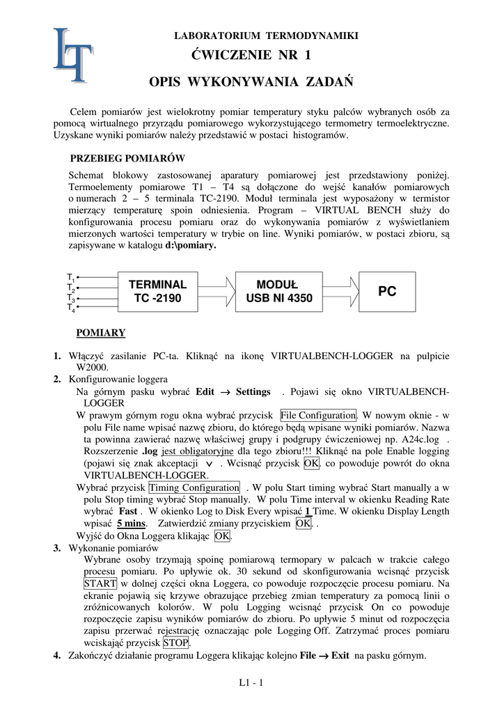 LABORATORIUM TERMODYNAMIKI WICZENIE NR 1 OPIS WYKONYWANIA ZADA Celem pomiarów jest wielokrotny pomiar temperatury styku palców wybranych osób za pomoc wirtualnego przyrz du pomiarowego wykorzystuj cego termometry termoelektryczne. Uzyskane wyniki pomiarów nale y przedstawi w postaci histogramów. PRZEBIEG POMIARÓW Schemat blokowy zastosowanej aparatury pomiarowej jest przedstawiony poni ej. Termoelementy pomiarowe T1 – T4 s doł czone do wej kanałów pomiarowych o numerach 2 – 5 terminala TC-2190. Moduł terminala jest wyposa ony w termistor mierz cy temperatur spoin odniesienia. Program – VIRTUAL BENCH słu y do konfigurowania procesu pomiaru oraz do wykonywania pomiarów z wy wietlaniem mierzonych warto ci temperatury w trybie on line. Wyniki pomiarów, w postaci zbioru, s zapisywane w katalogu d:\pomiary. T1 T2 T3 T4 TERMINAL TC -2190 MODUŁ USB NI 4350 PC POMIARY 1. Wł czy zasilanie PC-ta. Klikn na ikon VIRTUALBENCH-LOGGER na pulpicie W2000. 2. Konfigurowanie loggera Na górnym pasku wybra Edit → Settings . Pojawi si okno VIRTUALBENCHLOGGER W prawym górnym rogu okna wybra przycisk File Configuration. W nowym oknie - w polu File name wpisa nazw zbioru, do którego b d wpisane wyniki pomiarów. Nazwa ta powinna zawiera nazw wła ciwej grupy i podgrupy wiczeniowej np. A24c.log . Rozszerzenie .log jest obligatoryjne dla tego zbioru!!! Klikn na pole Enable logging (pojawi si znak akceptacji ∨ . Wcisn przycisk OK. co powoduje powrót do okna VIRTUALBENCH-LOGGER. Wybra przycisk Timing Configuration . W polu Start timing wybra Start manually a w polu Stop timing wybra Stop manually. W polu Time interval w okienku Reading Rate wybra Fast . W okienko Log to Disk Every wpisa 1 Time. W okienku Display Length wpisa 5 mins. Zatwierdzi zmiany przyciskiem OK. . Wyj do Okna Loggera klikaj c OK. 3. Wykonanie pomiarów Wybrane osoby trzymaj spoin pomiarow termopary w palcach w trakcie całego procesu pomiaru. Po upływie ok. 30 sekund od skonfigurowania wcisn przycisk START w dolnej cz ci okna Loggera, co powoduje rozpocz cie procesu pomiaru. Na ekranie pojawi si krzywe obrazuj ce przebieg zmian temperatury za pomoc linii o zró nicowanych kolorów. W polu Logging wcisn przycisk On co powoduje rozpocz cie zapisu wyników pomiarów do zbioru. Po upływie 5 minut od rozpocz cia zapisu przerwa rejestracj oznaczaj c pole Logging Off. Zatrzyma proces pomiaru wciskaj przycisk STOP. 4. Zako czy działanie programu Loggera klikaj c kolejno File → Exit na pasku górnym. L1 - 1 LABORATORIUM TERMODYNAMIKI WICZENIE NR 1 OPRACOWANIE WYNIKÓW 5. Zbiór wyników pomiarów jest zapisany jako zbiór tekstowy. Nale y wczyta go do EXCELA. Pomin kilkana cie pierwszych wierszy zbioru pozostawiaj c wył cznie wiersze ze zmierzonymi warto ciami temperatury bez wcze niejszych nagłówków. 6. Dla punktów pomiarowych T1 do T4 (odpowiadaj kolumnom zbioru) opracowa wyniki pomiarów w postaci histogramu oddzielnego dla ka dego punktu. Przy opracowaniu wyników post powa wg algorytmu – punkty 4 – 7 7. Okre li minimaln Tmin i maksymaln Tmax warto temperatury. Obliczy długo przedziału zmian temperatury ∆T= Tmax-Tmin. Obliczy długo lokalnych przedziałów zmian temperatury dziel c zakres zmian ∆T na siedem równych cz ci δT=∆T/7. 8. Okre li warto ci graniczne dla siedmiu lokalnych przedziałów δu(i) zmian napi cia jako 9. Tmin(i)=Tmin+(i-1)* δT oraz Tmax(i)= Tmin+i*δT gdzie i=1,2 ..7 10. Dla ka dego lokalnego przedziału okre li liczb ki pomiarów, których warto zmierzona zawiera si w danym przedziale. Obliczy cz sto wyst powania Fi poprzez podzielenie liczby pomiarów ki przez całkowit liczb pomiarów N=120 wg zale no ci Fi=ki / N 11. Wykre li zale no Fi w funkcji numeru przedziału w formie wykresu słupkowego w edytorze wykresów np. Excel . SPRAWOZDANIE W sprawozdaniu przedstawi tablic cz sto ci Fi oraz rysunek histogramu dla ka dego termoelementu. W tablicy wyników (i ew. na histogramie) poda graniczne warto ci temperatury dla poszczególnych przedziałów. NA ZAJ CIA PRZYNIE SPRAWN DYSKIETK L1 - 2 FD 1,44 MB lub PENDRIVE