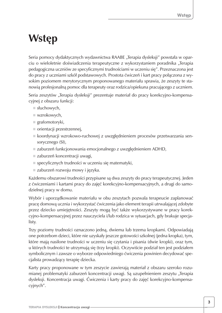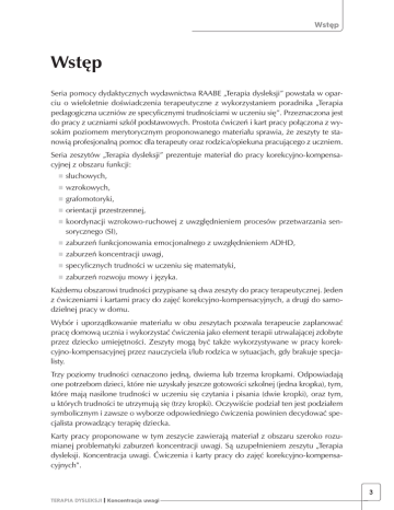 Wstęp Wstęp Seria pomocy dydaktycznych wydawnictwa RAABE „Terapia dysleksji” powstała w oparciu o wieloletnie doświadczenia terapeutyczne z wykorzystaniem poradnika „Terapia pedagogiczna uczniów ze specyficznymi trudnościami w uczeniu się”. Przeznaczona jest do pracy z uczniami szkół podstawowych. Prostota ćwiczeń i kart pracy połączona z wysokim poziomem merytorycznym proponowanego materiału sprawia, że zeszyty te stanowią profesjonalną pomoc dla terapeuty oraz rodzica/opiekuna pracującego z uczniem. Seria zeszytów „Terapia dysleksji” prezentuje materiał do pracy korekcyjno-kompensacyjnej z obszaru funkcji: słuchowych, wzrokowych, grafomotoryki, orientacji przestrzennej, koordynacji wzrokowo-ruchowej z uwzględnieniem procesów przetwarzania sensorycznego (SI), zaburzeń funkcjonowania emocjonalnego z uwzględnieniem ADHD, zaburzeń koncentracji uwagi, specyficznych trudności w uczeniu się matematyki, zaburzeń rozwoju mowy i języka. Każdemu obszarowi trudności przypisane są dwa zeszyty do pracy terapeutycznej. Jeden z ćwiczeniami i kartami pracy do zajęć korekcyjno-kompensacyjnych, a drugi do samodzielnej pracy w domu. Wybór i uporządkowanie materiału w obu zeszytach pozwala terapeucie zaplanować pracę domową ucznia i wykorzystać ćwiczenia jako element terapii utrwalającej zdobyte przez dziecko umiejętności. Zeszyty mogą być także wykorzystywane w pracy korekcyjno-kompensacyjnej przez nauczyciela i/lub rodzica w sytuacjach, gdy brakuje specjalisty. Trzy poziomy trudności oznaczono jedną, dwiema lub trzema kropkami. Odpowiadają one potrzebom dzieci, które nie uzyskały jeszcze gotowości szkolnej (jedna kropka), tym, które mają nasilone trudności w uczeniu się czytania i pisania (dwie kropki), oraz tym, u których trudności te utrzymują się (trzy kropki). Oczywiście podział ten jest podziałem symbolicznym i zawsze o wyborze odpowiedniego ćwiczenia powinien decydować specjalista prowadzący terapię dziecka. Karty pracy proponowane w tym zeszycie zawierają materiał z obszaru szeroko rozumianej problematyki zaburzeń koncentracji uwagi. Są uzupełnieniem zeszytu „Terapia dysleksji. Koncentracja uwagi. Ćwiczenia i karty pracy do zajęć korekcyjno-kompensacyjnych”. 3 TERAPIA DYSLEKSJI | Koncentracja uwagi Wstęp Obydwa zeszyty zawierają niezbędne treści do wykorzystania w treningu zaburzeń koncentracji uwagi uczniów ze specyficznymi trudnościami w uczeniu się ze szczególnym uwzględnieniem uczniów z dysleksją rozwojową. Uczniom, ich rodzicom, nauczycielom oraz terapeutom korzystającym z naszych zeszytów życzę wielu sukcesów oraz satysfakcji z pokonywania trudności. Irena Sosin 4 TERAPIA DYSLEKSJI | Koncentracja uwagi Karty do samodzielnej pracy w domu Łańcuch sylabowy imię i nazwisko 1 Uzupełnij łańcuch sylabowy tak, aby ostatnia sylaba w wyrazie była jednocześnie pierwszą następnego wyrazu. Mama – mata – tata – tama – masa – sa Domino – notesy – syfony – ny Paleta – 2 Napisz wszystkie wyrazy z łańcucha sylabowego, zachowując odpowiednią kolejność. 50 TERAPIA DYSLEKSJI | Koncentracja uwagi Karty do samodzielnej pracy w domu Łańcuch sylabowy, cd. imię i nazwisko 3 Przekreśl wyrazy, które nie pasują do pozostałych, a następnie zapisz wszystkie wy- razy w kolejności alfabetycznej. latawiec, drewno, lis, pejzaż, fruwa, ogórek czyta, pisze, rysuje, chodzi, pracuje, rysunek, pisany róża, tulipan, berberys, stokrotka, chaber, różny, mak niebieski, różany, brązowy, krzaczasty, spragniony, kwiatowy, różny szybko, śmiało, nieprawda, niewiele, ładnie, odmiennie, słabo sportowiec, piłka, narty, piła, chodzenie, spacerował, bieg, bieganie 51 TERAPIA DYSLEKSJI | Koncentracja uwagi