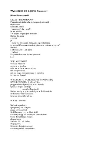 Wycieczka do Egiptu Fragmenty Miron Białoszewski SZCZYT PIRAMIDOWY Pięćdziesiąt siedem lat jechałem do piramid dojeżdżam karuzela, krzyk - bakszysz!! da – waj!!! ja we wściek - w dupie! to grzdyle! nie dam Halina do mnie - ćććsiii ja - zaraz mi przejdzie, patrz, jak się podchodzi, to pochył Cheopsa stromieje pionowo, zeskok, słyszysz? Halina! I z tłoku Arab – jak echo - Halina! Przytaknąłem mu, już mi przeszło [...] WIE! WIE! WIJE! wiek za wiekiem mrowie w środku mija się w dwie strony, dyszy tak chcą widzieć jak nie trupa zamienionego w zabytek to chociaż futerał W KOŃCU TO WCHODZENIE W PIRAMIDĘ SZNURECZKIEM Z MIJANKĄ przypomina mi przejście przez kanały tylko że to jest tamtego na pół odwrotność Halina wtedy w powstanie była w Śródmieściu do kanałów nie wchodziła teraz do piramidy też nie POCZET MUMII Na końcu podróży spotykamy ich samych przez szyby gablot Seti II czarny łysy w białą kość szczerzy stopy malowanymi paznokciami buzia do lekkiego chrapu długogłowy Ramzes III i tak ładny długogłowy Seknenre fioletowoczarny szczerzy poliki, zęby dobre ciemny blondyn czy szatyn? długogłowy Seti I czarniuni spokojniuni jak rzeźba długogłowy Amenhotep IV, aha, siwy na gębie, brunet bardzo długa głowa w tył bardzo odchylona — — — — — — — — — — baby kopiaste Herhorowa Sitkamosowa zęby na bok Nefertari Achmosowa pół zębów, czarny grymas — co się zrobiło z tej kobiety ciężko umierała? — — — — — — — — — — hm zlecieliśmy się i się rozlecimy. zaglądam do moich bananów pod łóżko — co za wielki purpurowy chrząszcz, ukrył się?... Pan Zbysław na to — święty, on chciał panu coś powiedzieć ale co? ci co mogą powiedzieć, nie mają co a ci co mają co, nie mają jak (z tomu Rozkurz 1980)