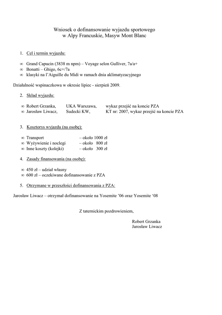 Wniosek o dofinansowanie wyjazdu sportowego w Alpy Francuskie, Masyw Mont Blanc 1. Cel i termin wyjazdu: • Grand Capucin (3838 m npm) – Voyage selon Gulliver, 7a/a+ • Bonatti – Ghigo, 6c+/7a • klasyki na l’Aiguille du Midi w ramach dnia aklimatyzacyjnego Działalność wspinaczkowa w okresie lipiec - sierpień 2009. 2. Skład wyjazdu: • Robert Grzanka, • Jarosław Liwacz, UKA Warszawa, Sudecki KW, wykaz przejść na koncie PZA KT nr: 2007, wykaz przejść na koncie PZA 3. Kosztorys wyjazdu (na osobę): • Transport • Wyżywienie i noclegi • Inne koszty (kolejki) – około 1000 zł – około 800 zł – około 300 zł 4. Zasady finansowania (na osobę): • 450 zł – udział własny • 600 zł – oczekiwane dofinansowanie z PZA 5. Otrzymane w przeszłości dofinansowania z PZA: Jarosław Liwacz – otrzymał dofinansowanie na Yosemite ’06 oraz Yosemite ‘08 Z taternickim pozdrowieniem, Robert Grzanka Jarosław Liwacz