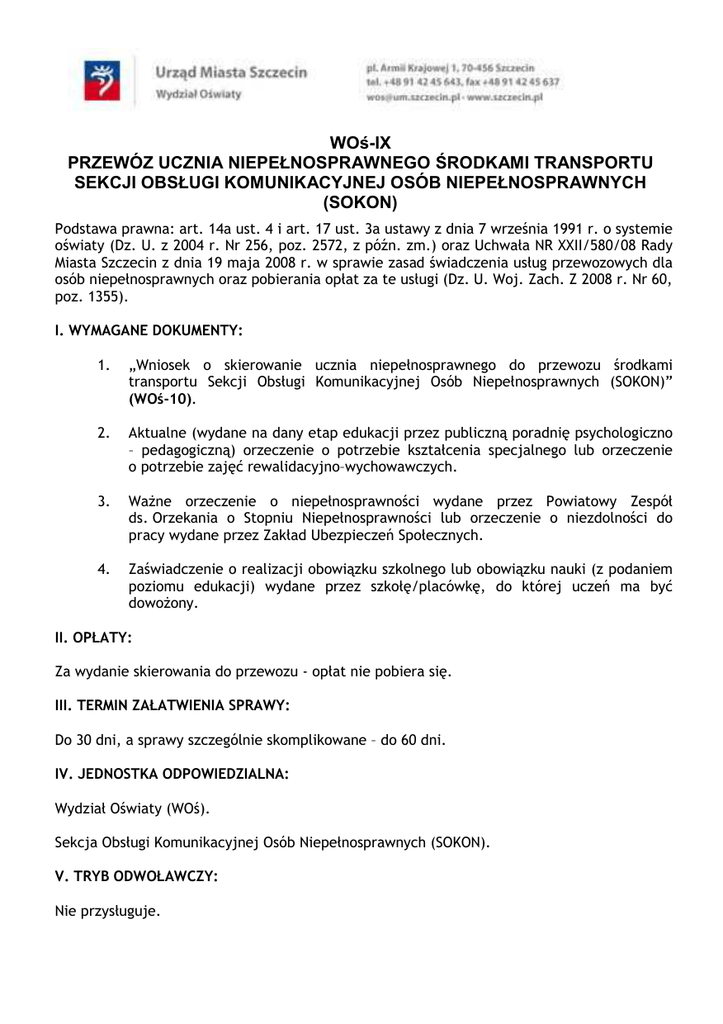 WOś-IX PRZEWÓZ UCZNIA NIEPEŁNOSPRAWNEGO ŚRODKAMI TRANSPORTU SEKCJI OBSŁUGI KOMUNIKACYJNEJ OSÓB NIEPEŁNOSPRAWNYCH (SOKON) Podstawa prawna: art. 14a ust. 4 i art. 17 ust. 3a ustawy z dnia 7 września 1991 r. o systemie oświaty (Dz. U. z 2004 r. Nr 256, poz. 2572, z późn. zm.) oraz Uchwała NR XXII/580/08 Rady Miasta Szczecin z dnia 19 maja 2008 r. w sprawie zasad świadczenia usług przewozowych dla osób niepełnosprawnych oraz pobierania opłat za te usługi (Dz. U. Woj. Zach. Z 2008 r. Nr 60, poz. 1355). I. WYMAGANE DOKUMENTY: 1. „Wniosek o skierowanie ucznia niepełnosprawnego do przewozu środkami transportu Sekcji Obsługi Komunikacyjnej Osób Niepełnosprawnych (SOKON)” (WOś-10). 2. Aktualne (wydane na dany etap edukacji przez publiczną poradnię psychologiczno – pedagogiczną) orzeczenie o potrzebie kształcenia specjalnego lub orzeczenie o potrzebie zajęć rewalidacyjno–wychowawczych. 3. WaŜne orzeczenie o niepełnosprawności wydane przez Powiatowy Zespół ds. Orzekania o Stopniu Niepełnosprawności lub orzeczenie o niezdolności do pracy wydane przez Zakład Ubezpieczeń Społecznych. 4. Zaświadczenie o realizacji obowiązku szkolnego lub obowiązku nauki (z podaniem poziomu edukacji) wydane przez szkołę/placówkę, do której uczeń ma być dowoŜony. II. OPŁATY: Za wydanie skierowania do przewozu - opłat nie pobiera się. III. TERMIN ZAŁATWIENIA SPRAWY: Do 30 dni, a sprawy szczególnie skomplikowane – do 60 dni. IV. JEDNOSTKA ODPOWIEDZIALNA: Wydział Oświaty (WOś). Sekcja Obsługi Komunikacyjnej Osób Niepełnosprawnych (SOKON). V. TRYB ODWOŁAWCZY: Nie przysługuje. VI. UWAGI: 1. Przewóz uczniów niepełnosprawnych, zakwalifikowanych przez Komisję powoływaną przy Sekcji Obsługi Komunikacyjnej Osób Niepełnosprawnych (SOKON), na podstawie „Skierowania do przewozu” wydanego przez Wydział Oświaty, organizuje Miejski Ośrodek Pomocy Rodzinie w Szczecinie – SOKON. 2. Przewóz odbywa się na terenie Miasta Szczecin, a w uzasadnionych przypadkach równieŜ poza jego obszarem. 3. Na wniosek rodzica, do przewozu środkami transportu SOKON, kierowani są uprawnieni uczniowie niepełnosprawni, którzy: o są zameldowani na terenie Miasta Szczecin; o posiadają waŜne orzeczenie o niepełnosprawności wydane przez Powiatowy Zespół ds. Orzekania o Stopniu Niepełnosprawności lub orzeczenie o niezdolności do pracy wydane przez Zakład Ubezpieczeń Społecznych; o nie są w stanie korzystać z przewozów wykonywanych pojazdami komunikacji miejskiej (ze względu na rodzaj niepełnosprawności): o a) poruszający się na wózkach inwalidzkich, o b) z autyzmem, o c) niewidomi bez opiekuna; o są objęci kształceniem specjalnym na podstawie wydanego przez publiczną poradnię psychologiczno–pedagogiczną orzeczenia o potrzebie kształcenia specjalnego lub są objęci zajęciami rewalidacyjno–wychowawczymi na podstawie wydanego przez publiczną poradnię psychologiczno–pedagogiczną orzeczenia o potrzebie zajęć rewalidacyjno – wychowawczych. 4. Uczniowie z innymi (niŜ wymienione powyŜej) niepełnosprawnościami mogą korzystać z przewozu środkami transportu SOKON jedynie w szczególnych przypadkach - w razie istniejących moŜliwości przewozowych, jeŜeli nie będą za tym stały przeszkody organizacyjne i ekonomiczne. 5. Przewozy środkami transportu SOKON realizowane są odpłatnie (w ramach miesięcznego abonamentu), z wyjątkiem uczniów niepełnosprawnych, którzy uczęszczają odpowiednio do przedszkola, szkoły podstawowej lub gimnazjum (uczniowie z niepełnosprawnością ruchową, takŜe do najbliŜszej szkoły ponadgimnazjalnej), albo placówki - najbliŜszej miejscu zamieszkania. Opłaty za przewóz pobiera się zgodnie z Zasadami świadczenia usług przewozowych dla osób niepełnosprawnych oraz pobierania opłat za te usługi określonymi w Załączniku do Uchwały NR XXII/580/08 Rady Miasta Szczecin z dnia 19 maja 2008 r. 6. Skierowanie do przewozu środkami transportu SOKON wydaje się na okres jednego roku szkolnego. 7. Sprawa załatwiana jest w dwóch etapach: 8. I etap – „Skierowanie do przewozu SOKON” - WOś - w terminie do 30 dni, a w sprawach szczególnie skomplikowanych do 60 dni. Ze względu na konieczność organizacji przewozu na dzień rozpoczęcia roku szkolnego (1 września), kompletne wnioski winny wpłynąć do Urzędu Miasta Szczecin po zakończeniu zajęć dydaktycznych bieŜącego roku szkolnego - nie później, niŜ do dnia 31 lipca. 9. II etap – „Kwalifikacja i organizacja przewozu” - SOKON MOPR - w terminie do 30 dni, a w sprawach szczególnie skomplikowanych do 60 dni, jednak w przypadku wniosków dotyczących kolejnego roku szkolnego (złoŜonych po zakończeniu zajęć dydaktycznych bieŜącego roku szkolnego, nie później, niŜ do dnia 31 lipca) - nie później, niŜ do dnia 31 sierpnia. 10. Wnioski składane po 31 lipca, lub w czasie trwania roku szkolnego rozpatrywane są w miarę istniejących moŜliwości przewozowych – w terminie do 30 dni, a w sprawach szczególnie skomplikowanych do 60 dni.