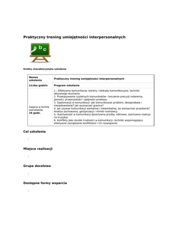 Praktyczny trening umiejętności interpersonalnych Krótka charakterystyka szkolenia Nazwa szkolenia Praktyczny trening umiejętności interpersonalnych Liczba godzin Program szkolenia Zajęcia w formie warsztatów 16 godz. 1 . Efektywna komunikacja- bariery i blokady komunikacyjne, techniki aktywnego słuchania 2. Przekazywanie czytelnych komunikatów- ćwiczenie precyzji mówienia, jasności, przejrzystości i spójności przekazu 3. Dyplomacja w komunikacji- Jak komunikować problem, dezaprobatę i niezadowolenie? Jak wyznaczać granice? 4. Jak używać komunikacji werbalnej i niewerbalnej, by wzmacniać przesłanie? Analiza zachowania, gestykulacji i mimiki rozmówcy 5. Asertywność w komunikacji (asertywna prośba, odmowa, asertywna reakcja na krytykę) 6. Konflikty jako skutek trudności w komunikacji- techniki wspomagające efektywne zarządzanie konfliktami i ich rozwiązanie Cel szkolenia : Miejsce realizacji : Grupa docelowa : Dostępne formy wsparcia :