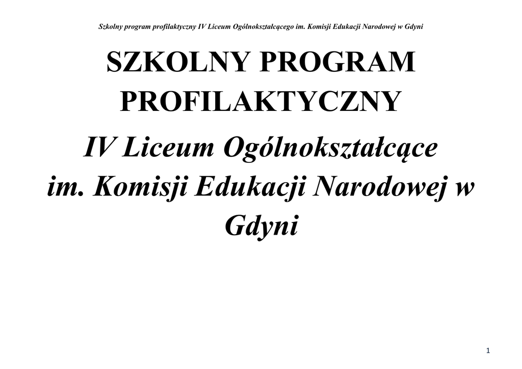 Szkolny program profilaktyczny IV Liceum Ogólnokształcącego im. Komisji Edukacji Narodowej w Gdyni SZKOLNY PROGRAM PROFILAKTYCZNY IV Liceum Ogólnokształcące im. Komisji Edukacji Narodowej w Gdyni 1 Szkolny program profilaktyczny IV Liceum Ogólnokształcącego im. Komisji Edukacji Narodowej w Gdyni Spis treści: 1. Wprowadzenie 2. Podstawy prawne działań profilaktycznych podejmowanych w szkole 3. Założenia programu 4. Zakres działań i cele programu 5. Adresaci programu profilaktyki i treści do nich skierowane 6. Zadania do realizacji/harmonogram działań. 2 Szkolny program profilaktyczny IV Liceum Ogólnokształcącego im. Komisji Edukacji Narodowej w Gdyni Ad.1. Wprowadzenie Działania profilaktyczne prowadzone w szkole obejmują przede wszystkim ochronę młodzieży przed różnymi zagrożeniami poprzez akcje wychowawczo – profilaktyczne oraz wczesne reagowanie w sytuacjach rozpoznawania prób podejmowania ryzykownych zachowań, które niosą zagrożenie negatywnych konsekwencji zarówno dla zdrowia fizycznego i psychicznego jednostki, jak i dla jej otoczenia społecznego. Do najczęstszych zachowań ryzykownych podejmowanych przez młodzież możemy zaliczyć: palenie tytoniu, używanie alkoholu, próbowanie i zażywanie środków psychoaktywnych, zachowania agresywne i przestępcze oraz wczesną aktywność seksualną. Przyczyną występowania ww. zachowań może być niewydolność wychowawcza i ekonomiczna rodzin, rozpad tradycyjnych więzi emocjonalnych, słaba odporność psychiczna młodzieży i dorosłych – w takich wypadkach działania pomocowe należy skierować do całej rodziny. W związku z powyższym, założeniem szkolnego programu profilaktyki jest wyposażenie uczniów w niezbędną wiedzę na temat zdrowego rozwoju, stworzenie warunków bezpiecznego funkcjonowania szkoły i monitorowanie skuteczności podjętych działań. Program profilaktyczny IV Liceum Ogólnokształcącego im. Komisji Edukacji Narodowej w Gdyni kieruje się potrzebami rozwojowymi uczniów. Jest to proces wspierania oraz przeciwdziałania czynnikom zagrażającym uczniom. Działania te odnoszą się do profilaktyki pierwszego i drugiego stopnia. Szkolny program profilaktyki obejmuje profilaktykę pierwszorzędową skoordynowaną z działaniami wychowawczymi, której adresatem jest całe środowisko szkolne oraz profilaktykę drugorzędową skierowaną do uczniów o najwyższym stopniu ryzyka dysfunkcyjności, pomagając im w jego redukcji. Powiązany jest ze statutem i program wychowawczym szkoły. Oparty został również o przepisy prawne i obejmuje całą społeczność szkolną tzn. uczniów, nauczycieli i rodziców. Jego realizacja spoczywa na pedagogu i psychologu szkolnym, wszystkich nauczycielach i wychowawcach, przy współpracy z rodzicami oraz specjalistami z Poradni Psychologiczno – Pedagogicznej, jak i innymi instytucjami działającymi na rzecz dzieci i rodziny. 3 Szkolny program profilaktyczny IV Liceum Ogólnokształcącego im. Komisji Edukacji Narodowej w Gdyni Ad.2. Podstawy prawne działań profilaktycznych podejmowanych w szkole. 1. Konstytucja RP - Art. 72.; 2. Konwencja o Prawach Dziecka – Art. 3, 19, 33.; 3. Krajowy Program Przeciwdziałania Przemocy w Rodzinie; 4. Narodowy Program Zdrowia na lata 2007-2015; 5. Rozporządzenie Ministra Edukacji Narodowej i Sportu z dnia 26 lutego 2002 r. w sprawie podstawy programowej wychowania przedszkolnego oraz kształcenia ogólnego w poszczególnych typach szkół z późniejszymi zmianami (Dz. U. Nr 51, poz. 458); 6. Rozporządzenie Ministra Edukacji Narodowej z dnia 21 maja 2001 roku w sprawie ramowych statutów publicznego przedszkola oraz publicznych szkół (Dz. U. Nr 61 z 19 czerwca 2001r.; poz. 624); 7. Rozporządzenie Ministra Edukacji Narodowej i Sportu z dnia 31stycznia 2002 r. zmieniające rozporządzenie w sprawie ramowych statutów publicznego przedszkola oraz publicznych szkół (§ 2, ust. 1, pkt.1); 8. Rozporządzenie Ministra Edukacji i Sportu z dnia 31 stycznia 2003 r. w sprawie szczegółowych form działalności wychowawczej i zapobiegawczej wśród dzieci i młodzieży zagrożonych uzależnieniem. (Dz. U. z 2003 r. Nr 26, poz. 226); 9. Rozporządzenie Ministra Edukacji Narodowej z dania 15 stycznia 2001 r. w sprawie udzielania i organizacji pomocy psychologicznopedagogicznej w publicznych przedszkolach, szkoła i placówkach (Dz. U. Nr 13, poz.109); 10. Rozporządzenie Ministra Edukacji Narodowej z dnia 29 marca 1986 r. w sprawie odrębnych form działalności profilaktycznowychowawczej dla młodzieży zagrożonej uzależnieniami (Dz. U. Nr 19, poz. 100); 11. Ustawa o ochronie zdrowia psychicznego z dnia 19 sierpnia1994 r.( Dz. U. 1994 Nr 111 poz. 535); 12. Ustawa z dnia 26 października 1982 r. o wychowaniu w trzeźwości i przeciwdziałaniu alkoholizmowi. (Dz. U. 1982 Nr 35 poz. 230); 13. Ustawa z dnia 29 lipca 2005 r. o przeciwdziałaniu narkomanii. (Dz. U. 2005 nr 179, poz. 1485); 4 Szkolny program profilaktyczny IV Liceum Ogólnokształcącego im. Komisji Edukacji Narodowej w Gdyni 14. Ustawa z dnia 9 listopada 1995 r. o ochronie zdrowia przed następstwami używania tytoniu i wyrobów tytoniowych. (Dz. U. 1996, Nr 10, poz. 55 z późn. zm.). 15. Ustawa z dnia 29 lipca 2005 r. o przeciwdziałaniu przemocy w rodzinie (Dz. U. Nr 180, poz. 1493 ) 5 Szkolny program profilaktyczny IV Liceum Ogólnokształcącego im. Komisji Edukacji Narodowej w Gdyni Ad. 3. Założenia programu. Głównym założeniem szkolnego programu profilaktyki realizowanego na terenie IV Liceum Ogólnokształcącego im. Komisji Edukacji Narodowej w Gdyni jest wyposażenie uczniów w niezbędną wiedzę dotyczącą przede wszystkim zdrowego rozwoju jednostki oraz stworzeniu warunków bezpiecznego funkcjonowania szkoły. W związku z powyższym, działania podejmowane w ramach programu obejmują: a) tworzenie Szkolnego Programu Profilaktyki w oparciu o diagnozę potrzeb uczniów, ich problemów, możliwości oraz uwarunkowa