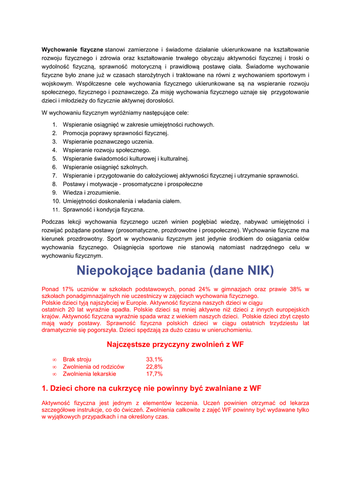 Wychowanie fizyczne stanowi zamierzone i świadome działanie ukierunkowane na kształtowanie rozwoju fizycznego i zdrowia oraz kształtowanie trwałego obyczaju aktywności fizycznej i troski o wydolność fizyczną, sprawność motoryczną i prawidłową postawę ciała. Świadome wychowanie fizyczne było znane już w czasach starożytnych i traktowane na równi z wychowaniem sportowym i wojskowym. Współczesne cele wychowania fizycznego ukierunkowane są na wspieranie rozwoju społecznego, fizycznego i poznawczego. Za misję wychowania fizycznego uznaje się przygotowanie dzieci i młodzieży do fizycznie aktywnej dorosłości. W wychowaniu fizycznym wyróżniamy następujące cele: 1. 2. 3. 4. 5. 6. 7. 8. 9. 10. Wspieranie osiągnięć w zakresie umiejętności ruchowych. Promocja poprawy sprawności fizycznej. Wspieranie poznawczego uczenia. Wspieranie rozwoju społecznego. Wspieranie świadomości kulturowej i kulturalnej. Wspieranie osiągnięć szkolnych. Wspieranie i przygotowanie do całożyciowej aktywności fizycznej i utrzymanie sprawności. Postawy i motywacje - prosomatyczne i prospołeczne Wiedza i zrozumienie. Umiejętności doskonalenia i władania ciałem. 11. Sprawność i kondycja fizyczna. Podczas lekcji wychowania fizycznego uczeń winien pogłębiać wiedzę, nabywać umiejętności i rozwijać pożądane postawy (prosomatyczne, prozdrowotne i prospołeczne). Wychowanie fizyczne ma kierunek prozdrowotny. Sport w wychowaniu fizycznym jest jedynie środkiem do osiągania celów wychowania fizycznego. Osiągnięcia sportowe nie stanowią natomiast nadrzędnego celu w wychowaniu fizycznym. Niepokojące badania (dane NIK) Ponad 17% uczniów w szkołach podstawowych, ponad 24% w gimnazjach oraz prawie 38% w szkołach ponadgimnazjalnych nie uczestniczy w zajęciach wychowania fizycznego. Polskie dzieci tyją najszybciej w Europie. Aktywność fizyczna naszych dzieci w ciągu ostatnich 20 lat wyraźnie spadła. Polskie dzieci są mniej aktywne niż dzieci z innych europejskich krajów. Aktywność fizyczna wyraźnie spada wraz z wiekiem naszych dzieci. Polskie dzieci zbyt często mają wady postawy. Sprawność fizyczna polskich dzieci w ciągu ostatnich trzydziestu lat dramatycznie się pogorszyła. Dzieci spędzają za dużo czasu w unieruchomieniu. Najczęstsze przyczyny zwolnień z WF • • • Brak stroju Zwolnienia od rodziców Zwolnienia lekarskie 33,1% 22,8% 17,7% 1. Dzieci chore na cukrzycę nie powinny być zwalniane z WF Aktywność fizyczna jest jednym z elementów leczenia. Uczeń powinien otrzymać od lekarza szczegółowe instrukcje, co do ćwiczeń. Zwolnienia całkowite z zajęć WF powinny być wydawane tylko w wyjątkowych przypadkach i na określony czas. 2. Dzieci chore na boczne skrzywienie kręgosłupa I stopnia nie powinny być zwalniane z WF Wskazana jest zwiększona aktywność fizyczna ze szczególnym zwróceniem uwagi na wzmocnienie mięśni kręgosłupa i ćwiczenia oddechowe, indywidualne ćwiczenia korekcyjne, wskazane pływanie. Wskazane: ograniczenie biegów, długich marszów, długotrwałych gier sportowych. Wyeliminowanie skoków, zwisów, przewrotów, zakaz dźwigania. 3. Dzieci chore na astmę oskrzelową nie powinny być zwalniane z WF Nie ma wskazań do ograniczania aktywności fizycznej, uczestnictwo w zajęciach ruchowych sprzyja zwiększeniu sprawności, wydajności fizycznej i socjalizacji. Czasowe ograniczenie aktywności fizycznej w okresach infekcji układu oddechowego i unikanie wysiłku przy zanieczyszczeniu powietrza. 4. Dzieci chore na nadwagę absolutnie nie powinny być zwalniane z WF Zbyt mała aktywność fizyczna jest jedną z głównych przyczyn otyłości. Aktywność fizyczna jako podstawowy element terapii jest lepiej akceptowana przez dzieci niż ograniczenia dietetyczne. 5. Dzieci chore na padaczkę nie powinny być zwalniane z WF Postęp w leczeniu farmakologicznym umożliwia dzieciom normalny tryb życia i uczestnictwo, bez ograniczeń, w zajęciach WF. Dziecko nie może uczestniczyć w zajęciach, gdy napad stanowi zagrożenie dla innych osób. Niewskazane jest uprawianie boksu, jazda na rowerze, nartach itp. tylko w kasku.