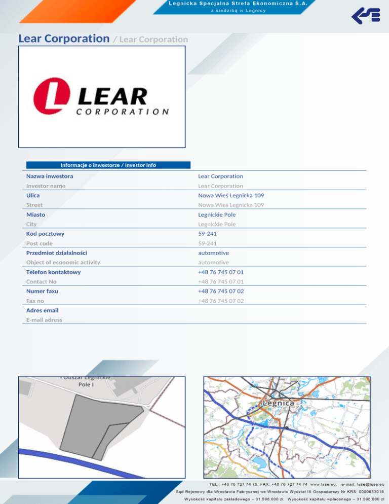 Lear Corporation / Lear Corporation Informacje o inwestorze / Investor info Nazwa inwestora Lear Corporation Investor name Lear Corporation Ulica Nowa Wieś Legnicka 109 Street Nowa Wieś Legnicka 109 Miasto Legnickie Pole City Legnickie Pole Kod pocztowy 59-241 Post code 59-241 Przedmiot działalności automotive Object of economic activity automotive Telefon kontaktowy +48 76 745 07 01 Contact No +48 76 745 07 01 Numer faxu +48 76 745 07 02 Fax no +48 76 745 07 02 Adres email E-mail adress