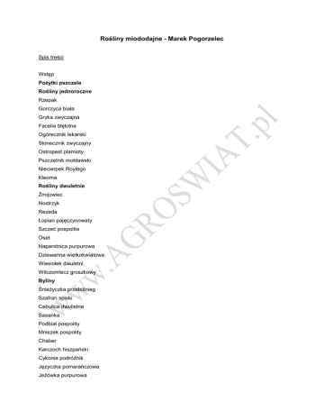 Rośliny miododajne - Marek Pogorzelec Spis treści Wstęp PoŜytki pszczele Rośliny jednoroczne Rzepak Gorczyca biała Gryka zwyczajna Facelia błękitna Ogórecznik lekarski Słonecznik zwyczajny Ostropest plamisty Pszczelnik mołdawski Niecierpek Roylego Kleoma Rośliny dwuletnie śmijowiec Nostrzyk Rezeda Łopian pajęczynowaty Szczeć pospolita Oset Naparstnica purpurowa Dziewanna wielkokwiatowa Wiesiołek dwuletni Wilczomlecz groszkowy Byliny ŚnieŜyczka przebiśnieg Szafran spiski Cebulica dwulistna Sasanka Podbiał pospolity Mniszek pospolity Chaber Karczoch hiszpański Cykonia podróŜnik Języczka pomarańczowa JeŜówka purpurowa OstroŜeń Przegorzan Rozniak przerośnięty Nawloc. Starzec Fuchsa Koniczyna Lucerna Sparceta siewna Komonica zwyczajna Groszek bulwiasty Wyka Serdecznik pospolity Szanta pospolita śeleźniak Pysznogłówka Kłosowiec Lebiodka pospolita Kocimiętka Mięta Melisa lekarska Farbownik lekarski Niezapominajka Miodunka plamista Ostrzeń pospolity Świerzbnica polna Driakiew Trędownik bulwiasty Przetacznik Cymbalaria bluszczykowata Wierzbówka kiprzyca Wielosił błękitny Mikołajek płaskolistny Trojeść Dyptan jesionolistny Stulisz miotłowy Krwawnica pospolita Lubczyk ogrodowy Ślazówka Turyngska Rdest Werbana hastata Rozchodnik Rojnik pospolity Zimowit jesienny Krzewinki i półkrzewy Hyzop lekarski Lawenda Macierzanka właściwa (tymianek) Szałwia Ruta zwyczajna Wrzos zwyczajny Wrzosiec Krzewy Śnieguliczka Suchodrzew pospolity Krzewuszka cudowna Koikwicja Amofra krzewiasta Karagana syberyjska Moszeniec południowy Malina właściwa Ognik szkarłatny Tawula japońska Irga Migdałowiec karłowaty Perukowiec podolski Berberys zwyczajny Mahonia ostrolistna Barbula szara śylistek Budleja Oliwnik wąskolistny Ligustr pospolity Tarnina Głóg Parczelina trójlistna Tamaryszek Drzewa Wierzba Klon Drzewa owocowe Robinia akacjowa Lipa Drzewa parkowe: - Glediczia - Szupin (perełkowiec) japoński - Mydleniec wiechowaty - Kalopanax - Aralia chińska - Bogodrzew (gruczołkowaty) chiński - Tulipanowiec amerykański - Sumak octowiec - Kasztanowiec zwyczajny - Kasztan jadalny - Korkowiec amurski PoŜytki spadziowe Spadź z drzew liściastych Spadź z drzew iglastych RozmnaŜanie roślin miododajnych Literatura Skorowidz