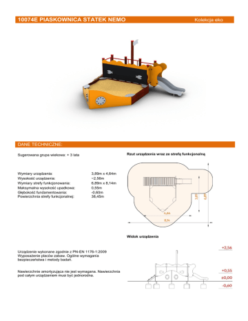 10074E PIASKOWNICA STATEK NEMO Kolekcja eko DANE TECHNICZNE: Rzut urządzenia wraz ze strefą funkcjonalną Sugerowana grupa wiekowa: + 3 lata Wymiary urządzenia: Wysokość urządzenia: Wymiary strefy funkcjonowania: Maksymalna wysokość upadkowa: Głębokość fundamentowania: Powierzchnia strefy funkcjonalnej: 3,89m x 4,64m ~2,56m 6,89m x 8,14m 0,55m -0,60m 38,45m Widok urządzenia Urządzenie wykonane zgodnie z PN-EN 1176-1:2009 Wyposażenie placów zabaw. Ogólne wymagania bezpieczeństwa i metody badań. Nawierzchnie amortyzująca nie jest wymagana. Nawierzchnia pod całym urządzeniem musi być jednorodna. MATERIAŁY: Nogi konstrukcyjne, burty piaskownicy: drewno lite, impregnowane, lakierowane na kolor ciemny orzech Elementy połaciowe, aplikacje: sklejka wodoodporna, laminowana Kotwy: stal ocynkowana kąpielowo Podest: deski impregnowane Elementy stalowe: stal ocynkowana kąpielowo, malowana proszkowo Ślizg: stal nierdzewna Tablica rysunkowa: sklejka wodoodporna szalunkowa gr. 15mm, malowana farbą tablicową Zaślepki: tworzywo sztuczne Fundamenty: beton klasy min. B-15 SATERNUS DISTRIBUTION Sp. z o.o. sp. k. ul. Nowa 32 41-500 Chorzów SATERNUS DISTRIBUTION Sp. z o.o. sp. k. zastrzega sobie wszelkie prawa do ochrony praw autorskich na podstawie Ustawy z dnia 04.02.1994 r. o prawie autorskim i prawach pokrewnych ( DZ. U. Nr 28 poz. 83) a zwłaszcza art. 78 i 79 tejże ustawy. Właściciel certyfikatu: Producent: Dystrybutor: GRUPA SATERNUS Sp. z o.o. S. K. A. (następca prawny Place Zabaw Saternus Sp. z o.o.) Saternus Production Sp. z o.o. sp. k. Saternus Distribution Sp. z o.o. sp. k.