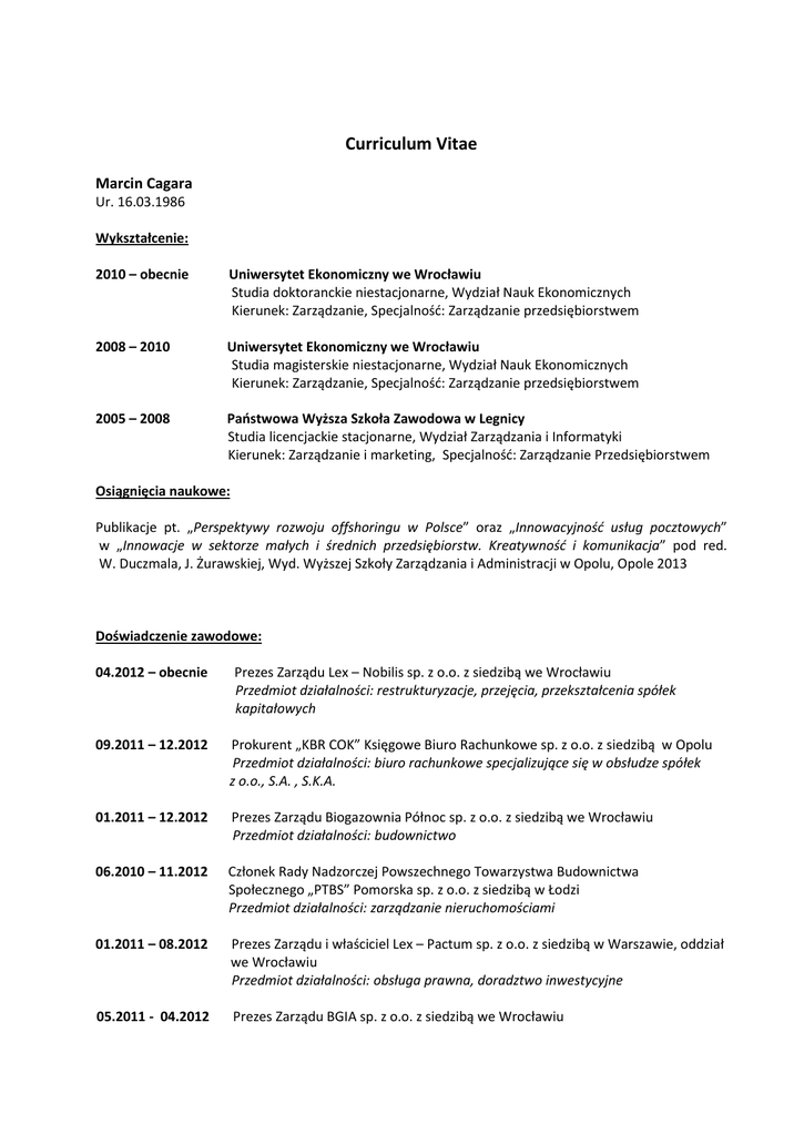 Curriculum Vitae Marcin Cagara Ur. 16.03.1986 Wykształcenie: 2010 – obecnie Uniwersytet Ekonomiczny we Wrocławiu Studia doktoranckie niestacjonarne, Wydział Nauk Ekonomicznych Kierunek: Zarządzanie, Specjalność: Zarządzanie przedsiębiorstwem 2008 – 2010 Uniwersytet Ekonomiczny we Wrocławiu Studia magisterskie niestacjonarne, Wydział Nauk Ekonomicznych Kierunek: Zarządzanie, Specjalność: Zarządzanie przedsiębiorstwem 2005 – 2008 Państwowa Wyższa Szkoła Zawodowa w Legnicy Studia licencjackie stacjonarne, Wydział Zarządzania i Informatyki Kierunek: Zarządzanie i marketing, Specjalność: Zarządzanie Przedsiębiorstwem Osiągnięcia naukowe: Publikacje pt. „Perspektywy rozwoju offshoringu w Polsce” oraz „Innowacyjność usług pocztowych” w „Innowacje w sektorze małych i średnich przedsiębiorstw. Kreatywność i komunikacja” pod red. W. Duczmala, J. Żurawskiej, Wyd. Wyższej Szkoły Zarządzania i Administracji w Opolu, Opole 2013 Doświadczenie zawodowe: 04.2012 – obecnie Prezes Zarządu Lex – Nobilis sp. z o.o. z siedzibą we Wrocławiu Przedmiot działalności: restrukturyzacje, przejęcia, przekształcenia spółek kapitałowych 09.2011 – 12.2012 Prokurent „KBR COK” Księgowe Biuro Rachunkowe sp. z o.o. z siedzibą w Opolu Przedmiot działalności: biuro rachunkowe specjalizujące się w obsłudze spółek z o.o., S.A. , S.K.A. 01.2011 – 12.2012 Prezes Zarządu Biogazownia Północ sp. z o.o. z siedzibą we Wrocławiu Przedmiot działalności: budownictwo 06.2010 – 11.2012 Członek Rady Nadzorczej Powszechnego Towarzystwa Budownictwa Społecznego „PTBS” Pomorska sp. z o.o. z siedzibą w Łodzi Przedmiot działalności: zarządzanie nieruchomościami 01.2011 – 08.2012 Prezes Zarządu i właściciel Lex – Pactum sp. z o.o. z siedzibą w Warszawie, oddział we Wrocławiu Przedmiot działalności: obsługa prawna, doradztwo inwestycyjne 05.2011 - 04.2012 Prezes Zarządu BGIA sp. z o.o. z siedzibą we Wrocławiu Przedmiot działalności: zarządzanie nieruchomościami 12.2010 – 04.2012 Prezes Zarządu AZF sp. z o.o. z siedzibą we Wrocławiu Przedmiot działalności: inwestycje kapitałowe Zgodnie ze złożonym oświadczeniem Pan Marcin Cagara nie wykonuje żadnej działalności konkurencyjnej w stosunku do działalności Emitenta; nie figuruje w Rejestrze Dłużników Niewypłacalnych, prowadzonym na podstawie ustawy o Krajowym Rejestrze Sądowym; nie jest pozbawiony przez sąd upadłościowy prawa prowadzenia działalności gospodarczej na własny rachunek oraz pełnienia funkcji członka Rady Nadzorczej, reprezentanta lub pełnomocnika w spółce handlowej, przedsiębiorstwie państwowym, spółdzielni, fundacji lub stowarzyszeniu oraz nie byłem skazany prawomocnym wyrokiem za przestępstwa określone w przepisach rozdziałów XXXVII Kodeksu karnego oraz art. 585, 587 i 590 - 591 Kodeksu spółek handlowych.