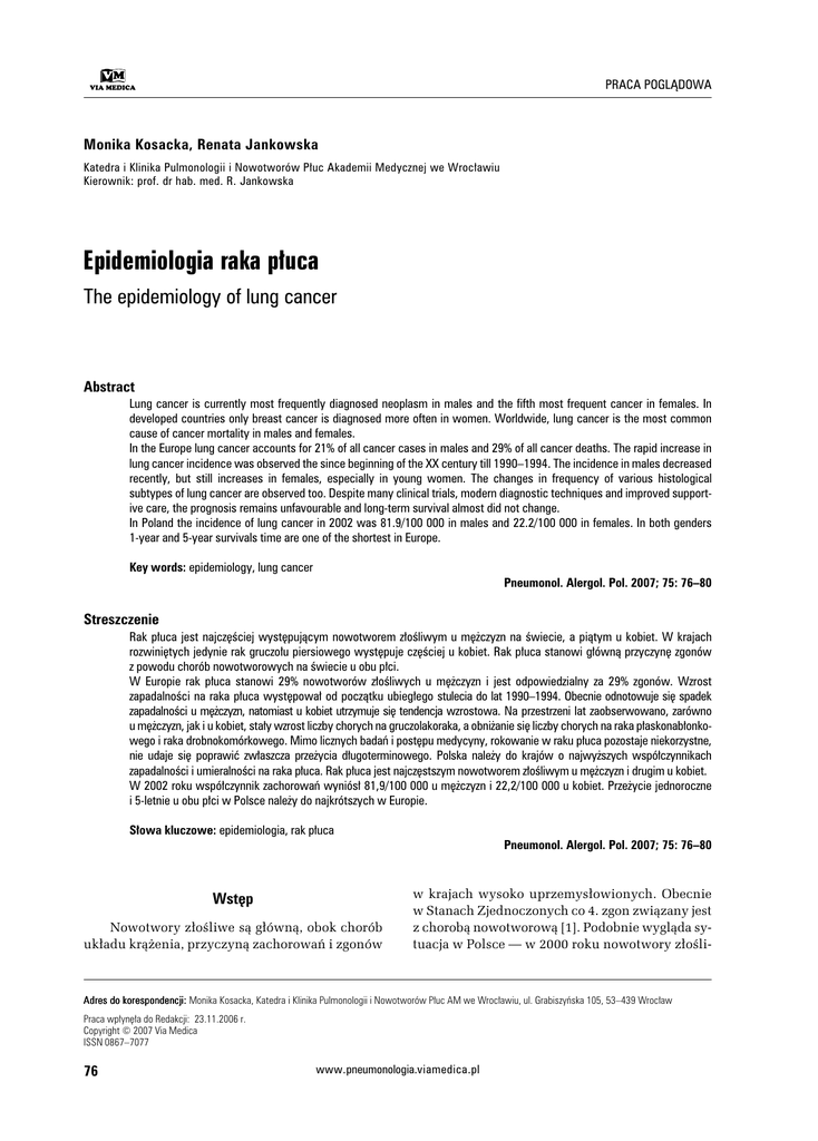 PRACA POGLĄDOWA Monika Kosacka, Renata Jankowska Katedra i Klinika Pulmonologii i Nowotworów Płuc Akademii Medycznej we Wrocławiu Kierownik: prof. dr hab. med. R. Jankowska Epidemiologia raka płuca The epidemiology of lung cancer Abstract Lung cancer is currently most frequently diagnosed neoplasm in males and the fifth most frequent cancer in females. In developed countries only breast cancer is diagnosed more often in women. Worldwide, lung cancer is the most common cause of cancer mortality in males and females. In the Europe lung cancer accounts for 21% of all cancer cases in males and 29% of all cancer deaths. The rapid increase in lung cancer incidence was observed the since beginning of the XX century till 1990–1994. The incidence in males decreased recently, but still increases in females, especially in young women. The changes in frequency of various histological subtypes of lung cancer are observed too. Despite many clinical trials, modern diagnostic techniques and improved supportive care, the prognosis remains unfavourable and long-term survival almost did not change. In Poland the incidence of lung cancer in 2002 was 81.9/100 000 in males and 22.2/100 000 in females. In both genders 1-year and 5-year survivals time are one of the shortest in Europe. Key words: epidemiology, lung cancer Pneumonol. Alergol. Pol. 2007; 75: 76–80 Streszczenie Rak płuca jest najczęściej występującym nowotworem złośliwym u mężczyzn na świecie, a piątym u kobiet. W krajach rozwiniętych jedynie rak gruczołu piersiowego występuje częściej u kobiet. Rak płuca stanowi główną przyczynę zgonów z powodu chorób nowotworowych na świecie u obu płci. W Europie rak płuca stanowi 29% nowotworów złośliwych u mężczyzn i jest odpowiedzialny za 29% zgonów. Wzrost zapadalności na raka płuca występował od początku ubiegłego stulecia do lat 1990–1994. Obecnie odnotowuje się spadek zapadalności u mężczyzn, natomiast u kobiet utrzymuje się tendencja wzrostowa. Na przestrzeni lat zaobserwowano, zarówno u mężczyzn, jak i u kobiet, stały wzrost liczby chorych na gruczolakoraka, a obniżanie się liczby chorych na raka płaskonabłonkowego i raka drobnokomórkowego. Mimo licznych badań i postępu medycyny, rokowanie w raku płuca pozostaje niekorzystne, nie udaje się poprawić zwłaszcza przeżycia długoterminowego. Polska należy do krajów o najwyższych współczynnikach zapadalności i umieralności na raka płuca. Rak płuca jest najczęstszym nowotworem złośliwym u mężczyzn i drugim u kobiet. W 2002 roku współczynnik zachorowań wyniósł 81,9/100 000 u mężczyzn i 22,2/100 000 u kobiet. Przeżycie jednoroczne i 5-letnie u obu płci w Polsce należy do najkrótszych w Europie. Słowa kluczowe: epidemiologia, rak płuca Pneumonol. Alergol. Pol. 2007; 75: 76–80 Wstęp Nowotwory złośliwe są główną, obok chorób układu krążenia, przyczyną zachorowań i zgonów w krajach wysoko uprzemysłowionych. Obecnie w Stanach Zjednoczonych co 4. zgon związany jest z chorobą nowotworową [1]. Podobnie wygląda sytuacja w Polsce — w 2000 roku nowotwory złośli- Adres do korespondencji: Monika Kosacka, Katedra i Klinika Pulmonologii i Nowotworów Płuc AM we Wrocławiu, ul. Grabiszyńska 105, 53–439 Wrocław Praca wpłynęła do Redakcji: 23.11.2006 r. Copyright © 2007 Via Medica ISSN 0867–7077 76 www.pneumonologia.viamedica.pl Monika Kosacka, Renata Jankowska, Epidemiologia raka płuca we były odpowiedzialne za 23% zgonów. Szacuje się, że w ciągu najbliższych 50 lat nastąpi podwojenie liczby zachorowań na nowotwory złośliwe na świecie [2]. Wśród nowotworów złośliwych rak płuca zajmuje czołowe miejsca zarówno pod względem częstości występowania, jak i przyczyny zgonów. Jest to obecnie najczęściej występujący nowotwór złośliwy na świecie [1, 3–6]. Zapadalność globalna i jej zmiany w czasie Jeszcze na początku XX wieku rak płuca był rzadkim schorzeniem. W Europie i w Ameryce od lat 30. ubiegłego wieku obserwowano tendencję wzrostową zapadalności na raka płuca [4–7]. W Wielkiej Brytanii częstość występowania raka płuca u mężczyzn była aż 50-krotnie wyższa w roku 1970 niż w 1911 [7]. W pierwszej połowie lat 90. XX wieku w krajach Europy Zachodniej i w Stanach Zjednoczonych po raz pierwszy odnotowano stabilizację, a następnie tendencję spadkową zapadalności, ale dotyczyło to tylko populacji mężczyzn, u kobiet nadal utrzymuje się trend wzrostowy, zwłaszcza u młodych kobiet w wieku 45–54 lat [4, 5, 8]. W 2002 roku rozpoznano raka płuca u 1,35 mln osób na świecie. Zapadalność globalna u mężczyzn wyniosła 35,5/100 000, a u kobiet 12,1/100 000 [3]. Na wzrost zapadalności na raka płuca miało wpływ wiele czynników. Niewątpliwie główną przyczyną stało się rozpowszechnienie palenia tytoniu. Zwraca się także uwagę na zmiany w strukturze wiekowej ludności w krajach rozwiniętych, rozwój przemysłu, zanieczyszczenie środowiska czy zmianę diety [4–6]. Z geograficznego punktu widzenia, w Europie, Ameryce Centralnej, Australii, Nowej Zelandii oraz w części krajów azjatyckich rak płuca jest najczęstszym nowotworem złośliwym w populacji mężczyzn. W Stanach Zjednoczonych znajduje się na drugim miejscu po raku gruczołu krokowego, ale jest najczęstszą przyczyną zgonów z powodu chorób nowotworowych [2, 3]. W Unii Europejskiej stanowi aż 21% nowotworów złośliwych u mężczyzn i odpowiedzialny jest za 29% zgonów z powodu nowotworów w tej grupie. Na świecie najwyższe współczynniki zapadalności u mężczyzn występują wśród populacji Amerykanów pochodzenia afrykańskiego w Nowym Orleanie i centralnej Luizjanie (odpowiednio 110 i 105 na 100 000). Natomiast do krajów o najniższych współczynnikach należą Indie (1,3/100 000) i część państw afrykańskich, na przykład Uganda (4,2/100 000) [2, 9]. W Europie najwyższą zapadalność obserwuje si