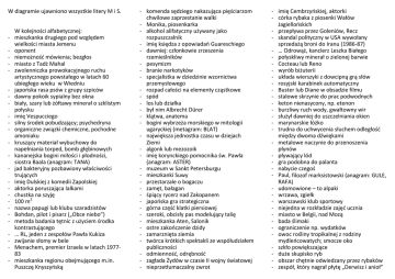 W diagramie ujawniono wszystkie litery M i S. W kolejności alfabetycznej: ‐ mieszkanka drugiego pod względem wielkości miasta Jemenu ‐ oponent ‐ niemożność mówienia; bezgłos ‐ miasto z Tadż Mahal ‐ zwolenniczka prowokacyjnego ruchu artystycznego powstałego w latach 60 ubiegłego wieku w Wiedniu ‐ japońska rasa psów z grupy szpiców ‐ dawny pokoik sypialny bez okna ‐ biały, szary lub żółtawy minerał o szklistym połysku ‐ imię Vespucciego ‐ silny środek pobudzający; psychedryna ‐ organiczne związki chemiczne, pochodne amoniaku ‐ kruszący materiał wybuchowy do napełniania torped, bomb głębinowych ‐ kananejska bogini miłości i płodności, siostra Baala (anagram: TANA) ‐ jad bakteryjny pozbawiony właściwości trujących ‐ imię Dulskiej z komedii Zapolskiej ‐ aktorka poruszająca lalkami ‐ chustka na szyję ‐ 100 m2 ‐ nazwa papugi lub klubu szaradzistów ‐ Bohdan, pilot i pisarz („Obce niebo”) ‐ metoda badania tętnic z użyciem środka kontrastującego ‐ … RL, jeden z zespołów Pawła Kukiza ‐ zwijanie słomy w bele ‐ Menachem, premier Izraela w latach 1977‐ 83 ‐ mieszkanka regionu obejmującego m.in. Puszczę Knyszyńską ‐ komenda sędziego nakazująca pięściarzom chwilowe zaprzestanie walki ‐ Monika, piosenkarka ‐ alkohol alifatyczny używany jako rozpuszczalnik ‐ imię księdza z opowiadań Guareschiego ‐ dawniej: członkowie zrzeszenia rzemieślników ‐ pesymizm ‐ branie narkotyków ‐ specjalistka w dziedzinie wzornictwa przemysłowego ‐ rozpad całości na elementy cząstkowe ‐ spód ‐ los lub działka ‐ był nim Albrecht Dürer ‐ klątwa, anatema ‐ bogini wybrzeża morskiego w mitologii ugaryckiej (metagram: BLAT) ‐ największa jednostka czasu w dziejach Ziemi ‐ algonk lub mezozoik ‐ imię korynckiego pomocnika św. Pawła (anagram: ASTER) ‐ muzeum w Sankt Petersburgu ‐ mieszkanki Suwy ‐ przestarzale o bogaczu ‐ zamęt, bałagan ‐ śpiący rycerz nad Zakopanem ‐ japońska gra strategiczna ‐ górna część klatki piersiowej ‐ szeroki, obcisły pas modelujący talię ‐ mieszkanka Aten, Salonik ‐ ostre zakończenie dzidy ‐ zamarznięta ziemia ‐ twórca krótkich spektakli ze współudziałem publiczności ‐ odmienność, odrębność ‐ zagłada Żydów w czasie II wojny światowej ‐ nieprzetłumaczalny zwrot ‐ imię Cembrzyńskiej, aktorki ‐ córka rybaka z piosenki Wałów Jagiellońskich ‐ przepływa przez Goleniów, Recz ‐ skandal polityczny w USA wywołany sprzedażą broni do Iranu (1986‐87) ‐ … Odrowąż, kanclerz Leszka Białego ‐ połyskliwy minerał o zielonej barwie ‐ Cocteau lub Reno ‐ wyrób biżuterii ‐ układa wierszyki z dowcipną grą słów ‐ rosyjski karabinek automatyczny ‐ Buster lub Diane w obsadzie filmu ‐ stalowe skrzynie do prac podwodnych ‐ keton nienasycony, np. etenon ‐ burzliwy ruch wody, gwałtowny wir ‐ służył dawniej do uszczelniania okien ‐ marynarskie łóżko ‐ trudna do uchwycenia słuchem odległość między dwoma dźwiękami ‐ metalowe naczynie do przenoszenia płynów ‐ pływający lód ‐ gra podobna do palanta ‐ nabycie czegoś ‐ Paul, filozof marksistowski (anagram: GULE, RAFA) ‐ udomowione – to alpaki ‐ wrzawa, zgiełk ‐ warszawski klub sportowy ‐ niejedna w rozkładzie zajęć ucznia ‐ miasto w Belgii, nad Mozą ‐ bada ślimaki ‐ ograniczenie np. wydatków ‐ owoc rośliny tropikalnej z rodziny mydleńcowatych; smocze oko ‐ szkło powiększające ‐ duże skupisko ryb ‐ obszar chętnie odwiedzany przez rybaków ‐ zespół, który nagrał płytę „Derwisz i anioł” ‐ teologiczna szkoła muzułmańska ‐ imię Mikkelsena, duńskiego aktora (Le Chiffre w bondowskim „Casino Royale”) ‐ osoba zarządzająca przedsiębiorstwem ‐ urządzenie do wyrobu jednego z produktów nabiałowych ‐ tytuł przysługujący perskim i tureckim książętom ‐ opowieść o bogach ‐ Carel de, holenderski rytownik i malarz (anagram: ORMO) ‐ pierścień służący do łączenia dwóch rur ‐ narozrabianie ‐ umieszczenie zbyt dużego ładunku na samochodzie ‐ nasmarowywanie ‐ sposób wypowiedzi w utworze epickim ‐ słynny łowca, założyciel państwa babilońskiego ‐ Franco, włoski aktor filmowy („Szklana pułapka 2”, „Komandosi z Navarony”) ‐ niedostępność ‐ Dyzma grany przez Pazurę ‐ człowiek cierpiący na hipotonię ‐ doktor z pierwszego filmu o Bondzie ‐ mroczny gatunek filmowy z lat 50 XX w. ‐ mieszkaniec miejscowości leżącej niedaleko Gdańska lub Warszawy ‐ lekka chmura ‐ rzeka lub choroba ‐ władca bogów w mitologii skandynawskiej ‐ masturbacja ‐ mieszkaniec słowacko‐polskiego rejonu etnograficznego ‐ pęd do ubiegania się o odznaczenia ‐ świta, asysta ‐ kolonista ‐ … Balcy, operator dźwięku w kreskówkach ‐ stolica Kanady ‐ „Czarnoksiężnik z krainy …” ‐ rodzaj kaszy ‐ żołnierz posługujący się bronią o długim drzewcu i małym ostrym grocie ‐ technika zdobienia przedmiotów drewnianych przez wypalanie wzorów rozgrzanym rylcem ‐ miasto w południowej Rumunii ‐ to, co kusi, pociąga (przestarzale) ‐ silnie umięśnione części ciała znajdujące się poniżej kręgosłupa ‐ czeka brudną koszulę ‐ chrupiąca przekąska z plasterka ziemniaka ‐ enzym wytwarzany w organizmie jako substancja nieczynna ‐ żartobliwie o zwierzchniku ‐ zwierzę latające ‐ instrument astronomiczny do badania źródeł promieniowania radiowego ‐ roślina pasożytnicza z lasów Borneo i Sumatry; bukietnica ‐ klub piłkarski z Wiednia ‐ trzeźwo patrzy na życie ‐ poprawki gotowego rysunku, obrazu, zdjęcia ‐ teren o szczególnych właściwościach przyrodniczych, objęty ochroną ‐ 365 dni ‐ Henryk, powieściopisarz („Pamiątki Soplicy”) ‐ roślina pastewna o cienkiej łodydze i białych lub różowych kwiatach 