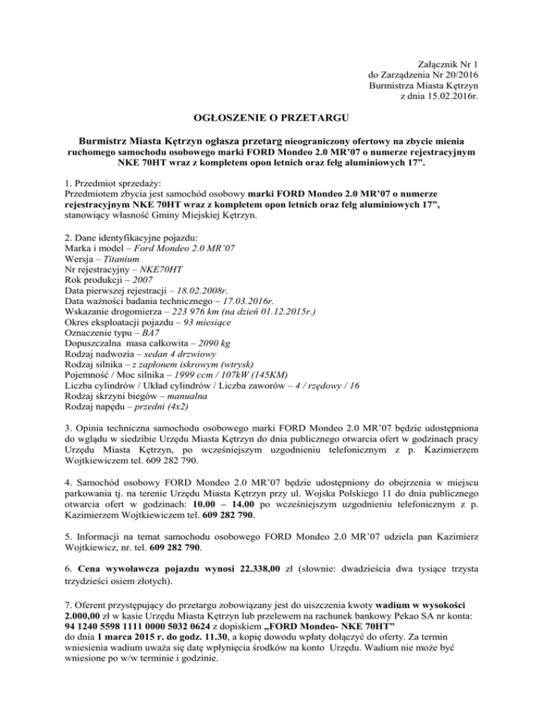 Załącznik Nr 1 do Zarządzenia Nr 20/2016 Burmistrza Miasta Kętrzyn z dnia 15.02.2016r. OGŁOSZENIE O PRZETARGU Burmistrz Miasta Kętrzyn ogłasza przetarg nieograniczony ofertowy na zbycie mienia ruchomego samochodu osobowego marki FORD Mondeo 2.0 MR’07 o numerze rejestracyjnym NKE 70HT wraz z kompletem opon letnich oraz felg aluminiowych 17”. 1. Przedmiot sprzedaży: Przedmiotem zbycia jest samochód osobowy marki FORD Mondeo 2.0 MR’07 o numerze rejestracyjnym NKE 70HT wraz z kompletem opon letnich oraz felg aluminiowych 17”, stanowiący własność Gminy Miejskiej Kętrzyn. 2. Dane identyfikacyjne pojazdu: Marka i model – Ford Mondeo 2.0 MR’07 Wersja – Titanium Nr rejestracyjny – NKE70HT Rok produkcji – 2007 Data pierwszej rejestracji – 18.02.2008r. Data ważności badania technicznego – 17.03.2016r. Wskazanie drogomierza – 223 976 km (na dzień 01.12.2015r.) Okres eksploatacji pojazdu – 93 miesiące Oznaczenie typu – BA7 Dopuszczalna masa całkowita – 2090 kg Rodzaj nadwozia – sedan 4 drzwiowy Rodzaj silnika – z zapłonem iskrowym (wtrysk) Pojemność / Moc silnika – 1999 ccm / 107kW (145KM) Liczba cylindrów / Układ cylindrów / Liczba zaworów – 4 / rzędowy / 16 Rodzaj skrzyni biegów – manualna Rodzaj napędu – przedni (4x2) 3. Opinia techniczna samochodu osobowego marki FORD Mondeo 2.0 MR’07 będzie udostępniona do wglądu w siedzibie Urzędu Miasta Kętrzyn do dnia publicznego otwarcia ofert w godzinach pracy Urzędu Miasta Kętrzyn, po wcześniejszym uzgodnieniu telefonicznym z p. Kazimierzem Wojtkiewiczem tel. 609 282 790. 4. Samochód osobowy FORD Mondeo 2.0 MR’07 będzie udostępniony do obejrzenia w miejscu parkowania tj. na terenie Urzędu Miasta Kętrzyn przy ul. Wojska Polskiego 11 do dnia publicznego otwarcia ofert w godzinach: 10.00 – 14.00 po wcześniejszym uzgodnieniu telefonicznym z p. Kazimierzem Wojtkiewiczem tel. 609 282 790. 5. Informacji na temat samochodu osobowego FORD Mondeo 2.0 MR’07 udziela pan Kazimierz Wojtkiewicz, nr. tel. 609 282 790. 6. Cena wywoławcza pojazdu wynosi 22.338,00 zł (słownie: dwadzieścia dwa tysiące trzysta trzydzieści osiem złotych). 7. Oferent przystępujący do przetargu zobowiązany jest do uiszczenia kwoty wadium w wysokości 2.000,00 zł w kasie Urzędu Miasta Kętrzyn lub przelewem na rachunek bankowy Pekao SA nr konta: 94 1240 5598 1111 0000 5032 0624 z dopiskiem „FORD Mondeo- NKE 70HT” do dnia 1 marca 2015 r. do godz. 11.30, a kopię dowodu wpłaty dołączyć do oferty. Za termin wniesienia wadium uważa się datę wpłynięcia środków na konto Urzędu. Wadium nie może być wniesione po w/w terminie i godzinie. 8. Oferty nabycia samochodu w formie pisemnej należy składać w zaklejonych kopertach z adnotacją „FORD Mondeo- NKE 70HT” do dnia 1 marca 2016r. do godz.11.30 w Punkcie Obsługi Interesantów Urzędu Miasta w Kętrzynie, ul. Wojska Polskiego 11. Za termin złożenia ofert uważa się termin ich otrzymania przez Urząd Miasta. Oferty nadesłane lub złożone po terminie składania ofert pozostawia się bez rozpatrzenia. 9. Oferta powinna zawierać: a) imię, nazwisko i adres oferenta albo nazwę lub firmę oraz siedzibę, jeżeli oferentem jest osoba prawna lub inny podmiot, b) datę sporządzenia oferty, c) oferowaną wysokość ceny nabycia, d) oświadczenie, że oferent zapoznał się z warunkami przetargu określonymi w ogłoszeniu, i że przyjmuje te warunki bez zastrzeżeń, e) oświadczenie o zapoznaniu się ze stanem technicznym i prawnym przedmiotu sprzedaży, f) dowód wniesienia wadium, g) konto, na które ma zostać zwrócone wadium (w przypadku gdy oferta nie zostanie przyjęta) lub oświadczenie, iż winno ono być zwrócone z kasy Urzędu Miasta Kętrzyn, h) podpis osoby upoważnionej do złożenia oferty . 10. Publiczne otwarcie ofert odbędzie się dnia 1 marca 2016 r. o godz. 12.00 w Urzędzie Miasta w Kętrzynie, ul. Wojska Polskiego 11, sala nr 108 (pierwsze piętro). 11. Szczegółowe zasady przeprowadzenia przetargu nieograniczonego ofertowego określa Regulamin stanowiący załącznik nr 2 do zarządzenia. 12. Zaoferowaną kwotę za samochód, oferent który wygrał przetarg, winien wpłacić przed podpisaniem umowy kupna - sprzedaży ww. samochodu. 13. Gmina Miejska Kętrzyn zastrzega sobie możliwość zmiany warunków oraz możliwość odwołania przetargu, jak również zamknięcia przetargu bez wyboru oferty, bez podania przyczyny. Burmistrz Miasta (-) Krzysztof Hećman Sporządziły: 1. Teresa Dudzińska 2. Bożena Skalij