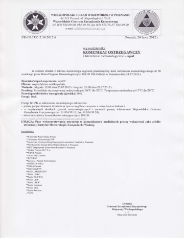 wIELKoPoLsKI URZĄD woJEw DDZKI w PoZNANIU 6l.7I3 Poznari,al. Niepodległości 16/I8 Wojew dzkie Centrum ZarządzaniaKryrysowego (61)852-73-27, tel. (61)854-99-00,854-99-10;fax 854-99-20 g t'lt,.p l e-mail c : k (tt',llrlz t l LtłI' t t |1.,. zK-rr1.6333.2.54.20tf .6 Pozna ,24lipca20l2 r. wg rozdzielnika KOMUNIKAT OSTRZEGAWCZY - upał ostrzeŻenie meteorologiczne W ramach działa z zakresu monitoringu zagroŻe przekazujemytreśćostrzeżeniameteorologicznegonr 50 wydanegoprzezBiuro PrognozMeteorologicznychIMGW PIB oddziałw Poznaniudnia 24.07.2012r. Zj awis ko/stopierflzagr ożeniazupałl2 Obszar: wojewÓdztwowielkopolskie Ważność: od godz. 12:00dnia25.07.20|2r. do godz.21:00dnia28.07.2012r. Przebieg: Przewidujesię temperaturę maksymalnęod 30oC do 32oC. Temperaturaminimalnaod l7oC do 20"C. Prawdop odobierfistwo wystąpienia zj awis|<a:90Yo. Uwagi: Brak. Uwagi WCZK w odniesieniudo niniejszegoostrzezenia: . proszępodjąÓ stosownedziałaniaw tym szczegÓlnie związanez ostrzeieniemludności, . o negatywnych skutkach zjawisk meteorologicznych i anomalii proszę informować WojewÓdzkie Centrum ZarządzaniaKryzysowego(tel.6l 854 99 l0, fax. 61 854 99 20), . adresinternetowykomunikatÓwostrzegawczychIMGW: rost 1 i - 1 . 1 1 11, _g 1i i 1.I l r r l ' i n l c n t e t ' z l ' l a g r o l - c n i i l = n t e ll.t l n ) l UWAGA: Przy wykorzysĘwaniu ostrzeżerfiw komunikatach medialnych proszę wskazywać jako źr dło informacji Instytut Meteorologii i Gospodarki Wodnej. Rozdzielnik -Komenda WojewÓdzka Po|icji . KomendaWojewÓdzkaPSP -Generalna Dyrekcja DrÓg Krajowych i Autostrad oddziałw Poznaniu . Wie lkopolski Zanąd DrÓg WojewÓdzkic h w Poznaniu -PKP Ekspozytura Kierowania Ruchem w Poznaniu -Dalkia PoznariZEC S.A. -WINB Poznari .oDM PSE ZachÓd .RCN PSE .Ławica. PoznaIiPort lotniczv -ENERGAKalisz -ENEA Pozna -Telewizja PTV -Radio ,,MERKURY" -Radio,,Eska" -Radio RMF FM -Radio,Zet" -Radio,,88,4" -Radio Centrum -Radio Elka -Życie Rawicza -PCZK Dyżurny Centru m Zarządzania Kryzysowego Wojewody Wielkopolskiego t -t SławomirNowicki