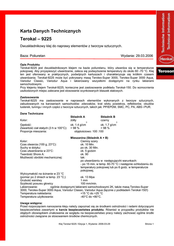 Karta Danych Technicznych Terokal – 9225 Dwuskładnikowy klej do naprawy elementów z tworzyw sztucznych. Baza: Poliuretan Wydanie: 29.03.2006 Opis Produktu Terokal-9225 jest dwuskładnikowym klejem na bazie poliuretanu, który utwardza się w temperaturze pokojowej. Aby przyspieszyć utwardzanie, zaleca się podwyższenie temperatury do około 60 -70 °C. Klej ten jest oferowany w praktycznych, podwójnych kartuszach i charakteryzuje się krótkim czasem utwardzania. Terokal-9225 może być pokrywany masą Terotex-Super 3000, Terotex-Super 3000 Aqua, Variodur Classic, Variodur Aqua i lakierowany wszystkimi dostępnymi na rynku lakierami samochodowymi. Przy klejeniu klejem Terokal-9225, konieczne jest zastosowanie podkładu Terokal-150. Do wzmocnienia uszkodzonych miejsc zalecane jest stosowanie ocynkowanych blaszek stalowych. Zastosowanie Terokal-9225 ma zastosowanie w naprawach elementów wykonanych z tworzyw sztucznych, zabudowanych na karoseriach samochodów: zderzaków, krat wlotu powietrza, reflektorów, obudów lusterek, tuningu i innych części z tworzyw sztucznych, takich jak: PP/EPDM, SMC, PC, PA, ABS i PUR. Dane Techniczne Kolor: Składnik A żółty Gęstość: Zawartość ciał stałych (3 h w 100°C): Proporcje mieszania: ok. 1.4 g/cm ok. 1.7 g/cm > 98 % > 98 % objętościowo: 100 :100 Kolor: Czas otwarcia (100 g, 23°C): Suchy w dotyku: Czas utwardzania w 23°C: Twardość Shore A: Możliwość obróbki mechanicznej: 3 Składnik B czarny 3 Mieszanina (Składnik A + B) Ciemny szary ok. 10 Min. po ok. 30 Min. ok. 5 godzin ok. 90 tak: po utwardzeniu w następującchi warunkach: - po 15 min. w temp. 60-70 °C i następnie ochłodzeniu do temperatury pokojowej lub po 6 godz. w temperaturze pokojowej. Wytrzymałość na ścinanie w 23 °C (pomiar po 2 dniach w temp. 23 °C;) ok. 13 Mpa Grubość warstwy 1 mm Szybkość posuwu głowicy 100 mm/min. Lakierowanie: ogólnie dostępnymi lakierami samochodowymi 2K, także masą Terotex-Super 3000, Terotex-Super 3000 Aqua, Variodur Classic, Variodur Aqua (łącznie z podkładem Terokal-150!) Temperatura nakładania: +15 °C do +25 °C Temperatura użytkowania: -40°C do +80°C. Uwaga wstępna: Przed rozpoczęciem nanoszenia kleju należy zapoznać się ze środkami ostrożności i radami dotyczącymi bezpieczeństwa zawartymi w karcie bezpieczeństwa produktu. Również w przypadku produktów nie objętych obowiązkiem znakowania ze względu na bezpieczeństwo pracy należy zachować ogólne środki ostrożności związane ze stosowaniem środków chemicznych. Klej Terokal 9225 / Edycja 1, Wydanie: 2006-03-29 Strona 1 1. Przygotowanie podłoża 1.1. Czyszczenie wstępne i czyszczenie. Powierzchnie klejone muszą być wolne od oleju, smaru, wilgoci, brudu i środków oddzielających. Dlatego konieczne jest wstępne oczyszczenie podłoża wodą pod wysokim ciśnieniem z dodatkiem środków myjących. Następnie elementy naprawiane muszą być dokładnie osuszone (suszenie piecowe, promieniami podczerwieni lub powietrzem), a miejsca przeznaczone do klejenia należy przemyć Zmywaczem FL. Bardzo zdeformowane części mogą zostać wyprostowane i pozbawione naprężeń poprzez podgrzewanie gorącym powietrzem. 1.2. Szlifowanie i czyszczenie. Krawędzie pęknięcia elementu z tworzywa sztucznego z ukosować po stronie zewnętrznej na szerokości około 1 - 2 cm, przy pomocy szlifierki taśmowej z wąską taśmą o ziarnistości 150. Na końcach pęknięcia wywiercić otwory, żeby pęknięcie nie rozchodziło się dalej. Powierzchnie elementu naprawianego wokół uszkodzonego miejsca, od strony zewnętrznej i wewnętrznej, przeszlifować szlifierką mimośrodową (ziarnistość tarczy 150). Następnie omawiane powierzchnie przedmuchać sprężonym powietrzem i przemyć Zmywaczem FL. 1.3. Gruntowanie Podkład Terokal 150 w aerozolu natrysnąć na przeszlifowane powierzchnie cienką warstwą i pozostawić do odparowania przez około 10 – 15 minut. 2. Przygotowanie kleju i klejenie. 2.1. Włożenie kartuszy. Zapadkę przesuwu listwy wyciskacza Teromix przesunąć do góry i pociągnąć tłoczysko do tyłu aż do oporu. Podwójną kartuszę włożyć do zamka i zabezpieczyć. Zdjąć kapturek z kartuszy, wycisnąć materiał klejący do momentu, kiedy będą wypływać obydwa składniki, oczyścić końcówkę wylotową kartuszy i nałożyć dyszę mieszającą. Końcówkę dyszy mieszającej przyciąć na żądaną grubość ściegu materiału klejącego. 2.2. Nakładanie kleju. Przy równoczesnym wyciskaniu obydwu składników kleju i przepływaniu przez dyszę mieszającą, zostają one automatycznie i dokładnie wymieszane. Wyciśnięte pierwsze 0,5 - 1centymetra ściegu kleju należy odrzucić, ponieważ obydwa składniki na początku mogą być niedokładnie wymieszane. Terokal-9225 nakładamy na powierzchnie pokryte wcześniej podkładem Terokal-150. Jeżeli zawartość kartuszy nie została do końca zużyta, należy dyszę mieszającą wyrzucić, a kartuszę z powrotem zamknąć kapturkiem. Do ponownego nakładania kleju musi być użyta nowa dysza mieszająca. 2.3. Wzmacnianie. Terokal-9225 powinno się najpierw nanieść na wewnętrzną stronę elementu naprawianego ciągłym ściegiem po obu stronach pęknięcia (szerokość klejenia, co najmniej 100 mm). Do wzmocnienia klejenia, nakłada się elektrolitycznie ocynkowane blaszki wzmacniające ustalając je przy pomocy zacisków. Pozostałe blaszki należy ułożyć w jednakowych odległościach na całej długości pęknięcia. Terokal-9225 jest nanoszony bezpośrednio na paski blachy, a powierzchnia zewnętrzna może być wygładzona przez nałożenie folii polietylenowej. Wygładzanie przez folię PE wyciska klej na stronę zewnętrzną, co daje lepsze połączenie kleju z tworzywem i jednocześnie usuwa ewentualne pęcherzyki powietrza uwięzione w materiale klejącym. Przy uszkodzeniach dużych powierzchni np. ubytków, zalecane jest użycie maty z włókna szklanego, przy c