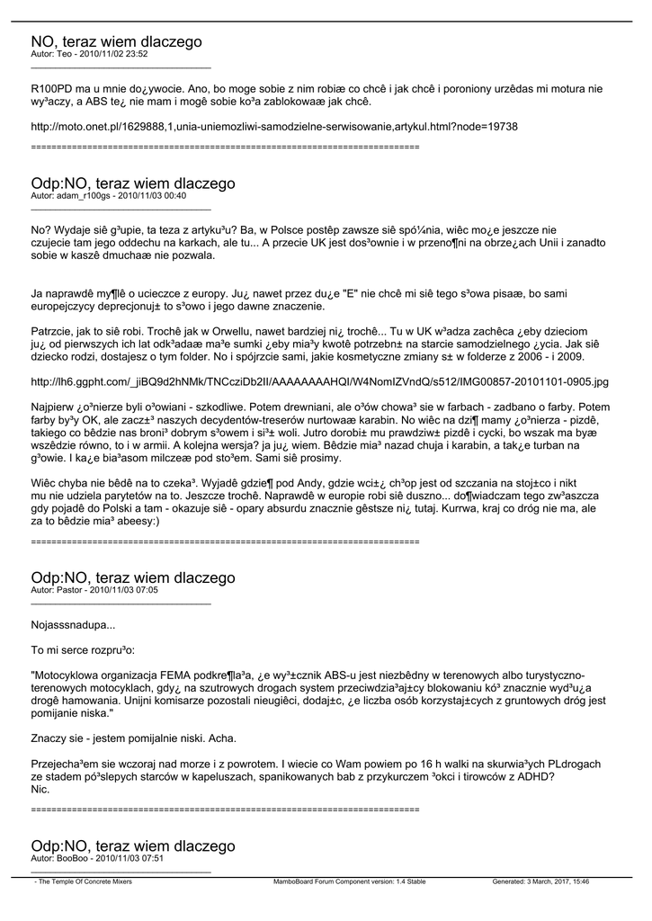 NO, teraz wiem dlaczego Autor: Teo - 2010/11/02 23:52 _____________________________________ R100PD ma u mnie do¿ywocie. Ano, bo moge sobie z nim robiæ co chcê i jak chcê i poroniony urzêdas mi motura nie wy³aczy, a ABS te¿ nie mam i mogê sobie ko³a zablokowaæ jak chcê. http://moto.onet.pl/1629888,1,unia-uniemozliwi-samodzielne-serwisowanie,artykul.html?node=19738 ============================================================================ Odp:NO, teraz wiem dlaczego Autor: adam_r100gs - 2010/11/03 00:40 _____________________________________ No? Wydaje siê g³upie, ta teza z artyku³u? Ba, w Polsce postêp zawsze siê spó¼nia, wiêc mo¿e jeszcze nie czujecie tam jego oddechu na karkach, ale tu... A przecie UK jest dos³ownie i w przeno¶ni na obrze¿ach Unii i zanadto sobie w kaszê dmuchaæ nie pozwala. Ja naprawdê my¶lê o ucieczce z europy. Ju¿ nawet przez du¿e "E" nie chcê mi siê tego s³owa pisaæ, bo sami europejczycy deprecjonuj± to s³owo i jego dawne znaczenie. Patrzcie, jak to siê robi. Trochê jak w Orwellu, nawet bardziej ni¿ trochê... Tu w UK w³adza zachêca ¿eby dzieciom ju¿ od pierwszych ich lat odk³adaæ ma³e sumki ¿eby mia³y kwotê potrzebn± na starcie samodzielnego ¿ycia. Jak siê dziecko rodzi, dostajesz o tym folder. No i spójrzcie sami, jakie kosmetyczne zmiany s± w folderze z 2006 - i 2009. http://lh6.ggpht.com/_jiBQ9d2hNMk/TNCcziDb2II/AAAAAAAAHQI/W4NomIZVndQ/s512/IMG00857-20101101-0905.jpg Najpierw ¿o³nierze byli o³owiani - szkodliwe. Potem drewniani, ale o³ów chowa³ sie w farbach - zadbano o farby. Potem farby by³y OK, ale zacz±³ naszych decydentów-treserów nurtowaæ karabin. No wiêc na dzi¶ mamy ¿o³nierza - pizdê, takiego co bêdzie nas broni³ dobrym s³owem i si³± woli. Jutro dorobi± mu prawdziw± pizdê i cycki, bo wszak ma byæ wszêdzie równo, to i w armii. A kolejna wersja? ja ju¿ wiem. Bêdzie mia³ nazad chuja i karabin, a tak¿e turban na g³owie. I ka¿e bia³asom milczeæ pod sto³em. Sami siê prosimy. Wiêc chyba nie bêdê na to czeka³. Wyjadê gdzie¶ pod Andy, gdzie wci±¿ ch³op jest od szczania na stoj±co i nikt mu nie udziela parytetów na to. Jeszcze trochê. Naprawdê w europie robi siê duszno... do¶wiadczam tego zw³aszcza gdy pojadê do Polski a tam - okazuje siê - opary absurdu znacznie gêstsze ni¿ tutaj. Kurrwa, kraj co dróg nie ma, ale za to bêdzie mia³ abeesy:) ============================================================================ Odp:NO, teraz wiem dlaczego Autor: Pastor - 2010/11/03 07:05 _____________________________________ Nojasssnadupa... To mi serce rozpru³o: "Motocyklowa organizacja FEMA podkre¶la³a, ¿e wy³±cznik ABS-u jest niezbêdny w terenowych albo turystycznoterenowych motocyklach, gdy¿ na szutrowych drogach system przeciwdzia³aj±cy blokowaniu kó³ znacznie wyd³u¿a drogê hamowania. Unijni komisarze pozostali nieugiêci, dodaj±c, ¿e liczba osób korzystaj±cych z gruntowych dróg jest pomijanie niska." Znaczy sie - jestem pomijalnie niski. Acha. Przejecha³em sie wczoraj nad morze i z powrotem. I wiecie co Wam powiem po 16 h walki na skurwia³ych PLdrogach ze stadem pó³slepych starców w kapeluszach, spanikowanych bab z przykurczem ³okci i tirowców z ADHD? Nic. ============================================================================ Odp:NO, teraz wiem dlaczego Autor: BooBoo - 2010/11/03 07:51 _____________________________________ - The Temple Of Concrete Mixers MamboBoard Forum Component version: 1.4 Stable Generated: 3 March, 2017, 15:46 Ja tam ¶wiêto w chacie przesiedzia³em, po wyje¼dzie do jelonki to stanów lêkowych dosta³em. Ja pierdolê, jak to wszystko do kupy skladam to Dominikana coraz bli¿ej :( Zacz±³em szlifowaæ swój hiszpañski. ============================================================================ Odp:NO, teraz wiem dlaczego Autor: AdaM72 - 2010/11/03 11:13 _____________________________________ Eeeeee..... aaaa.... a kurwa maæ, zabrak³o mi s³ów. ============================================================================ Odp:NO, teraz wiem dlaczego Autor: Elwood - 2010/11/03 11:29 _____________________________________ W dba³o¶ci o bezpieczeñstwo narodu, Stalin zarz±dzil czystkê... Smith siê w grobie przewraca. Fundujemy sobie kapitalizm socjalistyczno monopolistyczny . ============================================================================ - The Temple Of Concrete Mixers MamboBoard Forum Component version: 1.4 Stable Generated: 3 March, 2017, 15:46