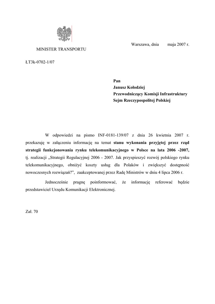 Warszawa, dnia maja 2007 r. MINISTER TRANSPORTU ŁT3k