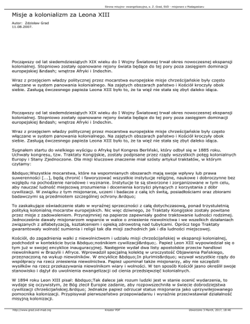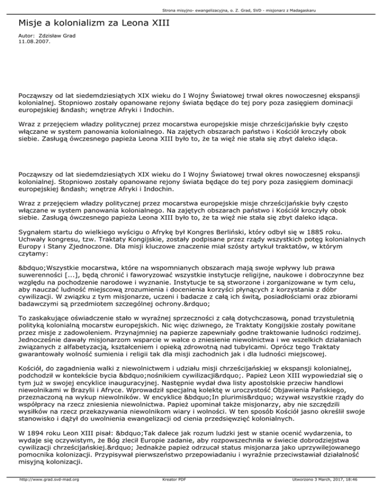 Strona misyjno- ewangelizacyjna, o. Z. Grad, SVD - misjonarz z Madagaskaru Misje a kolonializm za Leona XIII Autor: Zdzisław Grad 11.08.2007. Począwszy od lat siedemdziesiątych XIX wieku do I Wojny Światowej trwał okres nowoczesnej ekspansji kolonialnej. Stopniowo zostały opanowane rejony świata będące do tej pory poza zasięgiem dominacji europejskiej – wnętrze Afryki i Indochin. Wraz z przejęciem władzy politycznej przez mocarstwa europejskie misje chrześcijańskie były często włączane w system panowania kolonialnego. Na zajętych obszarach państwo i Kościół kroczyły obok siebie. Zasługą ówczesnego papieża Leona XIII było to, że ta więź nie stała się zbyt daleko idąca. Począwszy od lat siedemdziesiątych XIX wieku do I Wojny Światowej trwał okres nowoczesnej ekspansji kolonialnej. Stopniowo zostały opanowane rejony świata będące do tej pory poza zasięgiem dominacji europejskiej – wnętrze Afryki i Indochin. Wraz z przejęciem władzy politycznej przez mocarstwa europejskie misje chrześcijańskie były często włączane w system panowania kolonialnego. Na zajętych obszarach państwo i Kościół kroczyły obok siebie. Zasługą ówczesnego papieża Leona XIII było to, że ta więź nie stała się zbyt daleko idąca. Sygnałem startu do wielkiego wyścigu o Afrykę był Kongres Berliński, który odbył się w 1885 roku. Uchwały kongresu, tzw. Traktaty Kongijskie, zostały podpisane przez rządy wszystkich potęg kolonialnych Europy i Stany Zjednoczone. Dla misji kluczowe znaczenie miał szósty artykuł traktatów, w którym czytamy: „Wszystkie mocarstwa, które na wspomnianych obszarach mają swoje wpływy lub prawa suwerenności [...], będą chronić i faworyzować wszystkie instytucje religijne, naukowe i dobroczynne bez względu na pochodzenie narodowe i wyznanie. Instytucje te są stworzone i zorganizowane w tym celu, aby nauczać ludność miejscową zrozumienia i docenienia korzyści płynących z korzystania z dóbr cywilizacji. W związku z tym misjonarze, uczeni i badacze z całą ich świtą, posiadłościami oraz zbiorami badawczymi są przedmiotem szczególnej ochrony.” To zaskakujące oświadczenie stało w wyraźnej sprzeczności z całą dotychczasową, ponad trzystuletnią polityką kolonialną mocarstw europejskich. Nic więc dziwnego, że Traktaty Kongijskie zostały powitane przez misje z zadowoleniem. Przynajmniej na papierze zapewniały godne traktowanie ludności rodzimej. Jednocześnie dawały misjonarzom wsparcie w walce o zniesienie niewolnictwa i we wszelkich działaniach związanych z alfabetyzacją, kształceniem i opieką zdrowotną nad tubylcami. Oprócz tego Traktaty gwarantowały wolność sumienia i religii tak dla misji zachodnich jak i dla ludności miejscowej. Kościół, do zagadnienia walki z niewolnictwem i udziału misji chrześcijańskiej w ekspansji kolonialnej, podchodził w kontekście bycia „nośnikiem cywilizacji”. Papież Leon XIII wypowiedział się o tym już w swojej encyklice inauguracyjnej. Następnie wydał dwa listy apostolskie przeciw handlowi niewolnikami w Brazylii i Afryce. Wprowadził specjalną kolektę w uroczystość Objawienia Pańskiego, przeznaczoną na wykup niewolników. W encyklice „In plurimis” wzywał wszystkie rządy do współpracy na rzecz zniesienia niewolnictwa. Papież upominał także misjonarzy, aby nie szczędzili wysiłków na rzecz przekazywania niewolnikom wiary i wolności. W ten sposób Kościół jasno określił swoje stanowisko i dążył do uwolnienia ewangelizacji od cienia przedsięwzięć kolonialnych. W 1894 roku Leon XIII pisał: „Tak dalece jak rozum ludzki jest w stanie ocenić wydarzenia, to wydaje się oczywistym, że Bóg zlecił Europie zadanie, aby rozpowszechniła w świecie dobrodziejstwa cywilizacji chrześcijańskiej.” Jednakże papież odrzucał status misjonarza jako uprzywilejowanego pomocnika kolonizacji. Przypisywał pierwszeństwo przepowiadaniu i wyraźnie przeciwstawiał działalność misyjną kolonizacji. http://www.grad.svd-mad.org Kreator PDF Utworzono 3 March, 2017, 18:46 Strona misyjno- ewangelizacyjna, o. Z. Grad, SVD - misjonarz z Madagaskaru W interesie postępu misyjnego Leon XIII starał się o względy miejscowych książąt i rządów, którzy odwzajemniali się życzliwością dla misji i chrześcijan. Papież nawiązał osobistą relację z sułtanem tureckim Abdul Hamidem. Dalsze kontakty nastąpiły z kedywem z Egiptu, który zachowywał papieski podpis jako najcenniejszy skarb, z władcą Abisynii, z szachem z Persji, z indyjskim radżą, z mikado japońskim, a nawet z afrykańskim królem Okosi-Około. Działalność misyjna tego okresu była ściśle związana z centralą rzymską, co w konsekwencji prowadziło do silnej romanizacji. Dążenie do centralizmu, na skutek oporu rodzimych mieszkańców i kultur, nie mogło przynieść oczekiwanych sukcesów. Było to szczególnie widoczne na polu przekazywania prawd wiary, nauki małżeńskiej i kształcenia kleru miejscowego. Wielu misjonarzy myślało kategoriami kolonializmu europejskiego i miało nacjonalistyczne nastawienie. Na obszarach protektoratu dążono do powierzania terenów misyjnych jedynie misjonarzom własnej narodowości. Oczekiwano od nich szerzenia kultury narodowej w języku kolonialnym i pośrednio popierania tendencji imperialistycznych. Jednak o zawłaszczeniu misji dla celów politycznych i polityki dla celów misyjnych można mówić jedynie w przypadku protektoratu francuskiego w Azji. Nie ulega wątpliwości, że zajęcie dzisiejszego Wietnamu przez Francję, jak to przyznano po dziesiątkach lat krwawych prześladowań, było spowodowane przez działających tam misjonarzy francuskich i z ich pomocą. Impuls kolonialny jako motyw misyjny miał ogromną siłę oddziaływania. Misjonarze często występowali jako pionierzy kultury konkretnego kraju europejskiego. Narodowy charakter misji można było odczytać ze sty