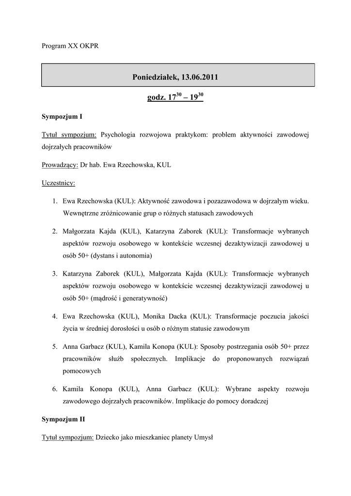 Program XX OKPR Poniedziałek, 13.06.2011 godz. 1730 – 1930 Sympozjum I Tytuł sympozjum: Psychologia rozwojowa praktykom: problem aktywności zawodowej dojrzałych pracowników Prowadzący: Dr hab. Ewa Rzechowska, KUL Uczestnicy: 1. Ewa Rzechowska (KUL): Aktywność zawodowa i pozazawodowa w dojrzałym wieku. Wewnętrzne zróżnicowanie grup o różnych statusach zawodowych 2. Małgorzata Kajda (KUL), Katarzyna Zaborek (KUL): Transformacje wybranych aspektów rozwoju osobowego w kontekście wczesnej dezaktywizacji zawodowej u osób 50+ (dystans i autonomia) 3. Katarzyna Zaborek (KUL), Małgorzata Kajda (KUL): Transformacje wybranych aspektów rozwoju osobowego w kontekście wczesnej dezaktywizacji zawodowej u osób 50+ (mądrość i generatywność) 4. Ewa Rzechowska (KUL), Monika Dacka (KUL): Transformacje poczucia jakości życia w średniej dorosłości u osób o różnym statusie zawodowym 5. Anna Garbacz (KUL), Kamila Konopa (KUL): Sposoby postrzegania osób 50+ przez pracowników służb społecznych. Implikacje do proponowanych rozwiązań pomocowych 6. Kamila Konopa (KUL), Anna Garbacz (KUL): Wybrane aspekty rozwoju zawodowego dojrzałych pracowników. Implikacje do pomocy doradczej Sympozjum II Tytuł sympozjum: Dziecko jako mieszkaniec planety Umysł Prowadzący: dr Marta Białecka-Pikul, UJ, dr Anna Kołodzieczyk, UJ Uczestnicy: 1. Arkadiusz Białek (UJ): Rozumienie i posługiwanie się gestami wskazującymi i ikonicznymi w okresie niemowlęctwa i wczesnego dzieciństwa 2. Marta Białecka-Pikul (UJ): Czy dzieci w szóstym roku życia są świadome strumienia myśli? 3. Jolanta Rytel (UKSW): Argumentacja, narracja i dziecięce teorie umysłu 4. Anna Kołodziejczyk (UJ): Rozwój wiedzy o stanach umysłowych a tworzenie argumentów perswazyjnych. Uwzględnianie przez dzieci informacji o stanach emocjonalnych i przekonaniach innych osób 5. Adam Putko (UAM) Teoria umysłu i język a zimne vs gorące funkcje zarządzające u dzieci w wieku przedszkolnym Sympozjum III Tytuł sympozjum: O niezbywalnej potrzebie rytuału w biegu życia Prowadzący: dr hab. Wanda Zagórska, UKSW, dr Adrian Kurcbart, UJK Uczestnicy: 1. Mateusz Migut (UW): Estetyzacja doświadczenia jako ponowoczesny rytuał 2. Anna Lipska (UKSW): Doświadczenie uczestnictwa w rytuałach rodzinnych a wchodzenie w dorosłość. Próba eksploracji empirycznej 3. Marzanna Farnicka (UZ), Anna Lipska (UKSW): Obecność, potrzeba i znaczenie rytuałów w życiu młodych dorosłych 4. Adrian Kurcbart (UJK): Czy współcześni mężczyźni potrzebują jeszcze rytuałów inicjacyjnych? 5. Wanda Zagórska (UKSW): Egzystencjalne znaczenie rytuałów. Perspektywa psychologiczna Sesja tematyczna I Tytuł sesji: Rozwój i zachowania dysfunkcjonalne w okresie dorastania Prowadzący: dr hab. Zofia Dołęga, KA im. A. Frycza-Modrzewskiego Uczestnicy: 1. Anna Paszkowska-Rogacz (UŁ): Społeczno-demograficzne predyktory zmienności zainteresowań w okresie adolescencji 2. Jagoda Stompór-Świderska (UWr): Planowanie życia w toku rozwoju człowieka. Prezentacja wyników badań w perspektywie life-span 3. Dorota Czyżowska (UJ), Kamila Mikołajewska (UJ): Religijność a rozwój moralny w okresie adolescencji 4. Zofia Dołęga (KA), Dominika Siewniak-Maciuszek (KA) : Rola kompetencji emocjonalno-poznawczych i obrazu siebie w kształtowaniu zachowań związanych z regulacją masy ciała w okresie adolescencji 5. Malwina Dankiewicz (UJ), Katarzyna Pisarczyk (UJ), Anna M. Ziółkowska (UJ): Dyskontowanie przyszłości jako wskaźnik podejmowania zachowań dysfunkcjonalnych przez trudną młodzież 6. Paweł Kurtek (UJK): Radzenie sobie młodzieży gimnazjalnej z lekką niepełnosprawnością intelektualną w społecznych sytuacjach trudnych 7. Krzysztof Gerc (UJ): Niepełnosprawność ruchowa oraz jej konsekwencje dla rozwoju psychicznego w okresie adolescencji Wtorek, 14.06.2011 godz. 1200 – 1400 Sympozjum IV Tytuł sympozjum: Wyższe funkcje poznawcze: ich korelaty i znaczenie Prowadzący: prof. dr hab. Maria Kielar-Turska, UJ, mgr Magdalena Kosno, UJ Uczestnicy: 1. Magdalena Kosno (UJ): Tutoring rówieśniczy a poziom funkcji zarządzających, teorii umysłu i kompetencji komunikacyjnej u 6-latków 2. Maria Kielar-Turska (UJ): Funkcje zarządzające a sprawności językowe i komunikacyjne 3. Małgorzata Stępień-Nycz (UJ): Zarządzanie emocjami? Funkcje zarządzające a rozwój reprezentacji emocji 4. Karolina Byczewska (UJ): Funkcje zarządzające w wieku senioralnym z perspektywy modelu czynników profilaktyki i modyfikacji procesu starzenia się 5. Ewa Czerniawska, Bartłomiej Wrzałka (UW): Pamięć w życiu codziennym: konstrukcja kwestionariusza 6. Elżbieta Szpakiewicz (UJ): Rozwój pamięci prospektywnej w wieku przedszkolnym Sympozjum V Tytuł sympozjum: Wartości w dzieciństwie – wyzwania teoretyczne i metodologiczne Prowadzący: dr Jan Cieciuch, WSFiZ, dr Anna K. Döring, WWU Münster Uczestnicy: 1. Jan Cieciuch (WSFiZ): O pożytkach z teorii wartości Shaloma Schwartza dla psychologii rozwojowej 2. Anna K. Döring (WWU Münster): New insights into values at an early age: The Picture-Based Value Survey for Children 3. Justyna Harasimczuk (UKSW): Polskie badania kształtującego się systemu wartości w okresie dzieciństwa 4. Marta Maćkiewicz (UKSW), Karolina Toczyłowska (UKSW): Związki cech osobowości z preferencjami wartości w dzieciństwie 5. Małgorzata Warchoł (UKSW), Ilona Skoczeń (UKSW): Transmisja wartości w rodzinie Sympozjum VI Tytuł sympozjum: Rola tożsamości osobowej w rozwoju młodzieży i dorosłych Prowadzący: dr Dorota Czyżowska, UJ, dr Michał Grygielski, WSB-NLU Uczestnicy: 1. Dorota Czyżowska, Ewa Gurba, Arkadiusz Białek (UJ): O związkach między typem orientacji społecznej a sposobem konstruowania własnej tożsamości przez młodych dorosłych 2. Alicja Senejko (UWr): Style tożsamości a doświadczanie globalizacji przez adolescentów 3. Anna Cierpka (UW): Narracje tożsamościowe w