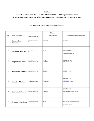 LISTA RZECZOZNAWCÓW ds. JAKOŚCI PRODUKTÓW I USŁUG prowadzona przez WIELKOPOLSKIEGO WOJEWÓDZKIEGO INSPEKTORA INSPEKCJI HANDLOWEJ I – BRANŻA OBUWNICZO – SKÓRZANA Miejsce Lp. Imię i nazwisko Specjalizacja zamieszkania Dane na stronę internetową 1. Suchowiak Mirosław jakość obuwia Poznań 061 832 45 13 2. Bartczak Andrzej jakość obuwia Kalisz 606 835 396 [email protected] 3. Kapitaniak Jerzy jakość obuwia Kalisz 62 753 31 76 4. Nawrocki Marcin jakość obuwia Golina 602 318 601 605 598 151 5. Gdaniec Marian jakość obuwia Gniezno [email protected] 601 758 821 6. Czarniecki Adam jakość obuwia 7. Krawicz Mirosława jakość obuwia Poznań [email protected] Piła zawieszenie działalności do odwołania II – WŁÓKIENNICZO – ODZIEŻOWA, KUŚNIERSTWO Miejsce Lp. 1. Imię i nazwisko Specjalizacja Krzemińska Kamila odzież damska zamieszkania Mosina Dane na stronę internetową działalność zawieszona do odwołania 602 890 603 2. Bystrzycki Krzysztof Jan, włókiennictwo Kalisz [email protected] Jan Krzysztof Bystrzycki ul. Sienkiewicza 43B 62-800 Kalisz 3. Pietraszak Zdzisław odzieżowa Poznań 609 700 732 601 706 133 4. Pietraszak Robert kuśnierstwo Sady [email protected] 5. Krąpiec Stanisława odzieżowo- Poznań 61 877 07 18 dziewiarska, 608 188 992 tkaniny 6. Wziątek Bogusław dziewiarstwo Łódź 506 423 752 [email protected] 7. Bogdańska Monika włókienniczo -odzieżowa Szczytniki 500 085 012 III – STOLARSKO – MEBLARSKA Miejsce Lp. Imię i nazwisko 1. Żurawski Janusz zamieszkania Specjalizacja meblarstwo Dane na stronę internetową Poznań 603 263 346 Gołuchów 606 193 835 stolarka budowlana 2. Suder Jan drewno, drzewo [email protected] 3. 4. Maćkowiak Stanisław stolarstwo Stein Marian meblarstwo Sroka Leonard 661 259 029 [email protected] stolarstwo 5. Poznań meblarstwo Bolesławiec Kalisza) Wolsztyn (dotyczy 600 108 537 502 622 061 [email protected] 6. 7. KuczyńskaCichocka Małgorzata parkieciarstwo Cwityński Tomasz meblarstwo Kalisz 62-800 Kalisz podłogi ul. Słowackiego 16 drewniane 605 695 522 Poznań 605 268 978 [email protected] [email protected] 8. Kozera Dariusz 9. Szymon Kucharski rekomendowany przez Wielkopolską Izbę Rzemieślnicząw Poznaniu 10. Agnieszka Adamczak stolarstwo meblarstwo stolarstwo, tapicerstwo, w tym meblarstwo Baranowo 695 928 649 Swarzędz 600 486 333 parkieciarstwo Swarzędz i podłogi drewniane [email protected] 600931811 [email protected] IV – BUDOWLANA Miejsce Lp. Imię i nazwisko 1. Rubik Szymon Specjalizacja malarstwo Dane na stronę internetową zamieszkani a Ostrzeszów tapeciarstwo 603 653 574 tel., fax 62 730 41 87 [email protected] 2. Zaręba Romuald ogólno-budowlana Kalisz 62 757 24 68 [email protected] 3. Szudrowicz Ryszard dekarz, blacharz Czerwonak budowlany, izolatorstwo budowlane Ryszard Szudrowicz ul. Bukowa 4 62-004 Czerwonak 61 812 01 32 602 698 359 [email protected] 63 242 04 32 4. Dejneka Józef budowlana Konin 505 314 003 [email protected] 5. 6. Potrzebski Dariusz Stawiarski Przemysław stolarka i ślusarka Poznań drzwiowa i okienna, bramy 723 046 498 budownictwo Katowice i materiały budowlane 603 324 300 [email protected] [email protected] [email protected] www.stawiarski.pl 7. Kubacki Gabriel budownictwo i materiały budowlane Wilczyn 602 409 892 V – JUBILERSKA Lp. Imię i nazwisko Specjalizacja Miejsce Dane na stronę internetową zamieszkania 1. Rakowicz Edward Poznań jubilerstwo i gemmologia 501 054 424 VI – MOTORYZACYJNA Lp. Imię i nazwisko Specjalizacja Miejsce Dane na stronę internetową zamieszkania 1. Halec Roman motoryzacja Leszno 605 094 366 [email protected] (rejon Leszna i okolice) 2. 3. Dudkiewicz Andrzej Stefan Bobrowski motoryzacja Rydzyna 605 490 109 [email protected] technika samochodowa, w tym naprawa pojazdów Gniezno 602139377 [email protected] 62-200 Gniezno, ul. Pustachowska 50A VII – ELEKTROTECHNICZNA, INFORMATYCZNA Lp. Imię i nazwisko Specjalizacja Miejsce zamieszkania Dane na stronę internetową 1. urządzenia elektroniczne Stencel Paweł Skórzewo 507 044 148 VIII – INNE BRANŻE Lp. Imię nazwisko 1. 2. i Specjalizacja Miejsce Dane na stronę internetową zamieszkania Grzybiak Jan technika paliwowa- Luboń projektowanie Świerczyński metalowa Henryk Poznań 61 131 868, 609 360 909 zawieszona do odwołania działalność Henryk Świerczyński ul. Zabrzańska 20 m.9 61-131 Poznań 609 490 801 [email protected] 3. Ogiński Bogdan paliwa płynne Kalisz i towaroznawstwo naftowe [email protected] 4. Barszcz Daniel zabezpieczenia 602 256 029 Nogaj Ryszard zabezpieczenia mechaniczne 5. Lusowo metalowe daniel.barszcz@masterkey. com.pl Poznań 602 117 208 [email protected] Jarosław Barszcz 6. Barszcz Jarosław zabezpieczenia Poznań mechaniczne 61-680 Poznań ul. Dziurawcowa 20 501 780 616 [email protected] 7. 8. Kosicki Marcin Stanisław konstrukcji maszyn, 62-067 Rakoniewice diagnostyki ul. Ks. Dadaczyńskiego 24 oraz wyceny maszyn i urządzeń piekarstwo- Luboń 509-822-347 [email protected] 509 044 443 Butka cukiernictwo [email protected] rekomendowany przez Wielkopolską Izbę Rzemieślniczą w Poznaniu 9. Katarzyna Mojzykiewicz piekarstwocukiernictwo Luboń [email protected] rzeźnictwowędliniarstwo Poznań 509 688 105 fryzjerstwo damskomęskie Poznań 602 177 514 fotografia, naprawa i uszkodzenia sprzętu fotograficznego Poznań 601 986 120 rekomendowana przez Wielkopolską Izbę Rzemieślniczą w Poznaniu 10. Marek Bernaś rekomendowany przez Wielkopolską Izbę Rzemieślniczą w Poznaniu 11. Hanna Łysakowska rekomendowana przez Wielkopolską Izbę Rzemieślniczą w Poznaniu 12. Maciej Uliński [email protected] rekomendowany przez Wielkopolską Izbę Rzemieślniczą w Poznaniu 13. Łukasz Gierz [email protected] wyceny i oceny stanu technicznego maszyn i urządzeń 60-513Poznań ul. Jackowskiego 45B/27 782169798 [email protected] www.wyceny-maszyn.eu
