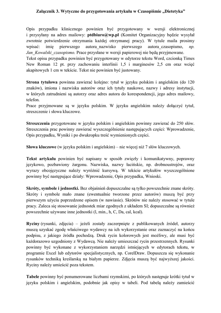 Załącznik 3. Wytyczne do przygotowania artykułu w Czasopiśmie „Dietetyka” Opis przypadku klinicznego powinien być przygotowany w wersji elektronicznej i przysyłany na adres mailowy: [email protected] (Komitet Organizacyjny będzie wysyłał zwrotnie potwierdzenie otrzymania każdej otrzymanej pracy). W tytule maila prosimy wpisać: imię pierwszego autora_nazwisko pierwszego autora_czasopismo, np. Jan_Kowalski_czasopismo. Prace przysłane w wersji papierowej nie będą przyjmowane. Tekst opisu przypadku powinien być przygotowany w edytorze tekstu Word, czcionką Times New Roman 12 pt. przy zachowaniu interlinii 1,5 i marginesów 2,5 cm oraz wcięć akapitowych 1 cm w tekście. Tekst nie powinien być justowany. Strona tytułowa powinna zawierać kolejno: tytuł w języku polskim i angielskim (do 120 znaków), imiona i nazwiska autorów oraz ich tytuły naukowe, nazwy i adresy instytucji, w których zatrudnieni są autorzy oraz adres autora do korespondencji, jego adres mailowy, telefon. Prace przyjmowane są w języku polskim. W języku angielskim należy dołączyć tytuł, streszczenie i słowa kluczowe. Streszczenia przygotowane w języku polskim i angielskim powinny zawierać do 250 słów. Streszczenia prac powinny zawierać wyszczególnienie następujących części: Wprowadzenie, Opis przypadku, Wyniki i po dwukropku treść wymienionych części. Słowa kluczowe (w języku polskim i angielskim) – nie więcej niż 7 słów kluczowych. Tekst artykułu powinien być napisany w sposób zwięzły i komunikatywny, poprawny językowo, pozbawiony żargonu. Nazwiska, nazwy łacińskie, np. drobnoustrojów, oraz wyrazy obcojęzyczne należy wyróżnić kursywą. W tekście artykułów wyszczególnione powinny być następujące działy: Wprowadzenie, Opis przypadku, Wnioski. Skróty, symbole i jednostki. Bez objaśnień dopuszczalne są tylko powszechnie znane skróty. Skróty i symbole mało znane (ewentualnie tworzone przez autorów) muszą być przy pierwszym użyciu poprzedzone opisem (w nawiasie). Skrótów nie należy stosować w tytule pracy. Zaleca się stosowanie jednostek miar zgodnych z układem SI; dopuszczalne są również powszechnie używane inne jednostki (l, min., h, C, Da, cal, kcal). Ryciny (rysunki, zdjęcia) – jeżeli zostały zaczerpnięte z publikowanych źródeł, autorzy muszą uzyskać zgodę właściwego wydawcy na ich wykorzystanie oraz zaznaczyć na końcu podpisu, z jakiego źródła pochodzą. Druk rycin kolorowych jest możliwy, ale musi być każdorazowo uzgodniony z Wydawcą. Nie należy umieszczać rycin przestrzennych. Rysunki powinny być wykonane z wykorzystaniem narzędzi istniejących w edytorach tekstu, w programie Excel lub edytorów specjalistycznych, np. CorelDraw. Dopuszcza się wykonanie rysunków techniką kreślarską na białym papierze. Zdjęcia muszą być najwyższej jakości. Ryciny należy umieścić poza tekstem. Tabele powinny być ponumerowane liczbami rzymskimi, po których następuje krótki tytuł w języku polskim i angielskim, podobnie jak opisy w tabeli. Pod tabelą należy zamieścić wyjaśnienie skrótów używanych w tabeli. Powinny one uzupełniać, a nie powtarzać informacji zawartych w tekście.. Tabele umieszczamy poza tekstem. Piśmiennictwo należy cytować podając w tekście kolejne numery w nawiasach kwadratowych [1,2]. Informacje niepublikowane można przytaczać podając źródła informacji w tekście (w nawiasie). Kolejność pozycji piśmiennictwa powinna być zgodna z kolejnością cytowań, a nie z porządkiem alfabetycznym. Skróty tytułów cytowanych czasopism muszą być zgodne z Index Medicus. Każda pozycja piśmiennictwa powinna zawierać: Nazwiska i inicjały imion autorów, (jeżeli praca ma więcej niż trzech autorów należy dodać „i wsp.”). Tytuł artykułu. Skrót tytułu czasopisma. Rok publikacji; Numer tomu (ew. numer zeszytu): Numery stron (początkowy i końcowy). Przykłady: 1. Chlebanowska E, Gawęcki J. Wpływ wiedzy o żywieniu na upodobania pokarmowe młodzieży szkół średnich. Przegl Gastronom 1986; 4: 20-23. 2. Czarnocińska J, Przysławski J, Babich-Zielińska E i wsp. Analiza preferencji osób dorosłych w zakresie produktów pochodzenia roślinnego w aspekcie profilaktyki chorób dietozależnych. Now Lek 2005; 74 (4): 379-383. Pozycje książkowe powinny zawierać w kolejności: Nazwiska i inicjały imion autorów (książki lub rozdziału). [Tytuł rozdziału. (w)] Tytuł książki. [nazwiska i inicjały imion redaktora (red.)]. Wydawnictwo, Miejsce wydania Rok: Numery stron. Przykłady: 1. Ciborowska H, Rudnicka A. Dietetyka. Żywienie zdrowego i chorego człowieka. Wyd. Lek. PZWL, Warszawa 2000. 2. Roszkowski W. Żywienie osób starszych, (w) Hasik J, Gawędki J. (red.) Żywienie człowieka zdrowego i chorego. Wyd. Nauk. PWN, Warszawa 2000: 86-94. Prawa pacjenta i zgoda pacjenta na badanie. Wszystkie prace oryginalne muszą spełniać wymogi Deklaracji Helsińskiej z 1989 r. W uzasadnionych przypadkach musi być załączona informacja o zgodzie Komisji Bioetycznej na przeprowadzenie badania lub przesłanie odpowiedniej dokumentacji. W opisie przypadków kazuistycznych obowiązuje zakaz podawania danych personalnych, chyba że chory wyraża na to świadomie zgodę, np. publikowanie zdjęć. Prawa autorskie. Każdy manuskrypt musi zawierać podpisane przez wszystkich autorów oświadczenie: “Oświadczamy, że artykuł jest oryginalny, nie narusza praw autorskich ani innych praw własności stron trzecich; nie jest złożony do publikacji w innym czasopiśmie i nie był uprzednio publikowany. Po ukazaniu się publikacji podpisany(i) autor(rzy) przekazuje(ą) wszystkie prawa autorskie pracy (tytuł artykułu) Polskiemu Towarzystwu Dietetyki. Guest autorship, ghostwriting. Przypominamy, że tzw. guest autorship (umieszczenie jako autora pracy osoby, która nie brała udziału w jej przygotowywaniu bądź której udział był minimalny), a także tzw. ghos