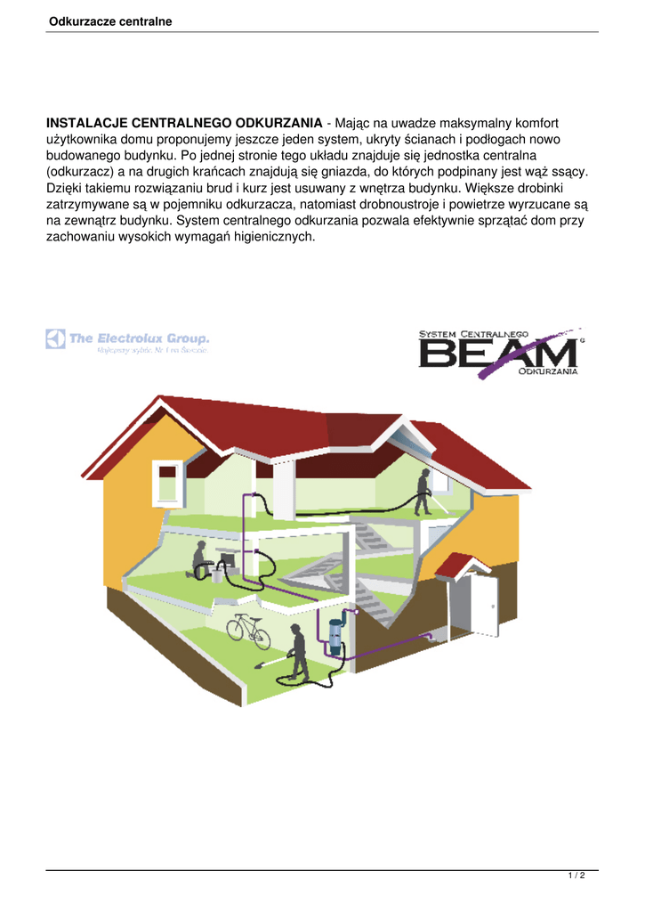 Odkurzacze centralne INSTALACJE CENTRALNEGO ODKURZANIA - Mając na uwadze maksymalny komfort użytkownika domu proponujemy jeszcze jeden system, ukryty ścianach i podłogach nowo budowanego budynku. Po jednej stronie tego układu znajduje się jednostka centralna (odkurzacz) a na drugich krańcach znajdują się gniazda, do których podpinany jest wąż ssący. Dzięki takiemu rozwiązaniu brud i kurz jest usuwany z wnętrza budynku. Większe drobinki zatrzymywane są w pojemniku odkurzacza, natomiast drobnoustroje i powietrze wyrzucane są na zewnątrz budynku. System centralnego odkurzania pozwala efektywnie sprzątać dom przy zachowaniu wysokich wymagań higienicznych. 1/2 Odkurzacze centralne 2/2