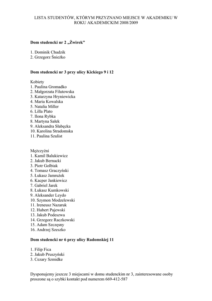 LISTA STUDENTÓW, KTÓRYM PRZYZNANO MIEJSCE W AKADEMIKU W ROKU AKADEMICKIM 2008/2009 Dom studencki nr 2 „Żwirek” 1. Dominik Chudzik 2. Grzegorz Śnieżko Dom studencki nr 3 przy ulicy Kickiego 9 i 12 Kobiety 1. Paulina Gromadko 2. Małgorzata Filutowska 3. Katarzyna Hryniewicka 4. Maria Kowalska 5. Natalia Miller 6. Lilla Plato 7. Ilona Rybka 8. Martyna Sałek 9. Aleksandra Słabęcka 10. Karolina Stradomska 11. Paulina Szulist Mężczyźni 1. Kamil Balukiewicz 2. Jakub Bernacki 3. Piotr Golbiak 4. Tomasz Graczyński 5. Łukasz Jamrużek 6. Kacper Jankiewicz 7. Gabriel Jarek 8. Łukasz Kumkowski 9. Aleksander Leydo 10. Szymon Modzelewski 11. Ireneusz Nazaruk 12. Hubert Pajewski 13. Jakub Podeszwa 14. Grzegorz Raczkowski 15. Adam Szczęsny 16. Andrzej Szeszko Dom studencki nr 6 przy ulicy Radomskiej 11 1. Filip Fica 2. Jakub Pruszyński 3. Cezary Szmidke Dysponujemy jeszcze 3 miejscami w domu studenckim nr 3, zainteresowane osoby proszone są o szybki kontakt pod numerem 669-412-587