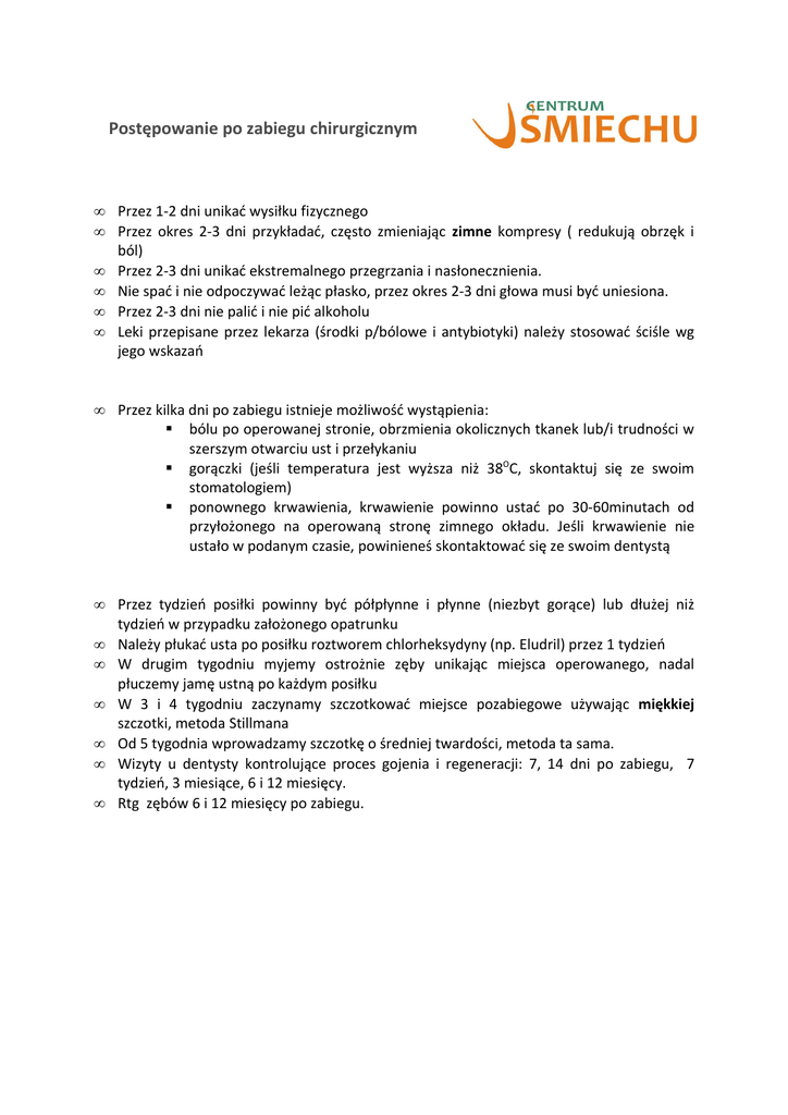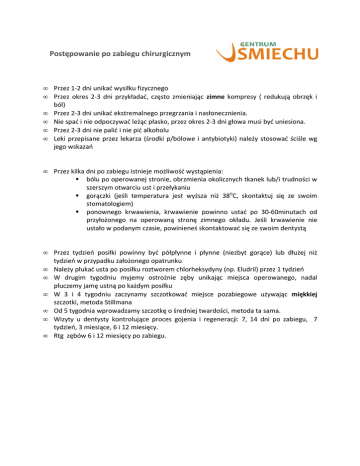 Postępowanie po zabiegu chirurgicznym • • • • • • Przez 1-2 dni unikać wysiłku fizycznego Przez okres 2-3 dni przykładać, często zmieniając zimne kompresy ( redukują obrzęk i ból) Przez 2-3 dni unikać ekstremalnego przegrzania i nasłonecznienia. Nie spać i nie odpoczywać leżąc płasko, przez okres 2-3 dni głowa musi być uniesiona. Przez 2-3 dni nie palić i nie pić alkoholu Leki przepisane przez lekarza (środki p/bólowe i antybiotyki) należy stosować ściśle wg jego wskazań • Przez kilka dni po zabiegu istnieje możliwość wystąpienia: bólu po operowanej stronie, obrzmienia okolicznych tkanek lub/i trudności w szerszym otwarciu ust i przełykaniu gorączki (jeśli temperatura jest wyższa niż 38OC, skontaktuj się ze swoim stomatologiem) ponownego krwawienia, krwawienie powinno ustać po 30-60minutach od przyłożonego na operowaną stronę zimnego okładu. Jeśli krwawienie nie ustało w podanym czasie, powinieneś skontaktować się ze swoim dentystą • Przez tydzień posiłki powinny być półpłynne i płynne (niezbyt gorące) lub dłużej niż tydzień w przypadku założonego opatrunku Należy płukać usta po posiłku roztworem chlorheksydyny (np. Eludril) przez 1 tydzień W drugim tygodniu myjemy ostrożnie zęby unikając miejsca operowanego, nadal płuczemy jamę ustną po każdym posiłku W 3 i 4 tygodniu zaczynamy szczotkować miejsce pozabiegowe używając miękkiej szczotki, metoda Stillmana Od 5 tygodnia wprowadzamy szczotkę o średniej twardości, metoda ta sama. Wizyty u dentysty kontrolujące proces gojenia i regeneracji: 7, 14 dni po zabiegu, 7 tydzień, 3 miesiące, 6 i 12 miesięcy. Rtg zębów 6 i 12 miesięcy po zabiegu. • • • • • •