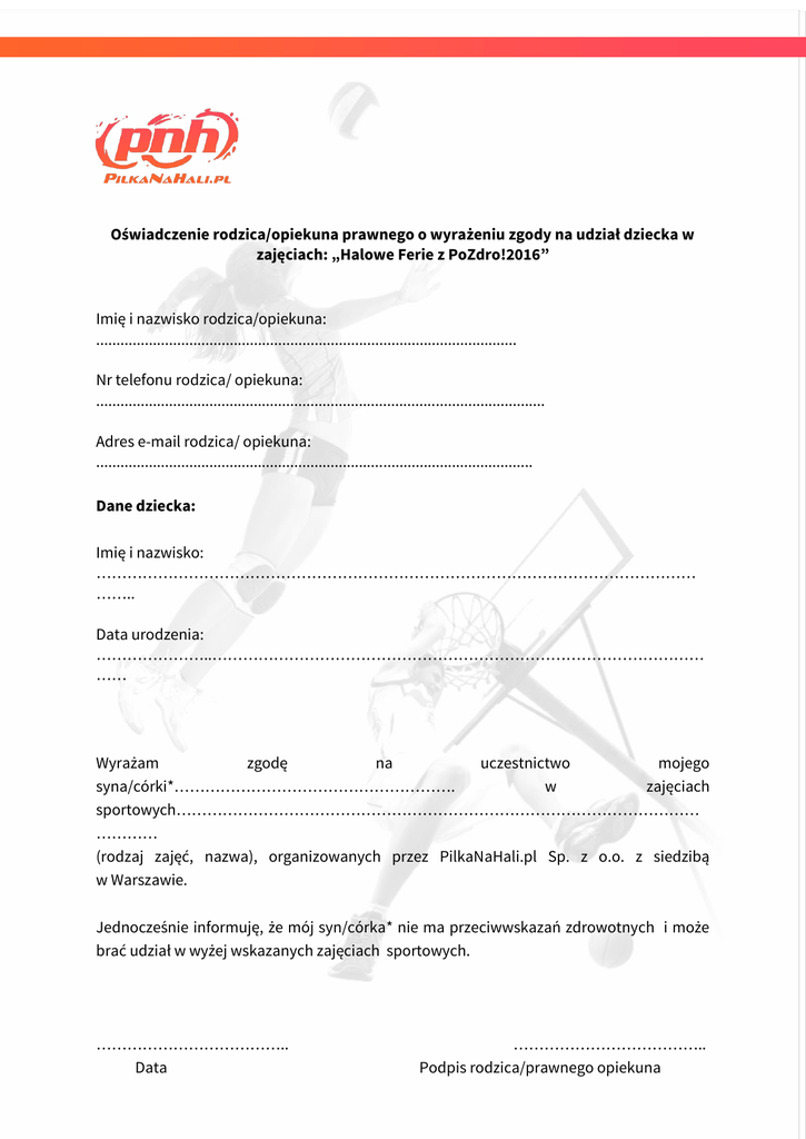 Oświadczenie rodzica/opiekuna prawnego o wyrażeniu zgody na udział dziecka w zajęciach: „Halowe Ferie z PoZdro!2016” Imię i nazwisko rodzica/opiekuna: ........................................................................................................ Nr telefonu rodzica/ opiekuna: ............................................................................................................... Adres e-mail rodzica/ opiekuna: ............................................................................................................ Dane dziecka: Imię i nazwisko: ……………………………………………………………………………………………………… …….. Data urodzenia: …………………..…………………………………………………………………………………… …… Wyrażam zgodę na uczestnictwo mojego syna/córki*………………………………………………. w zajęciach sportowych………………………………………………………………………………………… ………… (rodzaj zajęć, nazwa), organizowanych przez PilkaNaHali.pl Sp. z o.o. z siedzibą w Warszawie. Jednocześnie informuję, że mój syn/córka* nie ma przeciwwskazań zdrowotnych i może brać udział w wyżej wskazanych zajęciach sportowych. ……………………………….. Data *Niepotrzebne skreślić ……………………………….. Podpis rodzica/prawnego opiekuna