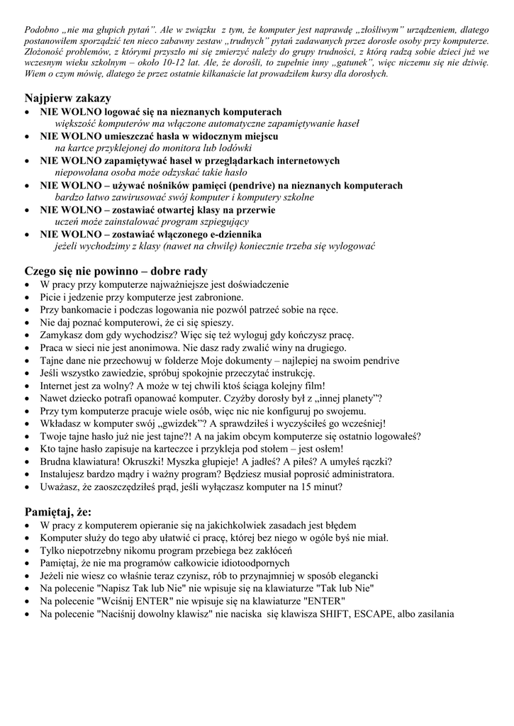 Podobno „nie ma głupich pytań”. Ale w związku z tym, że komputer jest naprawdę „złośliwym” urządzeniem, dlatego postanowiłem sporządzić ten nieco zabawny zestaw „trudnych” pytań zadawanych przez dorosłe osoby przy komputerze. Złożoność problemów, z którymi przyszło mi się zmierzyć należy do grupy trudności, z którą radzą sobie dzieci już we wczesnym wieku szkolnym – około 10-12 lat. Ale, że dorośli, to zupełnie inny „gatunek”, więc niczemu się nie dziwię. Wiem o czym mówię, dlatego że przez ostatnie kilkanaście lat prowadziłem kursy dla dorosłych. Najpierw zakazy NIE WOLNO logować się na nieznanych komputerach większość komputerów ma włączone automatyczne zapamiętywanie haseł NIE WOLNO umieszczać hasła w widocznym miejscu na kartce przyklejonej do monitora lub lodówki NIE WOLNO zapamiętywać haseł w przeglądarkach internetowych niepowołana osoba może odzyskać takie hasło NIE WOLNO – używać nośników pamięci (pendrive) na nieznanych komputerach bardzo łatwo zawirusować swój komputer i komputery szkolne NIE WOLNO – zostawiać otwartej klasy na przerwie uczeń może zainstalować program szpiegujący NIE WOLNO – zostawiać włączonego e-dziennika jeżeli wychodzimy z klasy (nawet na chwilę) koniecznie trzeba się wylogować Czego się nie powinno – dobre rady W pracy przy komputerze najważniejsze jest doświadczenie Picie i jedzenie przy komputerze jest zabronione. Przy bankomacie i podczas logowania nie pozwól patrzeć sobie na ręce. Nie daj poznać komputerowi, że ci się spieszy. Zamykasz dom gdy wychodzisz? Więc się też wyloguj gdy kończysz pracę. Praca w sieci nie jest anonimowa. Nie dasz rady zwalić winy na drugiego. Tajne dane nie przechowuj w folderze Moje dokumenty – najlepiej na swoim pendrive Jeśli wszystko zawiedzie, spróbuj spokojnie przeczytać instrukcję. Internet jest za wolny? A może w tej chwili ktoś ściąga kolejny film! Nawet dziecko potrafi opanować komputer. Czyżby dorosły był z „innej planety”? Przy tym komputerze pracuje wiele osób, więc nic nie konfiguruj po swojemu. Wkładasz w komputer swój „gwizdek”? A sprawdziłeś i wyczyściłeś go wcześniej! Twoje tajne hasło już nie jest tajne?! A na jakim obcym komputerze się ostatnio logowałeś? Kto tajne hasło zapisuje na karteczce i przykleja pod stołem – jest osłem! Brudna klawiatura! Okruszki! Myszka głupieje! A jadłeś? A piłeś? A umyłeś rączki? Instalujesz bardzo mądry i ważny program? Będziesz musiał poprosić administratora. Uważasz, że zaoszczędziłeś prąd, jeśli wyłączasz komputer na 15 minut? Pamiętaj, że: W pracy z komputerem opieranie się na jakichkolwiek zasadach jest błędem Komputer służy do tego aby ułatwić ci pracę, której bez niego w ogóle byś nie miał. Tylko niepotrzebny nikomu program przebiega bez zakłóceń Pamiętaj, że nie ma programów całkowicie idiotoodpornych Jeżeli nie wiesz co właśnie teraz czynisz, rób to przynajmniej w sposób elegancki Na polecenie "Napisz Tak lub Nie" nie wpisuje się na klawiaturze "Tak lub Nie" Na polecenie "Wciśnij ENTER" nie wpisuje się na klawiaturze "ENTER" Na polecenie "Naciśnij dowolny klawisz" nie naciska się klawisza SHIFT, ESCAPE, albo zasilania Gdzie jest Internet? Prawdopodobnie chodzi o to, że na pulpicie nie widać ikony, za pomocą której można uruchomić przeglądarkę internetową. Najpopularniejsze przeglądarki pokazują poniższe obrazki. Windows XP Rozwiązanie: nie ma na pulpicie, trzeba szukać tych ikon w menu START (najczęściej w lewym dolnym rogu ekranu Klikam dwa razy, a się nie otwiera. Windows 7 Prawidłowo wykonane podwójne kliknięcie, którym to otwieramy program musi spełniać trzy warunki: należy je wykonać szybko (dwa szybkie kliknięcia lewym przyciskiem) nie wolno podczas klikania przesunąć myszką (wskaźnik nie może poruszyć się na ekranie) czubek strzałki musi znajdować się na ikonie, którą klikamy Być może to i tak nie pomoże, bo myszka potrafi być złośliwa, więc najlepiej kliknąć w ikonę jeden raz i nacisnąć klawisz ENTER Po co tak dużo ikon na pulpicie? Na to pytanie nie ma prostej i jasnej odpowiedzi. Każdy użytkownik urządza sobie pulpit - biurko po swojemu. Należy pamiętać o tym, że im więcej ikon na pulpicie, to trudniej cokolwiek znaleźć, a i sam system zaczyna mieć problemy – zauważalnie dłużej się uruchamia Wpisałem w przeglądarce „wirtualna,pl”, i nic?! Mamy tutaj do czynienia z dwoma problemami. Jeżeli użytkownik wpisał w pasku adresu taki napis „wirtualna,polska”, to nie ma się co dziwić, że system nic nie znalazł. Powinno się wpisać adres prawidłowy „wp.pl” i wcisnąć ENTER. Jeżeli natomiast użytkownik wpisał napis „wirtualna,polska”, w okienku wyszukiwarki, najczęściej GOOGLE, to taż automatycznie nie otworzy się strona „wp.pl” ale być może wyszukiwarka w swej niezmierzonej mądrości domyśli się co użytkownik miał na myśli i pokaże wśród znalezionych stron (być może na samej górze” stronę wirtualnej polski. Gdzie jest szkolna strona WWW? Nie zna się adresu szkolnej strony WWW. Bardzo nieładnie! Dla przypomnienia adres szkolnej strony WWW, to ZSO.BOBOWA.EU. Pisze się małymi literami, ale ja tak specjalnie, żeby się bardziej utrwaliło. Można też oczywiście skorzystać z przeglądarki np GOOGLE i wpisać np. hasła: „Bobowa, liceum”, na pewno znajdzie. Dlaczego takie małe okienko e-dziennika? Żeby okienko (każde okienko) się powiększyło (najlepiej na cały ekran) należy kliknąć, taki mały kwadracik (jeden z trzech) w prawym, górnym rogu tego okienka (ten w środku). Dlaczego wyskakują same duże literki? A to jest bardzo skomplikowana sprawa. Najprawdopodobniej i przez zupełny przypadek ktoś wcisnął na klawiaturze klawisz CapsLook, z lewej strony, nad klawiszem SHIFT. Wystarczy go wcisnąć jeszcze raz i g