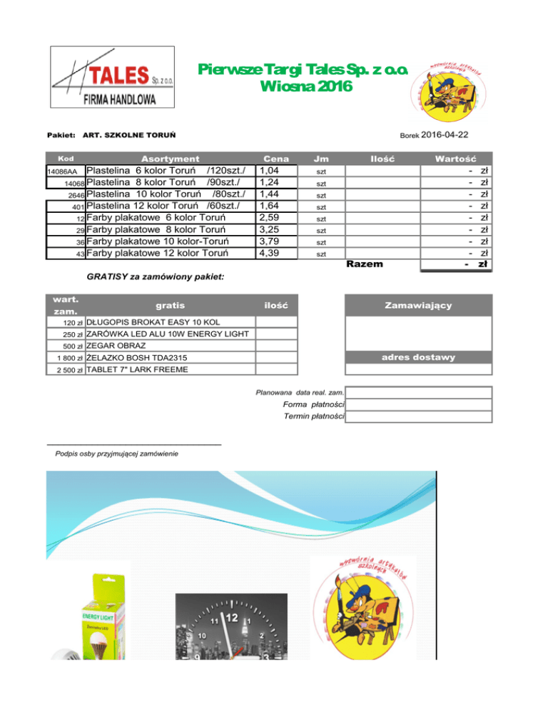 PierwszeTargi TalesSp. z o.o. Wiosna 2016 Pakiet: Kod ART. SZKOLNE TORUŃ Asortyment Plastelina 6 kolor Toruń /120szt./ /90szt./ 14068 Plastelina 8 kolor Toruń /80szt./ 2646 Plastelina 10 kolor Toruń 401 Plastelina 12 kolor Toruń /60szt./ 12 Farby plakatowe 6 kolor Toruń 29 Farby plakatowe 8 kolor Toruń 36 Farby plakatowe 10 kolor-Toruń 43 Farby plakatowe 12 kolor Toruń 14086AA Borek 2016-04-22 Cena 1,04 1,24 1,44 1,64 2,59 3,25 3,79 4,39 Jm Ilość Wartość szt szt szt szt szt szt szt szt Razem - GRATISY za zamówiony pakiet: wart. zam. gratis ilość Zamawiający 120 zł DŁUGOPIS BROKAT EASY 10 KOL 250 zł ZARÓWKA LED ALU 10W ENERGY LIGHT 500 zł ZEGAR OBRAZ adres dostawy 1 800 zł ŻELAZKO BOSH TDA2315 2 500 zł TABLET 7" LARK FREEME Planowana data real. zam. Forma płatności Termin płatności _______________________________ Podpis osby przyjmującej zamówienie - zł zł zł zł zł zł zł zł zł