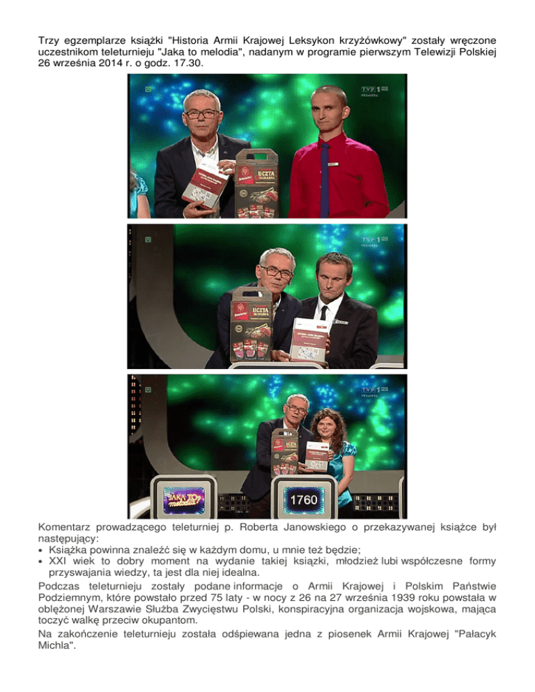 Trzy egzemplarze ksiąŜki "Historia Armii Krajowej Leksykon krzyŜówkowy" zostały wręczone uczestnikom teleturnieju "Jaka to melodia", nadanym w programie pierwszym Telewizji Polskiej 26 września 2014 r. o godz. 17.30. Komentarz prowadzącego teleturniej p. Roberta Janowskiego o przekazywanej ksiąŜce był następujący: • KsiąŜka powinna znaleźć się w kaŜdym domu, u mnie teŜ będzie; • XXI wiek to dobry moment na wydanie takiej ksiązki, młodzieŜ lubi współczesne formy przyswajania wiedzy, ta jest dla niej idealna. Podczas teleturnieju zostały podane informacje o Armii Krajowej i Polskim Państwie Podziemnym, które powstało przed 75 laty - w nocy z 26 na 27 września 1939 roku powstała w oblęŜonej Warszawie SłuŜba Zwycięstwu Polski, konspiracyjna organizacja wojskowa, mająca toczyć walkę przeciw okupantom. Na zakończenie teleturnieju została odśpiewana jedna z piosenek Armii Krajowej "Pałacyk Michla".