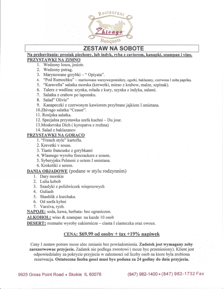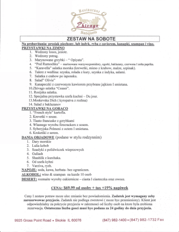 ^estaura/^ \\ iuaqo ^ Banquet ZESTAW MA SOBOTE" ~ Na przhuvitania: prosiak piechony, lub indyk, ryba z caviorem, kanapki, szampan i vino. PRZYSTAWKINA ZIMNQ 1. Wedzony losos, jesiotr. 2. Wedzony pstrag. 3. Marynowane grzybki - " Opiyata". 4. "Pod Rumochku" — mari no wane warzywa:pomidory, ogorki, baklazany, czerwona I zolta paprika. 5. "Karavella" salatka morska (krewetki, mieso z krabow, maize, szpinak). 6. Talerz z wedlina: szynka, rolada z kury, szynka z indyka, salami. 7. Salatka z crabow po iaponsku. 8. Salad" Olivie" 9. Kanapeczki z czerwonym kawiorem przybrane jajkiem I smietana. 10.Zhivago salatka "Ceaser". 11. Rosijska salatka. 12. Specjalna przystawka szefa kuchni - Du jour. 13.Moskevska Dich (kyropatva z rozhna) 14. Salad z baklazanov PRZYSTAWKI NA GQRACQ 1. "French style" kartofla. 2. Krevetki v souse. 3. Tiasto francuske z gzrybkami 4. Wlasnego wyrobu firecrackers z sosem. 5. Syberyjska Pelmeni z octem I smietana. 6. Kroketiki z serem. DANIA OBJADOWE (podane w stylu rodzynnim) 1. Dary morskie 2. Lulia kebob 3. Szaslyki z polidwiczek wieprzowych 4. Guliash 5. Shashlik z kurchaka. 6. Od szefa kyhni 7. Varziva, ryzh. NAPOJE: soda, kawa, herbata- bez ograniczen. ALKOHOL: wino & szampan na kazde 10 osob DESERT: rozmaite wyroby cukiemicze - ciasta I ciasteczka oraz owoce. CENA: $69,99 od osoby + tax +19% napiwek Ceny I zestaw potraw moze ulec zmianie bez powiadomienia. Zadatek jest wymagany zeby zarezerwowac przyjecie. Zadatek nie podlega zwrotowi (moze bye przeniesiony). Klient jest odpowiedzialny za pokrycie przyjecia w zaleznosci od iiczby osob na ktore byla zrobiona rezerwacja. Ostateczna liezba gosci musi bye podana za 24 godiny do dnia przyjecia. 9925 Gross Point Road • Skokie IL 60076 (847) 982-1400 • (847) 982-1732 Fax