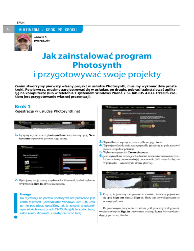 EFUN 18 multimedia / krok po kroku Janusz S. Wierzbicki Jak zainstalować program Photosynth i przygotowywać swoje projekty Zanim stworzymy pierwszy własny projekt w usłudze Photosynth, musimy wykonać dwa proste kroki. Po pierwsze, musimy zarejestrować się w usłudze, po drugie, pobrać i zainstalować aplikację na komputerze (lub w telefonie z systemem Windows Phone 7.5+ lub iOS 4.0+). Trzecim krokiem jest przygotowanie własnej prezentacji. Krok 1 1. Łączymy się z serwisem photosynth.net i wybieramy opcję New Account w prawym górnym rogu strony. 3. Wymyślamy i wpisujemy nazwę dla swojego konta. 4. Wpisujemy krótki opis naszego profilu (możemy to pole zostawić puste i uzupełnić później). 5. Wybieramy przycisk Create Account. 6. Jeśli wymyślona nazwa jest błędna lub zawiera niedozwolone znaki, zostaniemy poproszeni o jej poprawienie. Jeśli wszystko będzie w porządku – wrócimy do strony głównej. 2. Wpisujemy swoją nazwę użytkownika Microsoft, hasło i wybieramy przycisk Sign in, aby się zalogować. 7. O tym, że jesteśmy zalogowani w serwisie, świadczy pojawienie Uwaga się opcji Sign out zamiast Sign in. Służy ona do wylogowania się ze swojego konta. - Po ponownym połączeniu ze stroną, jeśli jesteśmy wylogowani, wybieramy opcję Sign in i używamy swojego konta Microsoft podając jego nazwę i hasło. WRZESIEŃ/PAŹDZIERNIK 2012 19 Krok 2 - 1. Łączymy się z serwisem photosynth.net i wybieramy opcję Create w prawym górnym rogu strony. 5. Po uruchomieniu instalatora wybieramy przycisk Next. 2. Wybieramy program Photosynth (przeznaczony dla systemów Windows XP i wyższych). 3. Zatwierdzamy, że chcemy uruchomić program po pobraniu wybierając przycisk Uruchom. 4. Na tej stronie możemy pobrać także wersję programu dla telefonów komórkowych z systemem Windows Phone lub iOS. W tym celu najlepiej połączyć się ze stroną na danym urządzeniu. 6. W oknie End-User License Agreement po zapoznaniu się z licencją wybieramy opcję I accept the terms in the License Agreement. 7. Wybieramy przycisk Next. EFUN 20 Krok 3 Przed przystąpieniem do wykonania projektu powinniśmy zgromadzić odpowiednio przygotowane zdjęcia. Zapoznaj się ze wskazówkami zamieszczonymi w artykule pt. „Jak tworzyć superprojekty z pomocą Photosynth”, aby przygotować jak najlepsze zdjęcia. Zapisz je w pojedynczym folderze – ułatwi to dalszą pracę. 8. W oknie Ready to Install rozpoczynamy instalację wybierając przycisk Install. 1. W menu Start odnajdujemy folder Photosynth i uruchamiamy z niego program Photosynth. 9. W oknie Kontrola konta użytkownika, jeśli się pojawi, wybieramy przycisk Tak, aby umożliwić instalację programu. 2. Wpisujemy swoją nazwę użytkownika Microsoft, hasło i wybieramy przycisk Sign in, aby się zalogować w usłudze Photosynth.net. 3. Jeśli pracujemy na własnym komputerze, do którego nikt poza 10. W oknie Setup completed successfully wybieramy przycisk Finish. Instalacja zakończyła się pomyślnie i możemy rozpocząć korzystanie z aplikacji. nami nie ma dostępu, możemy zaznaczyć opcję Remember me on this computer (zapamiętaj mnie na tym komputerze) oraz Remember my password (zapamiętaj moje hasło). Jeśli jednak więcej osób korzysta z danego komputera – nie powinniśmy zaznaczać tych opcji. 4. Wybieramy przycisk Sign In. WRZESIEŃ/PAŹDZIERNIK 2012 21 5. Wybieramy przycisk Add Photos, aby dodać zdjęcia do naszego projektu. 7. W polu Name and thumbnail określamy nazwę swojego projektu. 8. W polu Tags opisujemy projekt za pomocą słów kluczowych (tzw. tagów określających, czego dotyczy). 9. W polu Description wpisujemy krótką charakterystykę tego projektu. 10. Wybieramy z listy rozwijanej Visability – czy projekt ma być widoczny na liście (opcja Public), czy też mają mieć do niego dostęp tylko te osoby, którym udostępnimy link (opcja Unlisted). 11. Wybieramy z listy rozwijanej Photo Rights rodzaj licencji, której chcemy udzielić do swojej pracy (zdjęć). Możemy zastrzec wszystkie prawa (All Rights Reserved) lub udzielić licencji Creative Commons. 6. Odszukujemy folder ze zdjęciami, zaznaczamy wszystkie, których chcemy użyć (np. wskazując je po kolei lewym przyciskiem myszy z wciśniętym klawiszem CTRL). Następnie wybieramy przycisk Otwórz. 12. Rozpoczynamy generowanie pokazu wybierając przycisk Synth. 13. Po zakończeniu procesu łączenia zdjęć i generowania scenerii możemy zobaczyć nasz projekt wybierając przycisk View przy jego nazwie. EFUN 22 14. Na stronie projektu możemy przejrzeć i uzupełnić jego nazwę, opis oraz zmienić parametry dotyczące widoczności projektu dla innych osób. 15. Następnie możemy wybrać opcję Highlights, by utworzyć listę zbliżeń najważniejszych szczegółów lub interesujących fragmentów naszego projektu. 18. Doprecyzowujemy, co ma być wyróżnione na zbliżeniu. 19. Uzupełniamy opis nowego zbliżenia podając w formularzu jego nazwę (Title) i ewentualny opis (Caption). Wybieramy następnie przycisk Add. Czynność możemy powtórzyć wielokrotnie dodając do listy kolejne zbliżenia. Na koniec należy zapamiętać zmiany wybierając przycisk Save. Wskazówka - 20. Jeśli wprowadzone zmiany nam odpowiadają, możemy wybrać przycisk Exit – wyjdziemy w ten sposób z trybu edycji i zobaczymy projekt tak, jak będą go widzieli inni użytkownicy. 16. Przy użyciu przycisków sterowania ustawiamy zbliżenie na żądany obiekt. celu utworzenia nowego wpisu na liście wybieramy New Highlight. 17. W Strona usługi Photosynth.net – najważniejsze elementy interfejsu.
