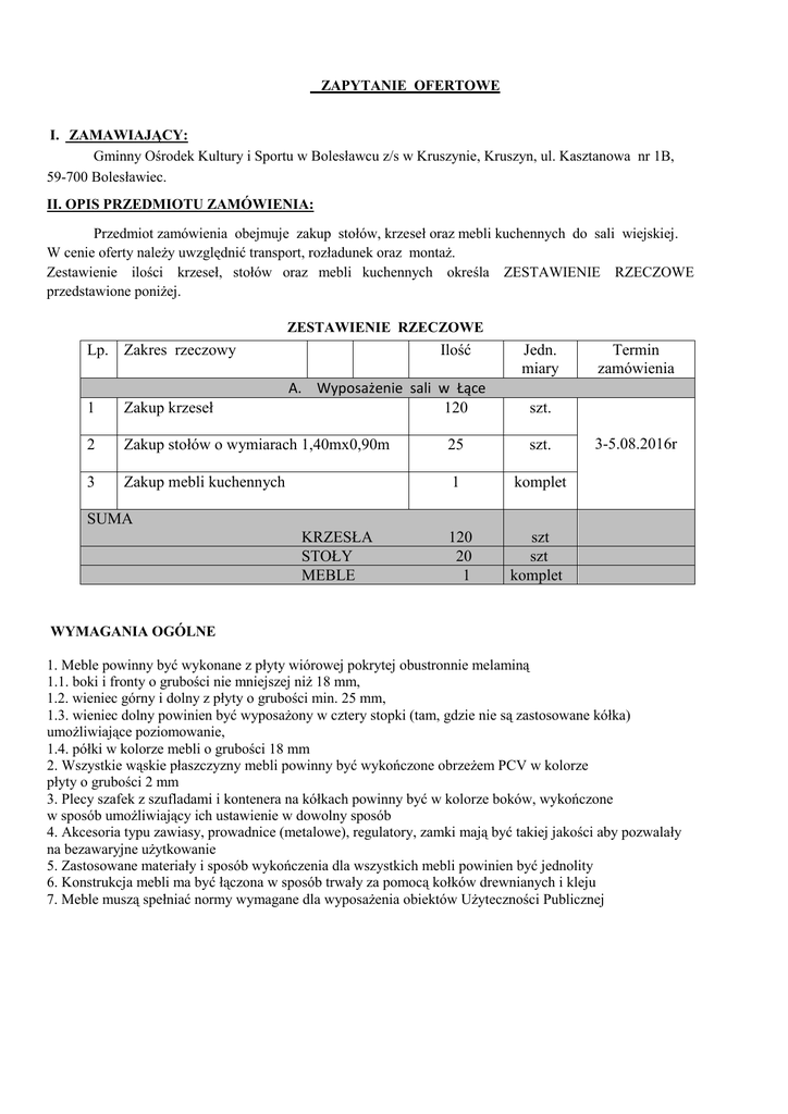 ZAPYTANIE OFERTOWE I. ZAMAWIAJĄCY: Gminny Ośrodek Kultury i Sportu w Bolesławcu z/s w Kruszynie, Kruszyn, ul. Kasztanowa nr 1B, 59-700 Bolesławiec. II. OPIS PRZEDMIOTU ZAMÓWIENIA: Przedmiot zamówienia obejmuje zakup stołów, krzeseł oraz mebli kuchennych do sali wiejskiej. W cenie oferty należy uwzględnić transport, rozładunek oraz montaż. Zestawienie ilości krzeseł, stołów oraz mebli kuchennych określa ZESTAWIENIE RZECZOWE przedstawione poniżej. ZESTAWIENIE RZECZOWE Lp. Zakres rzeczowy Ilość A. Wyposażenie sali w Łące 120 Jedn. miary 1 Zakup krzeseł 2 Zakup stołów o wymiarach 1,40mx0,90m 25 szt. 3 Zakup mebli kuchennych 1 komplet 120 20 1 szt szt komplet Termin zamówienia szt. 3-5.08.2016r SUMA KRZESŁA STOŁY MEBLE WYMAGANIA OGÓLNE 1. Meble powinny być wykonane z płyty wiórowej pokrytej obustronnie melaminą 1.1. boki i fronty o grubości nie mniejszej niż 18 mm, 1.2. wieniec górny i dolny z płyty o grubości min. 25 mm, 1.3. wieniec dolny powinien być wyposażony w cztery stopki (tam, gdzie nie są zastosowane kółka) umożliwiające poziomowanie, 1.4. półki w kolorze mebli o grubości 18 mm 2. Wszystkie wąskie płaszczyzny mebli powinny być wykończone obrzeżem PCV w kolorze płyty o grubości 2 mm 3. Plecy szafek z szufladami i kontenera na kółkach powinny być w kolorze boków, wykończone w sposób umożliwiający ich ustawienie w dowolny sposób 4. Akcesoria typu zawiasy, prowadnice (metalowe), regulatory, zamki mają być takiej jakości aby pozwalały na bezawaryjne użytkowanie 5. Zastosowane materiały i sposób wykończenia dla wszystkich mebli powinien być jednolity 6. Konstrukcja mebli ma być łączona w sposób trwały za pomocą kołków drewnianych i kleju 7. Meble muszą spełniać normy wymagane dla wyposażenia obiektów Użyteczności Publicznej Charakterystyka krzeseł Krzesła tapicerowane, stelaż drewniany z drewna jednolitego bukowego. Kolor wybarwienia oraz siedzisko i oparcie z tkaniny o deseniu uzgodnionym z Zamawiającym. - ilość – 120 szt. - szerokości siedziska 440- 430mm - głębokość siedziska bez oparcia 400-440mm - wysokość do 990mm - wysokość siedziska od podłogi do 450-490mm - tapicerowane siedzisko i oparcie Oparcie pleców zakończone w sposób umożliwiający powieszenie np. torebki. Nogi podklejone filcem. Wszystkie wymiary są wymiarami zewnętrznymi. Wybór kolorystyki tapicerki i stelażu do poszczególnych sal nastąpi w dniu podpisania umowy - dostawca w złożonej ofercie powinien zaprezentować katalog kolorów, z którego Zamawiający dokona ostatecznego wyboru koloru. Kolor nie może mieć wpływu na cenę oferty. Przykładowe zdjęcie w załączniku. Charakterystyka stołów ze składanymi nogami 140mm x 90mm - Wymiary: 1,40m x0,90m - ilość – 25szt. - blat stołu - grubość 28mm - stelaż chromowany - wysokość stelaża 70 cm, szer. podstawy min.60 cm - nogi składane pod spód blatu - wybór kolorystyki blatu i stelaża do poszczególnych sal nastąpi w dniu podpisania umowy - dostawca w ofercie powinien zaprezentować katalog kolorów, z którego Zamawiający dokona ostatecznego wyboru koloru. Kolor nie może mieć wpływu na cenę oferty. Przykładowe zdjęcie w załączniku. Charakterystyka mebli kuchennych: Meble kuchenne o długości 200cm 2.1. szafki dolne 2x 80 cm, 1x40 cm z szufladami, przykryte jednym blatem 2.2. szafki górne wiszące 2x80 cm, 1x 40 cm, 2.3. szuflady na prowadnicach 2.4. blat laminat o grubości 3 cm i szerokości 60 cm 2.5.rodzaj uchwytów i kolor wg wyboru Zamawiającego 2.6. kolor uzgodniony z Zamawiającym 2.7. Blat wykończony obrzeżem PCV w tym samym kolorze lub zaokrąglony tym samym materiałem Dostawca zobowiązany jest do udzielenia gwarancji na dostarczone stoły, krzesła i meble na okres 24 miesięcy od dnia odbioru. Termin realizacji zamówienia: Dostawa w dniach 03-05.08.2016r III. SKŁADANIE OFERTY 1. Ofertę należy dostarczyć - kurierem lub osobiście - Sekretariat Gminnego Ośrodka Kultury i Sportu, Kruszyn, ul. Kasztanowa 1 b, 59-700 Bolesławiec lub wysłać pocztą elektroniczną na adres [email protected] Zakupu i dostawa krzeseł, stołów oraz mebli kuchennych do sali wiejskiej w Łące- Gmina Bolesławiec. Termin składania ofert upływa dnia 30 czerwca 2016 r. o godz. 9:00 IV. OGŁOSZENIE O WYBORZE NAJKORZYSTNIEJSZEJ OFERTY: Wybrany w postępowaniu Wykonawca zostanie powiadomiony za pośrednictwem poczty tradycyjnej lub drogą elektroniczną (e-mail) lub telefonicznie. Ponadto informacja o wyborze najkorzystniejszej oferty zostanie umieszczona na stronie www.gokis.boleslawiec.org w terminie do 04 lipca 2016 r Zamawiający zleci wybranemu w postępowaniu Wykonawcy wykonanie przedmiotu zamówienia. W przypadku odmowy, dopuszcza się możliwość zlecenia przez Zamawiającego Wykonawcy, którego oferta została porównana i oceniona jako kolejna najbardziej korzystna. V. INFORMACJE DODATKOWE: 1) Zamawiający zastrzega sobie prawo do przeprowadzenia negocjacji w szczególności w sytuacji, gdy cena najtańszej oferty przewyższy kwotę, którą Zamawiający zamierza przeznaczyć na realizację zamówienia. 2) Zamawiający zastrzega sobie prawo ograniczenia zakresu zamówienia z uwagi na wielkość środków zarezerwowanych w budżecie na zadania objęte zamówieniem. 3) W przypadku uchylania się przez Wykonawcę od realizacji zamówienia, Zamawiający wybierze ofertę najkorzystniejszą spośród pozostałych ofert. 4) Zamawiający zastrzega sobie prawo zmiany warunków niniejszego zapytania ofertowego,, odwołania postępowania lub unieważnienia bez podania przyczyny. VI. OSOBA DO KONTAKTU: Marzena Radzińska – tel. 730 914 611; (75) 732 14 77, e-mail: [email protected] Załącznik: 1. Formularz ofertowy 2. Zestawienie rzeczowe 3. Poglądowe zdjęcie krzeseł