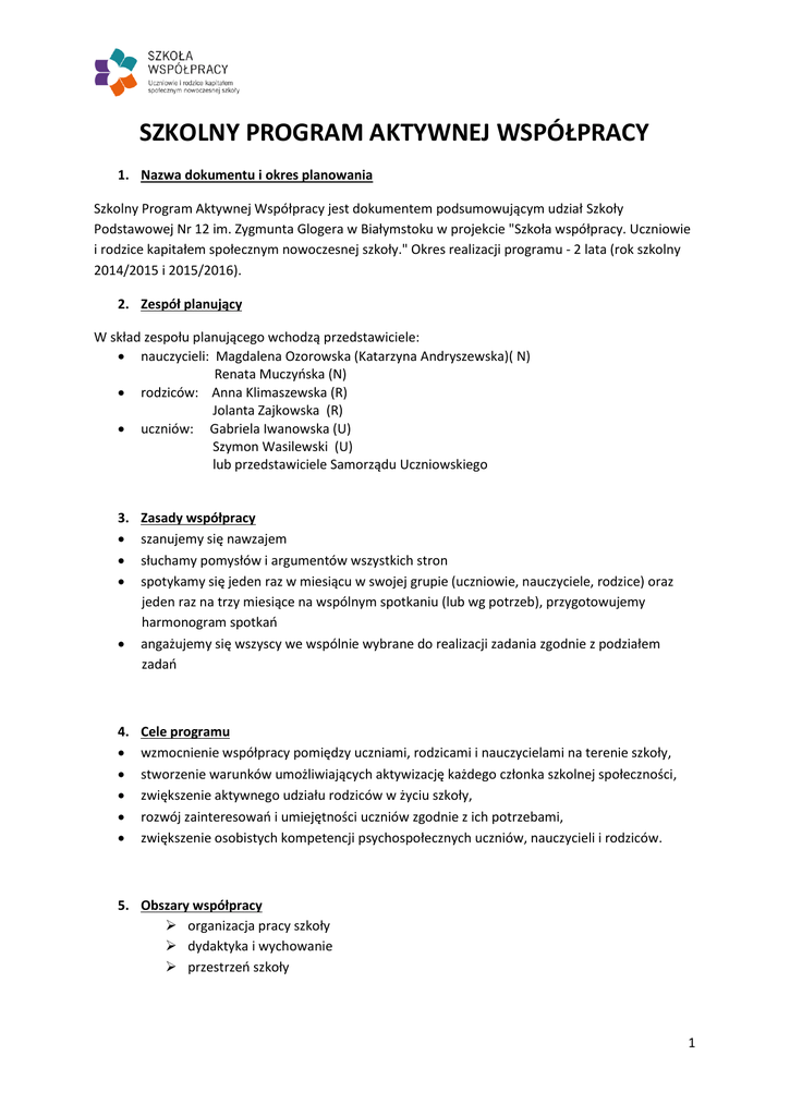 SZKOLNY PROGRAM AKTYWNEJ WSPÓŁPRACY 1. Nazwa dokumentu i okres planowania Szkolny Program Aktywnej Współpracy jest dokumentem podsumowującym udział Szkoły Podstawowej Nr 12 im. Zygmunta Glogera w Białymstoku w projekcie "Szkoła współpracy. Uczniowie i rodzice kapitałem społecznym nowoczesnej szkoły." Okres realizacji programu - 2 lata (rok szkolny 2014/2015 i 2015/2016). 2. Zespół planujący W skład zespołu planującego wchodzą przedstawiciele: nauczycieli: Magdalena Ozorowska (Katarzyna Andryszewska)( N) Renata Muczyńska (N) rodziców: Anna Klimaszewska (R) Jolanta Zajkowska (R) uczniów: Gabriela Iwanowska (U) Szymon Wasilewski (U) lub przedstawiciele Samorządu Uczniowskiego 3. 4. Zasady współpracy szanujemy się nawzajem słuchamy pomysłów i argumentów wszystkich stron spotykamy się jeden raz w miesiącu w swojej grupie (uczniowie, nauczyciele, rodzice) oraz jeden raz na trzy miesiące na wspólnym spotkaniu (lub wg potrzeb), przygotowujemy harmonogram spotkań angażujemy się wszyscy we wspólnie wybrane do realizacji zadania zgodnie z podziałem zadań Cele programu wzmocnienie współpracy pomiędzy uczniami, rodzicami i nauczycielami na terenie szkoły, stworzenie warunków umożliwiających aktywizację każdego członka szkolnej społeczności, zwiększenie aktywnego udziału rodziców w życiu szkoły, rozwój zainteresowań i umiejętności uczniów zgodnie z ich potrzebami, zwiększenie osobistych kompetencji psychospołecznych uczniów, nauczycieli i rodziców. 5. Obszary współpracy organizacja pracy szkoły dydaktyka i wychowanie przestrzeń szkoły 1 6. Działania w poszczególnych obszarach organizacja pracy szkoły konsultacje w sprawie zajęć pozalekcyjnych "skrzynka pomysłów" poszukiwanie sponsorów konsultacje w sprawie menu w stołówce i sklepiku szkolnym festyn środowiskowy dydaktyka i wychowanie ustalenie harmonogramu i tematyki cyklu warsztatów ustalenie zasad korzystania z sali gimnastycznej oraz stołów do tenisa przez rodziców z dziećmi "Klub Rodzica" - dyżury, konsultacje integracja rodziców w ramach klas "Pomocna dłoń" - ogłoszenia typu: oddam, zamienię przestrzeń szkoły organizacja lodowiska zimą organizacja przestrzeni na zebraniach rodziców (atmosfera, "wyjście zza ławek") opieka nad szkolnym sadkiem przygotowanie miejsc do gry "w klasy" TERMIN REALIZACJI : 01.09.2014r. – 31.08.2016r. 2 Plan działania na rok szkolny 2014/2015 1. Opis wspólnego działania Konsultacje w sprawie zajęć pozalekcyjnych W naszej szkole takie działanie (lub podobne): X było już realizowane wcześniej nigdy nie było realizowane Na czym będzie polegało wspólne działanie? (krótki opis, co ma zostać zrobione, ile osób będzie brało udział, co to będą za osoby) Przeprowadzenie ankiet wśród uczniów i rodziców na temat rozwijania zainteresowań na zajęciach pozalekcyjnych. Ankieta zostanie opracowana przez zespół 6 RUN. Nauczyciele zbiorą te ankiety i pozyskają informację zwrotną, która będzie potrzebna do stworzenia oferty zajęć pozalekcyjnych Po czym poznamy, że się udało? Powstanie oferty zajęć pozalekcyjnych. Uczniowie będą chętnie uczęszczać na wybrane przez siebie zajęcia. Szczegółowy plan działania LP. DZIAŁANIA ETAPY DZIAŁAŃ 1 Konsultacje w sprawie zajęć pozalekcyjnych Opracowanie ankiet skierowanych do uczniów i rodziców OSOBA ODPOWIEDZIALNA rodzice, nauczyciele, uczniowie TERMIN ŹRÓDŁO FINANSOWANIA szkoła IX Przeprowadzenie ankiet Zebranie informacji zwrotnej nauczyciele/ wychowawcy Powstanie oferty zajęć pozalekcyjnych nauczyciele/ wychowawcy/ wicedyrektor 3 "Pomocna dłoń" - ogłoszenia typu: oddam, zamienię W naszej szkole takie działanie (lub podobne): było już realizowane wcześniej X nigdy nie było realizowane Na czym będzie polegało wspólne działanie? (krótki opis, co ma zostać zrobione, ile osób będzie brało udział, co to będą za osoby) Wykonanie tablicy informacyjnej, którą będą prowadzić rodzice i uczniowie. Zamieszczą tam ogłoszenia, informacje np. odkupię, oddam, zamienię. Tablica będzie służyć rodzicom i uczniom. Po czym poznamy, że się udało? Powstanie tablicy informacyjnej dla rodziców i uczniów. Rodzice i uczniowie pozytywnie ocenią korzyści płynące z możliwości zamieszczania ogłoszeń na tablicy. Szczegółowy plan działania LP. 1 DZIAŁANIA „Pomocna dłoń”ogłoszenia typu: oddam, zamienię ETAPY DZIAŁAŃ OSOBA ODPOWIEDZIALNA TERMIN zespół 6 RUN 5X rodzice 20 X Zamocowanie tablicy konserwatorzy 30 X Zamieszczanie informacji wszyscy zainteresowani Ustalenie miejsca na tablicę Zakup tablicy ŹRÓDŁO FINANSOWANIA rodzice XI – VI 2015 4 Organizacja przestrzeni na zebraniach rodziców (atmosfera, "wyjście zza ławek") W naszej szkole takie działanie (lub podobne): X było już realizowane wcześniej (jedynie w klasach edukacji wczesnoszkolnej) nigdy nie było realizowane Na czym będzie polegało wspólne działanie? (krótki opis, co ma zostać zrobione, ile osób będzie brało udział, co to będą za osoby) Stworzenie miłej atmosfery spotkań, przyjaznego miejsca i sposobu prowadzenia wywiadówki. Rodzice i nauczyciele wspólnie opracują ankietę dotyczącą sposobu prowadzenia zebrań. Po czym poznamy, że się udało? Wzrośnie frekwencja rodziców na zebraniach, rodzice chętniej będą współpracowali ze szkołą. Wzrośnie poczucie rodziców, że są współpartnerami szkoły. Szczegółowy plan działania LP. 1 DZIAŁANIA Organizacja przestrzeni na zebraniach rodziców (atmosfera, "wyjście zza ławek") ETAPY DZIAŁAŃ Zebranie informacji o preferowanym sposobie prowadzenia zebrań Zorganizowanie działań integracyjnych na pierwszych zebraniach OSOBA ODPOWIEDZIALNA TERMIN wychowawcy ŹRÓDŁO FINANSOWANIA rodzice IX wychowawcy Zebranie informacji zwrotnej Organizacja „kącika kawowego” wychowawca, następnie rodzice 5 Festyn środowiskowy W naszej szkole takie działanie (lub pod