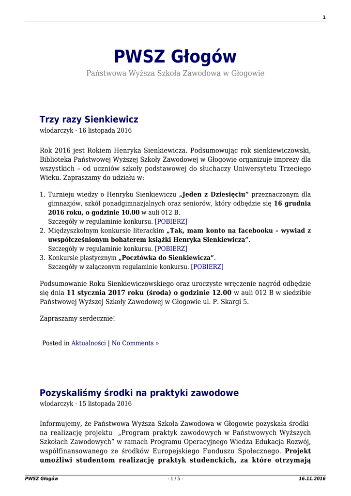 1 PWSZ Głogów Państwowa Wyższa Szkoła Zawodowa w Głogowie Trzy razy Sienkiewicz wlodarczyk · 16 listopada 2016 Rok 2016 jest Rokiem Henryka Sienkiewicza. Podsumowując rok sienkiewiczowski, Biblioteka Państwowej Wyższej Szkoły Zawodowej w Głogowie organizuje imprezy dla wszystkich – od uczniów szkoły podstawowej do słuchaczy Uniwersytetu Trzeciego Wieku. Zapraszamy do udziału w: 1. Turnieju wiedzy o Henryku Sienkiewiczu „Jeden z Dziesięciu” przeznaczonym dla gimnazjów, szkół ponadgimnazjalnych oraz seniorów, który odbędzie się 16 grudnia 2016 roku, o godzinie 10.00 w auli 012 B. Szczegóły w regulaminie konkursu. [POBIERZ] 2. Międzyszkolnym konkursie literackim „Tak, mam konto na facebooku – wywiad z uwspółcześnionym bohaterem książki Henryka Sienkiewicza”. Szczegóły w regulaminie konkursu. [POBIERZ] 3. Konkursie plastycznym „Pocztówka do Sienkiewicza”. Szczegóły w załączonym regulaminie konkursu. [POBIERZ] Podsumowanie Roku Sienkiewiczowskiego oraz uroczyste wręczenie nagród odbędzie się dnia 11 stycznia 2017 roku (środa) o godzinie 12.00 w auli 012 B w siedzibie Państwowej Wyższej Szkoły Zawodowej w Głogowie ul. P. Skargi 5. Zapraszamy serdecznie! Posted in Aktualności | No Comments » Pozyskaliśmy środki na praktyki zawodowe wlodarczyk · 15 listopada 2016 Informujemy, że Państwowa Wyższa Szkoła Zawodowa w Głogowie pozyskała środki na realizację projektu „Program praktyk zawodowych w Państwowych Wyższych Szkołach Zawodowych” w ramach Programu Operacyjnego Wiedza Edukacja Rozwój, współfinansowanego ze środków Europejskiego Funduszu Społecznego. Projekt umożliwi studentom realizację praktyk studenckich, za które otrzymają PWSZ Głogów -1/5- 16.11.2016 2 stypendium w wysokości ok. 11 500,00 zł. Oprócz stypendium za praktyki, istnieje możliwość ubiegania się o refundację kosztów związanych np. z dojazdem do miejsca pracy, ubezpieczeniem, badaniami lekarskimi. Studenci, bądźcie czujni – szczegóły uczestnictwa w projekcie już wkrótce. Posted in Aktualności | No Comments » Niekonwencjonalne zajęcia z ekonomii wlodarczyk · 15 listopada 2016 Studenci I roku kierunku finanse i rachunkowość w sposób niekonwencjonalny poznawali mechanizmy zachodzące na wolnym rynku z wykorzystaniem umiejętności negocjacyjnych. Pod okiem doradców zawodowych legnickiego Centrum Informacji i Planowania Kariery Zawodowej uczestniczyli w symulacyjnej grze ekonomicznej pn. “Chłopska Szkoła Biznesu”, inspirowanej historią przedsiębiorczych rzemieślników z XVIII-wiecznego ośrodka andrychowskiego. Rozgrywki były przeprowadzone w ramach zajęć programowych z ekonomii. Strategiczna gra była doskonałą okazją do udoskonalenia kompetencji przedsiębiorczych i społecznych wymaganych na aktualnym rynku pracy. Zabawa w przedsiębiorców wzbudziła wiele pozytywnych emocji wśród uczestników. Na zakończenie zwycięzcy otrzymali nagrody ufundowane przez PWSZ w Głogowie oraz pamiątki od legnickich doradców zawodowych prowadzących grę. Galeria zdjęć Posted in Aktualności | No Comments » Uczelniana Komisja Wyborcza Dział IT · 14 listopada 2016 Głogów, 10.11.2016. Uczelniana Komisja Wyborcza PWSZ w Głogowie Komunikat nr 43 1. Stwierdzenie ważności uzupełniających wyborów do Senatu z grona nauczycieli PWSZ Głogów -2/5- 16.11.2016 3 akademickich w Instytucie Politechnicznym posiadających co najmniej stopień naukowy doktora. Ad. 1 Uczelniana Komisja Wyborcza stwierdza ważność uzupełniających wyborów do Senatu PWSZ w Głogowie z grona nauczycieli akademickich w Instytucie Politechnicznym posiadających co najmniej stopień naukowy doktora przeprowadzonych 04.11.2016r. Wybrana została: dr inż. Elżbieta Banaczyk Przewodniczący Uczelnianej Komisji Wyborczej Ireneusz Kuropka Posted in Aktualności | No Comments » UWAGA Studenci! wlodarczyk · 10 listopada 2016 Tylko do 13 listopada trwa przyjmowanie zgłoszeń osób chętnych do działania w Radzie Uczelnianej Samorządu Studenckiego. Zachęcamy wszystkich do aktywnego uczestniczenia w życiu Uczelni. Szczegóły dotyczące przyjmowania zgłoszeń znajdują się tutaj. Posted in Aktualności | No Comments » Projekt Nowych Mediów w Gawronach Dział IT · 27 października 2016 Czerwcowy projekt o Krzysztofie Jeleniu studentów Nowych Mediów tak bardzo podobał się mieszkańcom rodzinnej miejscowości poety, że w środę, 26 października, zaprosili organizatorów do siebie na spotkanie „Cudze chwalicie, swego nie znacie”. W pięknej, kameralnej scenerii, wśród liści z cytatami z wierszy poety, jabłek z sadu Krzysztofa Jelenia i obok ławki szkolnej artysty, dr Sławomira Lisewska opowiadała o kulisach projektu, prezentowała i omawiała prace studentów. Zrealizowany przez nich Film niedokończony, wzbudził bardzo duże zainteresowanie uczestników spotkania. Dr Krzysztof Czapla zainteresował słuchaczy swoją znajomością historii regionu oraz PWSZ Głogów -3/5- 16.11.2016 4 projektami Pracowni Badań Regionalnych. Absolwentka naszej uczelni, Aleksandra Budzinowska, prezentowała swoją książką, wydaną dzięki pracowni. Krzysztof Jeleń wspominał współpracę ze studentami, którzy wraz z wykładowcami otrzymali już zaproszenie na letnią pogawędkę i poczęstunek przed rodzinnym domem poety w Gawronach oraz spotkanie poświęcone Krzysztofowi Jeleniowi w Rudnej. Zdjęcia w Galerii Posted in Aktualności | No Comments » Uporządkowali groby N.N. Dział IT · 25 października 2016 Kontynuacja akcji Instytutu Humanistycznego Jak każdego roku, od kilku lat, głogowskie cmentarze przed 1. listopada odwiedzili studenci i wykładowcy Instytutu Humanistycznego. W sobotę, 22 października, studenci I roku pedagogiki studiów niestacjonarnych uporządkowali groby NN w Brzostowie i Krzepowie. Dzięki studentom zapłonęły światełka pamięci. O pamięć właśnie, i szacunek, dla nieznanych Zmarłych, 