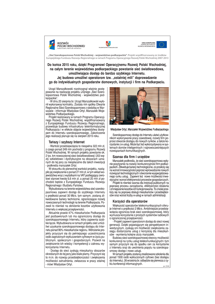 Do koñca 2015 roku, dziêki Programowi Operacyjnemu Rozwój Polski Wschodniej, na ca³ym terenie województwa podkarpackiego powstanie sieæ œwiat³owodowa, umo¿liwiaj¹ca dostêp do bardzo szybkiego Internetu. Jej budowa umo¿liwi operatorom tzw. „ostatniej mili” doprowadzenie go do indywidualnych gospodarstw domowych, instytucji i firm na Podkarpaciu. Urz¹d Marsza³kowski rozstrzygn¹³ w³aœnie postêpowanie na realizacjê projektu unijnego „Sieæ Szerokopasmowa Polski Wschodniej - województwo podkarpackie”. - W dniu 20 sierpnia br. Urz¹d Marsza³kowski wy³oni³ wykonawcê kontraktu. Zosta³a nim spó³ka Otwarte Regionalne Sieci Szerokopasmowe z siedzib¹ w Warszawie - informuje W³adys³aw Ortyl, Marsza³ek Województwa Podkarpackiego. Projekt realizowany w ramach Programu Operacyjnego Rozwój Polski Wschodniej, wspó³finansowany z Europejskiego Funduszu Rozwoju Regionalnego, przewiduje budowê infrastruktury teleinformatycznej Podkarpacia i w efekcie objêcie województwa dostêpem do Internetu szerokopasmowego. Zakoñczenie jego realizacji planuje siê na sierpieñ 2015 roku. Tañszy i szybszy Internet - Wartoœæ przedsiêwziêcia to niespe³na 322 mln z³, z czego ponad 249 mln pochodzi z programu Rozwój Polski Wschodniej. W ramach projektu powstanie ok. 2 tys. km nowoczesnej sieci œwiat³owodowej i 203 wêz³y szkieletowe i dystrybucyjne na obszarach uznanych do tej pory za nieop³acalne dla takich inwestycji - podkreœla marsza³ek Ortyl. W stosunku do pierwotnej wartoœci projektu, nast¹pi³o jej zwiêkszenie o ponad 27 mln z³, w tym wk³ad województwa wraz z wydatkami na VAT podlegaj¹cy zwrotowi stanowi kwotê 6,6 mln z³, a ponad 20 mln z³ pochodziæ bêdzie z Europejskiego Funduszu Rozwoju Regionalnego i Bud¿etu Pañstwa. Wybudowana na terenie województwa sieæ szerokopasmowa zapewni dostêp do szybkiego Internetu o prêdkoœci ponad 30 Mb/s. tym samym, zostan¹ zlikwidowane bariery techniczne, ograniczaj¹ce rozwój nowoczesnych technologii na terenie Podkarpacia. Pozwoli to równie¿ na obni¿enie kosztów u¿ytkowania Internetu o wiêkszej przep³ywnoœci. Aktualnie prawie 47% mieszkañców Podkarpacia jest pozbawionych lub ma ograniczony dostêp do szerokopasmowego Internetu, który zapewnia szybkie ³¹cze. Wybudowana w ramach projektu sieæ umo¿liwi uzyskanie szerokopasmowego dostêpu do Internetu ponad 90% mieszkañców regionu. Wdro¿enie projektu przyczyni siê do pe³niejszego uczestniczenia osób zagro¿onych wykluczeniem cyfrowym w ¿yciu publicznym, spo³ecznym i gospodarczym. Pozwoli na zwiêkszenie ich wiedzy i kompetencji z zakresu wykorzystania Internetu. - Dostêp do sieci zyskaj¹ mieszkañcy obszarów okreœlanych do tej pory jako bia³e plamy. Przyczyni siê to m.in. do rozwoju przedsiêbiorczoœci i zwiêkszenia mo¿liwoœci zatrudnienia, zw³aszcza w pracy zdalnej - mówi W³adys³aw Ortyl. W³adys³aw Ortyl, Marsza³ek Województwa Podkarpackiego Szerokopasmowy dostêp do Internetu u³atwi u¿ytkownikom wykonywanie pracy zawodowej, rozwój firm poprzez otwarcie dostêpu do nowych rynków, a tak¿e korzystanie z e-us³ug. Mo¿e byæ te¿ wykorzystywany w systemach domów inteligentnych i najnowoczeœniejszych rozwi¹zaniach komunikacyjnych. Szansa dla firm i urzêdów Marsza³ek podkreœla, ¿e sieæ szerokopasmowa wp³ynie pozytywnie na rozwój i konkurencyjnoœæ firm podkarpackich. Zlikwiduje bariery technologiczne, co prze³o¿y siê na wzrost innowacyjnoœci poprzez wprowadzanie nowych rozwi¹zañ technologicznych i stworzenie wyspecjalizowanego rynku us³ug. Zapewni te¿ nowe mo¿liwoœci inwestycyjne i wzrost efektywnoœci procesów gospodarczych. Projekt to równie¿ szansa dla instytucji publicznych na poprawê procesu zarz¹dzania, efektywnoœci dzia³ania i zmniejszenie kosztów ich funkcjonowania. To z kolei prze³o¿y siê na poprawê obs³ugi mieszkañców i przedsiêbiorców oraz wzrost liczby e-us³ug w ramach administracji. Korzyœci dla operatorów Wiêkszoœæ operatorów telekomunikacyjnych oferuje Internet o prêdkoœci 2 Mb/s. Ambitniejsze przedsiêwziêcia ogranicza brak sieci szerokopasmowej, który wymusza korzystanie z prostych systemów radiowych o ograniczonej przep³ywnoœci. - Projekt zapewni operatorom dostêp do sieci nowej generacji. Dziêki pojawiaj¹cym siê perspektywom inwestycyjnym, zyskaj¹ oni mo¿liwoœæ zwiêkszenia zasiêgu dostarczania us³ug z korzyœci¹ dla mieszkañców - wymienia kolejne atuty marsza³ek. Budowa sieci szerokopasmowej stworzy mo¿liwoœæ konkurencji na rynku us³ug telekomunikacyjnych i tym samym przyczyni siê do spadku cen za korzystanie z Internetu oraz do uwolnienia popytu na szerokopasmowy dostêp i nowe us³ugi. W ramach projektu zostan¹ zrealizowane szkolenia dla ponad 1500 osób wykluczonych cyfrowo (bez dostêpu do Internetu). 26 wrzeœnia br. odbêdzie siê pierwsza z cyklu konferencji informacyjnych. po 2246