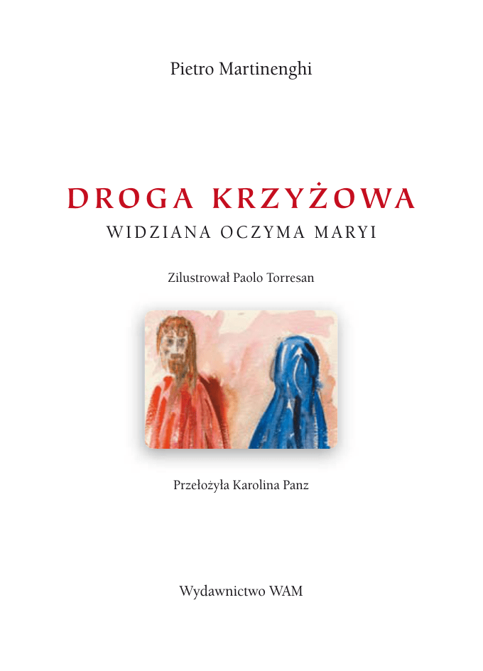 Pietro Martinenghi D R O G A K R Z Y Ż O WA WIDZIANA OCZYMA MARYI Zilustrował Paolo Torresan Przełożyła Karolina Panz Wydawnictwo WAM La Via Crucis, sotto lo sguardo di Maria Illustrazioni di Paolo Torresan © EDIZIONI SAN PAOLO s.r.l., 2008 © Wydawnictwo WAM, 2009 ISBN 978-83-7505-281-7 Redakcja: Jakub Kołacz SJ Skład: Lesław Sławiński PHOTO DESIGN WYDAWNICTWO WAM ul. Kopernika 26 • 31-501 Kraków tel. 012 62 93 200 • faks 012 429 50 03 e-mail: [email protected] DZIAŁ HANDLOWY tel. 012 62 93 254-256 • faks 012 430 32 10 e-mail: [email protected] Zapraszamy do naszej KSIĘGARNI INTERNETOWEJ http://WydawnictwoWAM.pl tel. 012 62 93 260 • faks 012 62 93 261 w p r o wa d z e n i e W imię Ojca i Syna, i Ducha Świętego. Amen B oże, Miłosierny Ojcze, przez błogosławioną mękę Twego Syna dałeś nam zbawienie. On to, przyjąwszy postać sługi, był posłuszny aż do śmierci, a była to śmierć krzyżowa. Teraz, przemierzając z wiarą stacje drogi krzyżowej, odkrywamy bezkresną miłość naszego Odkupiciela i pełni wdzięczności dla naszego Pana, umarłego i zmartwychwstałego dla naszego zbawienia, czujemy się wezwani do porzucenia życia w grzechu i podjęcia naszej drogi na nowo. Jest z nami w tej drodze Dziewica Maryja, Towarzyszka męki i nasza Współodkupicielka. (ok. 1520 r.) 7 S TA B AT M AT E R STAŁA MATKA BOLEŚCIWA S tała Matka Boleściwa jest hymnem liturgicznym napisanym w języku łacińskim. Jego autorstwo przypisuje się zazwyczaj Jacopone da Todi, jednak według niektórych, został on ułożony przez Papieża Innocentego III lub świętego Bonawenturę. W liturgii godzin przewiduje się jego recytację w czasie święta Matki Bożej Bolesnej (15 września). Przed reformą liturgiczną hymn znajdował się w oficjum piątkowym w tygodniu poprzedzającym Niedzielę Palmową. P opularność, którą cieszył się przez wieki, była spowodowana również tym, że recytowano go podczas Drogi Krzyżowej i w czasie procesji wielkopiątkowej. M odlitwa opisuje cierpienie Maryi – świadka pasji Chrystusa. Kładzie nacisk na związek pomiędzy cierpieniem i bólem z jednej, a odkupieniem i nadzieją życia wiecznego z drugiej strony. 11 S TA B AT M AT E R S tała Matka Boleściwa obok krzyża ledwo żywa, gdy na krzyżu wisiał Syn. Duszę Jej, co łez nie mieści, pełną smutku i boleści, przeszedł miecz dla naszych win. O , jak smutna i strapiona Matka ta błogosławiona, której Synem niebios Król! Jak płakała Matka miła, jak cierpiała, gdy patrzyła na boskiego Syna ból. G dzież jest człowiek, co łzę wstrzyma, gdy mu stanie przed oczyma w mękach Matka ta bez skaz? Kto się smutkiem nie poruszy, gdy rozważy boleść duszy Matki z Jej Dziecięciem wraz? 12 I S TAC J A JEZUS NA ŚMIERĆ SKAZANY Kłaniamy Ci się, Panie Jezu Chryste, i błogosławimy Ciebie. Wspólnota (W): Żeś przez krzyż i mękę swoją świat odkupić raczył. Kapłan (K): Z Ewangelii św. Marka 14, 53.64; 15, 1-8.12.15 A Jezusa zaprowadzili do najwyższego kapłana, u którego zebrali się wszyscy arcykapłani, starsi i uczeni w Piśmie. Oni zaś wszyscy wydali wyrok, że winien jest śmierci. Zaraz wczesnym rankiem arcykapłani wraz ze starszymi i uczonymi w Piśmie i cała Wysoka Rada powzięli uchwałę. Kazali Jezusa związanego odprowadzić i wydali go Piłatowi. Piłat zapytał: „Cóż więc mam uczynić z tym, którego nazywacie 17 I S TAC J A Królem Żydowskim?”. Odpowiedzieli mu krzykiem: „Ukrzyżuj Go!”. Wtedy Piłat Jezusa kazał ubiczować i wydał na ukrzyżowanie. Słychać je na ulicach miast i w telewizyjnych debatach. Często wypowiadamy je także w głębokiej ciszy naszego serca – słowa, osądy i przesądy oskarżające znajomego, przyjaciela, brata. Czasem zdarza się usłyszeć, niestety także z ust chrześcijan, tych praktykujących i wierzących, takie słowa: „dla mnie ta osoba przestała istnieć”. I tak oto zostaje ogłoszony „wyrok śmierci” – w naszych myślach lub w słowach, skierowanych do drugiego człowieka. Panie, Ty także byłeś ofiarą takiego osądu. Zostałeś skazany, bo Twoja wyrozumiałość, otwartość, 18 I S TAC J A empatia i przebaczenie, Twoja miłość bliźniego gorszyła, bo otwarcie oskarżała to, co było jej przeciwieństwem. A nienawiść była wszędzie, dlatego Sprawiedliwy musiał zginąć! A Ty nawet nie otworzyłeś ust… W tej ciszy wiedziałeś, że jest ktoś, kto myśli tak jak Ty. Kto wraz z Tobą oddał całe swe istnienie w służbie miłości. W swoim sercu oprócz zrozumienia czułeś przyzwolenie i wsparcie – niby dodający otuchy uścisk dłoni! Słyszałeś głos, który znałeś, który znało Twoje serce – głos Twojej Matki! A Ona nie tylko Cię nie oskarżała, lecz rozumiała, usprawiedliwiała, ochraniała Cię i broniła. Czułeś, że Cię nie oskarża, lecz chroni i tuli w swym matczynym sercu. 19 I S TAC J A To wydarzenie Twojego życia jest dla nas przykładem i wskazówką, byśmy niestrudzenie podążali naszą drogą, na przekór tak różnym i licznym osądom. Abyśmy realizowali historię swojego życia w zgodzie z naszym powołaniem. Panie, dziękując Ci za nie, błagamy, byś w momentach naszego osamotnienia w świecie, tak często negującym chrześcijaństwo, a także wtedy, gdy nasze błędy będą nas bezlitośnie oskarżać, pozwolił nam usłyszeć głos Twojej Matki, Maryi Dziewicy. Niech nas uzdolni do życia pełnego wiary, do którego zostaliśmy powołani przez chrzest i niech przypomina nam o Twojej postawie pełnej miłości. 20