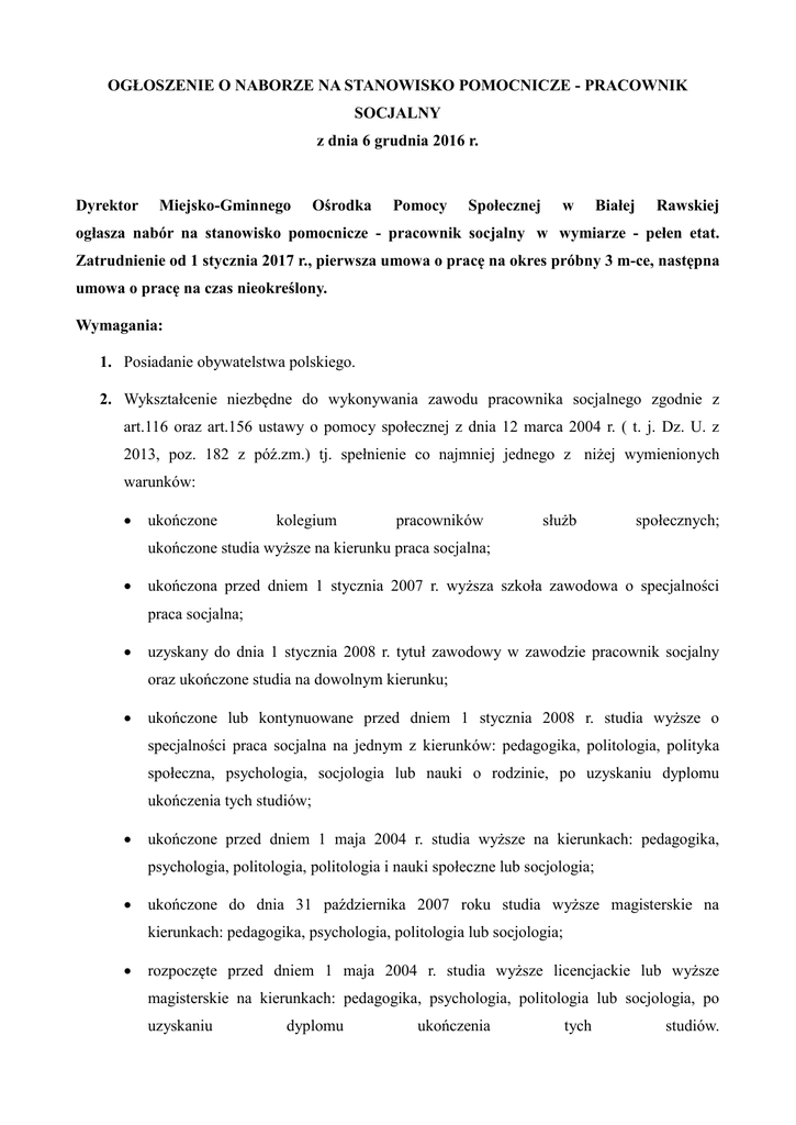 OGŁOSZENIE O NABORZE NA STANOWISKO POMOCNICZE - PRACOWNIK SOCJALNY z dnia 6 grudnia 2016 r. Dyrektor Miejsko-Gminnego Ośrodka Pomocy Społecznej w Białej Rawskiej ogłasza nabór na stanowisko pomocnicze - pracownik socjalny w wymiarze - pełen etat. Zatrudnienie od 1 stycznia 2017 r., pierwsza umowa o pracę na okres próbny 3 m-ce, następna umowa o pracę na czas nieokreślony. Wymagania: 1. Posiadanie obywatelstwa polskiego. 2. Wykształcenie niezbędne do wykonywania zawodu pracownika socjalnego zgodnie z art.116 oraz art.156 ustawy o pomocy społecznej z dnia 12 marca 2004 r. ( t. j. Dz. U. z 2013, poz. 182 z póź.zm.) tj. spełnienie co najmniej jednego z niżej wymienionych warunków: ukończone kolegium pracowników służb społecznych; ukończone studia wyższe na kierunku praca socjalna; ukończona przed dniem 1 stycznia 2007 r. wyższa szkoła zawodowa o specjalności praca socjalna; uzyskany do dnia 1 stycznia 2008 r. tytuł zawodowy w zawodzie pracownik socjalny oraz ukończone studia na dowolnym kierunku; ukończone lub kontynuowane przed dniem 1 stycznia 2008 r. studia wyższe o specjalności praca socjalna na jednym z kierunków: pedagogika, politologia, polityka społeczna, psychologia, socjologia lub nauki o rodzinie, po uzyskaniu dyplomu ukończenia tych studiów; ukończone przed dniem 1 maja 2004 r. studia wyższe na kierunkach: pedagogika, psychologia, politologia, politologia i nauki społeczne lub socjologia; ukończone do dnia 31 października 2007 roku studia wyższe magisterskie na kierunkach: pedagogika, psychologia, politologia lub socjologia; rozpoczęte przed dniem 1 maja 2004 r. studia wyższe licencjackie lub wyższe magisterskie na kierunkach: pedagogika, psychologia, politologia lub socjologia, po uzyskaniu dyplomu ukończenia tych studiów. 3. Doświadczenie zawodowe w pracy w pomocy społecznej - co najmniej 2 letni okres potwierdzony dokumentami lub odbyty staż zawodowy (praktyki) w instytucjach pomocy społecznej. 4. Nieposzlakowana opinia 5. Niekaralność za przestępstwa popełnione umyślnie 6. Stan zdrowia pozwalający na zatrudnienie na określonym stanowisku 7. Znajomość regulacji prawnych z zakresu: pomocy społecznej, wsparcia rodziny i systemu pieczy zastępczej, przeciwdziałania przemocy w rodzinie, przeciwdziałania alkoholizmowi, przeciwdziałania narkomanii, kodeksu rodzinnego i opiekuńczego, kodeksu postępowania administracyjnego. Wymagania dodatkowe: 1. Obsługa komputera, w tym programu TT Pomost, 2. Samodzielność, odpowiedzialność, dyspozycyjność, 3. Rzetelność i systematyczność, 4. Łatwość nawiązywania kontaktów interpersonalnych, 5. Umiejętność analizy problemu i poprawnego wyciągania wniosków, 6. Umiejętność pracy w zespole, 7. Asertywność, 8. Odporność na stres, 9. Posiadanie prawa jazdy kat. B, 10. Mile widziane doświadczenie w pracy pracownika socjalnego. Zakres czynności: 1. Dokonywanie analizy i oceny zjawisk, które powodują zapotrzebowanie na świadczenia z pomocy społecznej oraz kwalifikowanie do uzyskiwania tych świadczeń; 2. Prowadzenie pracy socjalnej jako działalności zawodowej mającej na celu udzielanie pomocy osobom i rodzinom we wzmacnianiu lub odzyskiwaniu zdolności do funkcjonowania w środowisku; przeprowadzanie rodzinnych wywiadów środowiskowych własnych i na zlecenie innych organów, 3. Kompletowanie i prowadzenie dokumentacji oraz proponowanie form pomocy dla osób potrzebujących; 4. Udzielanie informacji, wskazówek i pomocy w zakresie rozwiązywania spraw życiowych osobom, które dzięki tej pomocy będą zdolne samodzielnie rozwiązywać problemy będące przyczyną trudnej sytuacji życiowej; 5. Skuteczne posługiwanie się przepisami prawa w realizacji tych zadań; 6. Pomoc w uzyskaniu dla osób będących w trudnej sytuacji życiowej poradnictwa dotyczącego możliwości rozwiązywania problemów i udzielania pomocy przez właściwe instytucje państwowe, samorządowe i organizacje pozarządowe oraz wspieranie w uzyskiwaniu pomocy; 7. Udzielanie pomocy zgodnie z zasadami etyki zawodowej; 8. Pobudzanie społecznej aktywności i inspirowanie działań samopomocowych w zaspokajaniu niezbędnych potrzeb życiowych osób, rodzin, grup i środowisk społecznych; 9. Współpraca i współdziałanie z innymi specjalistami w celu przeciwdziałania i ograniczania patologii i skutków negatywnych zjawisk społecznych, łagodzenie skutków ubóstwa; 10. Inicjowanie nowych form pomocy osobom i rodzinom mającym trudną sytuację życiową oraz inspirowanie powołania instytucji świadczących usługi służące poprawie sytuacji takich osób i rodzin; 11. Współuczestniczenie w inspirowaniu, opracowaniu, wdrożeniu oraz rozwijaniu regionalnych i lokalnych programów pomocy społecznej ukierunkowanych na podniesienie jakości życia. Wymagane dokumenty: 1. List motywacyjny, 2. Życiorys (CV), 3. Kopia dokumentów potwierdzających wykształcenie, 4. Kopia świadectw pracy potwierdzających staż pracy, 5. Pisemne oświadczenie kandydata o posiadaniu pełnej zdolności do czynności prawnych i korzystaniu z pełni praw publicznych oraz o tym, że kandydat nie był skazany prawomocnym wyrokiem sądu za umyślne przestępstwo ścigane z oskarżenia publicznego lub umyślne przestępstwo skarbowe. 6. Oświadczenie o stanie zdrowia pozwalającym na zatrudnienie na stanowisku pracownika socjalnego. Wymagane dokumenty aplikacyjne: list motywacyjny, CV, powinny być opatrzone klauzulą: „Wyrażam zgodę na przetwarzanie moich danych osobowych zawartych w ofercie pracy dla potrzeb niezbędnych do realizacji procesu rekrutacji zgodnie z ustawą z dnia 29 sierpnia 1997 r. o ochronie danych osobowych (t.j. Dz. U. z 2015 r. poz. 2135) i ustawą z dnia 21 listopada 2008 r. o pracownikach samorządowych (t.j. Dz. U. z 2014 r. poz. 1202 z późn. zm.). Powyższa klauzula musi być dodatkowo opatrzona własnoręcznym podpisem. Informacja o warunkach pracy: 1. Praca biurowa i n