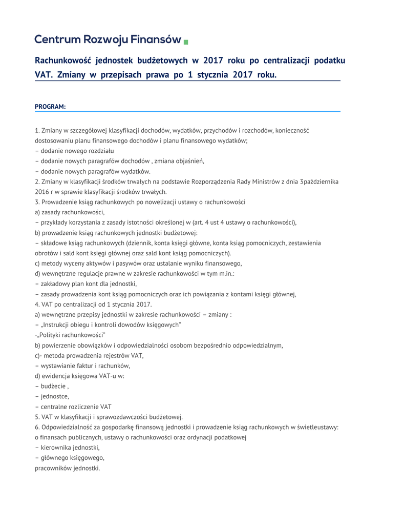 Rachunkowość jednostek budżetowych w 2017 roku po centralizacji podatku VAT. Zmiany w przepisach prawa po 1 stycznia 2017 roku. PROGRAM: 1. Zmiany w szczegółowej klasyfikacji dochodów, wydatków, przychodów i rozchodów, konieczność dostosowaniu planu finansowego dochodów i planu finansowego wydatków; – dodanie nowego rozdziału – dodanie nowych paragrafów dochodów , zmiana objaśnień, – dodanie nowych paragrafów wydatków. 2. Zmiany w klasyfikacji środków trwałych na podstawie Rozporządzenia Rady Ministrów z dnia 3 października 2016 r w sprawie klasyfikacji środków trwałych. 3. Prowadzenie ksiąg rachunkowych po nowelizacji ustawy o rachunkowości a) zasady rachunkowości, – przykłady korzystania z zasady istotności określonej w (art. 4 ust 4 ustawy o rachunkowości), b) prowadzenie ksiąg rachunkowych jednostki budżetowej: – składowe ksiąg rachunkowych (dziennik, konta księgi główne, konta ksiąg pomocniczych, zestawienia obrotów i sald kont księgi głównej oraz sald kont ksiąg pomocniczych). c) metody wyceny aktywów i pasywów oraz ustalanie wyniku finansowego, d) wewnętrzne regulacje prawne w zakresie rachunkowości w tym m.in.: – zakładowy plan kont dla jednostki, – zasady prowadzenia kont ksiąg pomocniczych oraz ich powiązania z kontami księgi głównej, 4. VAT po centralizacji od 1 stycznia 2017. a) wewnętrzne przepisy jednostki w zakresie rachunkowości – zmiany : – „Instrukcji obiegu i kontroli dowodów księgowych” -„Polityki rachunkowości” b) powierzenie obowiązków i odpowiedzialności osobom bezpośrednio odpowiedzialnym, c)- metoda prowadzenia rejestrów VAT, – wystawianie faktur i rachunków, d) ewidencja księgowa VAT-u w: – budżecie , – jednostce, – centralne rozliczenie VAT 5. VAT w klasyfikacji i sprawozdawczości budżetowej. 6. Odpowiedzialność za gospodarkę finansową jednostki i prowadzenie ksiąg rachunkowych w świetle ustawy: o finansach publicznych, ustawy o rachunkowości oraz ordynacji podatkowej – kierownika jednostki, – głównego księgowego, pracowników jednostki. 7. Planowane zmiany w Rozporządzeniu w sprawie szczególnych zasad rachunkowości. 8.Pytania i odpowiedzi. INFORMACJE ORGANIZACYJNE: Szczegółowych informacji udziela: Ewelina Rykaczewska tel.: 22 664 56 32, 509 998 703 E-mail: [email protected] Data i miejsce zajęć: 7 marzec 2017 r. Łódź 8 marzec 2017 r. Warszawa Godziny zajęć:10:00-15:00 Cena obejmuje:uczestnictwo w szkoleniu, autorskie materiały szkoleniowe przygotowane przez trenera, zaświadczenie, lunch, przerwy kawowe Koszt szkolenia: od jednej osoby - 350 zł + VAT* * cena bez VAT dla opłacających szkolenie w co najmniej 70% ze środków publicznych Płatności prosimy dokonać po otrzymaniu potwierdzenia na konto: ALIOR BANK S.A. 98 2490 0005 0000 4500 6222 8867 Uprzejmie prosimy na przelewie umieścić temat, datę szkolenia oraz nazwiska uczestników. Zgłoszenia prosimy nadsyłać faksem na nr 22 203 62 18 lub mailem [email protected] Warunki rezygnacji:Rezygnację przyjmujemy najpóźniej na 7 dni przed szkoleniem w formie pisemnej. Rezygnacja w późniejszym terminie wiąże się z koniecznością pokrycia kosztów w 100%. Nieobecność na szkoleniu nie zwalnia z dokonania opłaty.