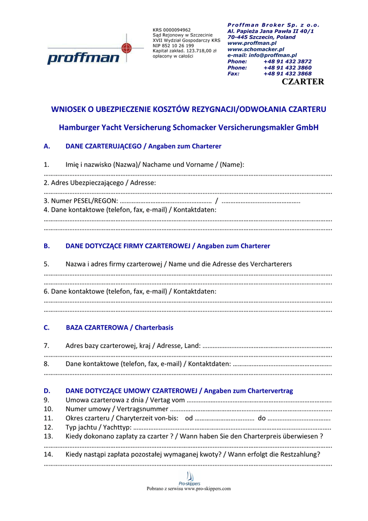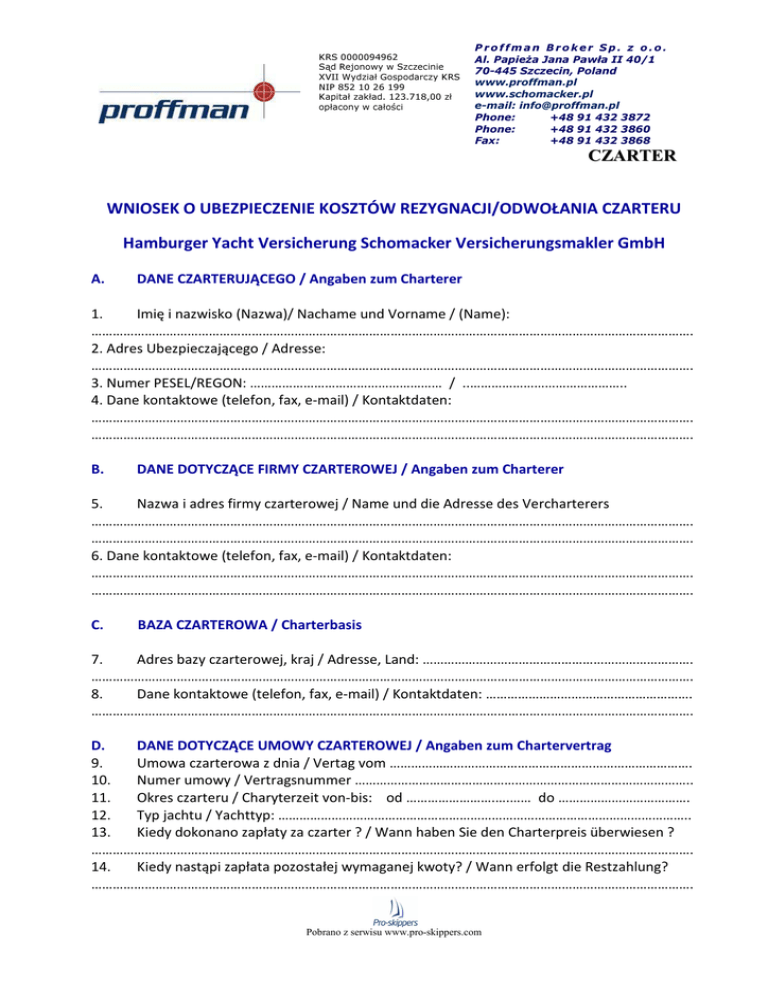 KRS 0000094962 Sąd Rejonowy w Szczecinie XVII Wydział Gospodarczy KRS NIP 852 10 26 199 Kapitał zakład. 123.718,00 zł opłacony w całości Proffman Broker Sp. z o.o. Al. Papieża Jana Pawła II 40/1 70-445 Szczecin, Poland www.proffman.pl www.schomacker.pl e-mail: [email protected] Phone: +48 91 432 3872 Phone: +48 91 432 3860 Fax: +48 91 432 3868 CZARTER WNIOSEK O UBEZPIECZENIE KOSZTÓW REZYGNACJI/ODWOŁANIA CZARTERU Hamburger Yacht Versicherung Schomacker Versicherungsmakler GmbH A. DANE CZARTERUJĄCEGO / Angaben zum Charterer 1. Imię i nazwisko (Nazwa)/ Nachame und Vorname / (Name): ……………………………………………………………………………………………………………………………………………………. 2. Adres Ubezpieczającego / Adresse: ……………………………………………………………………………………………………………………………………………………. 3. Numer PESEL/REGON: ……………………………………………… / ..…………………………………….. 4. Dane kontaktowe (telefon, fax, e-mail) / Kontaktdaten: ……………………………………………………………………………………………………………………………………………………. ……………………………………………………………………………………………………………………………………………………. B. DANE DOTYCZĄCE FIRMY CZARTEROWEJ / Angaben zum Charterer 5. Nazwa i adres firmy czarterowej / Name und die Adresse des Vercharterers ……………………………………………………………………………………………………………………………………………………. ……………………………………………………………………………………………………………………………………………………. 6. Dane kontaktowe (telefon, fax, e-mail) / Kontaktdaten: ……………………………………………………………………………………………………………………………………………………. ……………………………………………………………………………………………………………………………………………………. C. BAZA CZARTEROWA / Charterbasis 7. Adres bazy czarterowej, kraj / Adresse, Land: …………………………………………………………………. ……………………………………………………………………………………………………………………………………………………. 8. Dane kontaktowe (telefon, fax, e-mail) / Kontaktdaten: …………………………………………………. ……………………………………………………………………………………………………………………………………………………. D. DANE DOTYCZĄCE UMOWY CZARTEROWEJ / Angaben zum Chartervertrag 9. Umowa czarterowa z dnia / Vertag vom …………………………………………………………………………. 10. Numer umowy / Vertragsnummer ………………………………………………………………………………….. 11. Okres czarteru / Charyterzeit von-bis: od …………………….….…… do ………………………………. 12. Typ jachtu / Yachttyp: …………………………………………………………………………………………………….. 13. Kiedy dokonano zapłaty za czarter ? / Wann haben Sie den Charterpreis überwiesen ? ……………………………………………………………………………………………………………………………………………………. 14. Kiedy nastąpi zapłata pozostałej wymaganej kwoty? / Wann erfolgt die Restzahlung? ……………………………………………………………………………………………………………………………………………………. Pobrano z serwisu www.pro-skippers.com KRS 0000094962 Sąd Rejonowy w Szczecinie XVII Wydział Gospodarczy KRS NIP 852 10 26 199 Kapitał zakład. 123.718,00 zł opłacony w całości Proffman Broker Sp. z o.o. Al. Papieża Jana Pawła II 40/1 70-445 Szczecin, Poland www.proffman.pl www.schomacker.pl e-mail: [email protected] Phone: +48 91 432 3872 Phone: +48 91 432 3860 Fax: +48 91 432 3868 CZARTER E. WYBRANY WARIANT UBEZPIECZENIA / Gewählte Versicherungsvariante 15. Wybrana opcja (zaznaczyć krzyżykiem odpowiedni kwadracik) / Versicherungsoption: Cena rejsu czarterowego (w Euro) Rezygnacja z rejsu Przerwanie rejsu do 1000,Powyżej 1000,- do 1500,Powyżej 1500,- do 2000,Powyżej 2000,- do 3000,Powyżej 3000,- do 4000,Powyżej 4000,- do 5000,Powyżej 5000,- do 6000,Powyżej 6000,- do 8000,Powyżej 8000,- do 10000,- 41,- Euro 59,- Euro 78,- Euro 115,- Euro 151,- Euro 186,- Euro 219,- Euro 286,- Euro 351,- Euro □ □ □ □ □ □ □ □ □ Rezygnacja/przerwanie rejsu z rozszerzeniem ochrony o ubezpieczenie niewypłacalności armatora 55,- Euro □ 83,- Euro □ 102,- Euro □ 147,- Euro □ 190,- Euro □ 230,- Euro □ 268,- Euro □ 355,- Euro □ 440,- Euro □ Uwaga: zawsze należy ubezpieczać się pełną wartość rejsu/wycieczki wynikającą z umowy. Jeśli np. suma ubezpieczenia wynosi EUR 1000,- ale wycieczka kosztowała EUR 1050,- ubezpieczenie nie działa. Powyższe składki obowiązują dla maksymalnie 8 osób. O ile w rejsie bierze udział więcej osób może zostać naliczona dodatkowa składka. F. OPŁATA SKŁADKI UBEZPIECZENIOWEJ / Einzahlung der Versicherungsprämie 16. Do niniejszego wniosku załączam potwierdzenie opłaty składki ubezpieczeniowej w kwocie ……………………………………..….. EUR / Zu diesem Antrag füge ich die Einzahlungbestätigung für die Versicherungsprämie von …. EUR. G. OŚWIADCZENIA / Erklärungen O