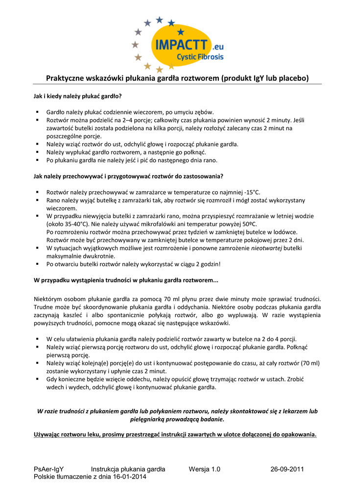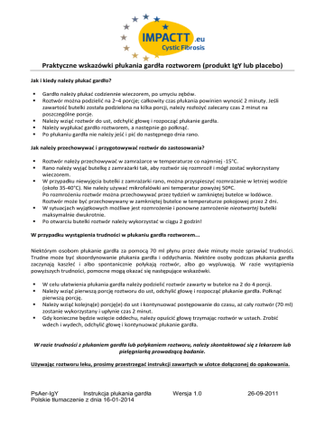 Praktyczne wskazówki płukania gardła roztworem (produkt IgY lub placebo) Jak i kiedy należy płukać gardło? Gardło należy płukać codziennie wieczorem, po umyciu zębów. Roztwór można podzielić na 2–4 porcje; całkowity czas płukania powinien wynosić 2 minuty. Jeśli zawartość butelki została podzielona na kilka porcji, należy rozłożyć zalecany czas 2 minut na poszczególne porcje. Należy wziąć roztwór do ust, odchylić głowę i rozpocząć płukanie gardła. Należy wypłukać gardło roztworem, a następnie go połknąć. Po płukaniu gardła nie należy jeść i pić do następnego dnia rano. Jak należy przechowywać i przygotowywać roztwór do zastosowania? Roztwór należy przechowywać w zamrażarce w temperaturze co najmniej -15°C. Rano należy wyjąć butelkę z zamrażarki tak, aby roztwór się rozmroził i mógł zostać wykorzystany wieczorem. W przypadku niewyjęcia butelki z zamrażarki rano, można przyspieszyć rozmrażanie w letniej wodzie (około 35-40°C). Nie należy używać mikrofalówki ani temperatur powyżej 50ºC. Po rozmrożeniu roztwór można przechowywać przez tydzień w zamkniętej butelce w lodówce. Roztwór może być przechowywany w zamkniętej butelce w temperaturze pokojowej przez 2 dni. W sytuacjach wyjątkowych możliwe jest rozmrożenie i ponowne zamrożenie nieotwartej butelki maksymalnie dwukrotnie. Po otwarciu butelki roztwór należy wykorzystać w ciągu 2 godzin! W przypadku wystąpienia trudności w płukaniu gardła roztworem... Niektórym osobom płukanie gardła za pomocą 70 ml płynu przez dwie minuty może sprawiać trudności. Trudne może być skoordynowanie płukania gardła i oddychania. Niektóre osoby podczas płukania gardła zaczynają kaszleć i albo spontanicznie połykają roztwór, albo go wypluwają. W razie wystąpienia powyższych trudności, pomocne mogą okazać się następujące wskazówki. W celu ułatwienia płukania gardła należy podzielić roztwór zawarty w butelce na 2 do 4 porcji. Należy wziąć pierwszą porcję roztworu do ust, odchylić głowę i rozpocząć płukanie gardła. Połknąć pierwszą porcję. Należy wziąć kolejną(e) porcję(e) do ust i kontynuować postępowanie do czasu, aż cały roztwór (70 ml) zostanie wykorzystany i upłynie czas 2 minut. Gdy konieczne będzie wzięcie oddechu, należy opuścić głowę trzymając roztwór w ustach. Zrobić wdech i wydech, odchylić głowę i kontynuować płukanie gardła. W razie trudności z płukaniem gardła lub połykaniem roztworu, należy skontaktować się z lekarzem lub pielęgniarką prowadzącą badanie. Używając roztworu leku, prosimy przestrzegać instrukcji zawartych w ulotce dołączonej do opakowania. PsAer-IgY Instrukcja płukania gardła Polskie tłumaczenie z dnia 16-01-2014 Wersja 1.0 26-09-2011