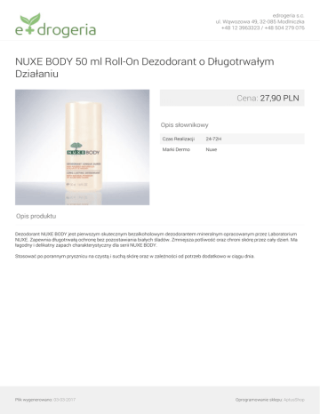 edrogeria s.c. ul. Wąwozowa 49, 32-085 Modlniczka +48 12 3963323 / +48 504 279 076 NUXE BODY 50 ml Roll-On Dezodorant o Długotrwałym Działaniu Cena: 27,90 PLN Opis słownikowy Czas Realizacji 24-72H Marki Dermo Nuxe Opis produktu Dezodorant NUXE BODY jest pierwszym skutecznym bezalkoholowym dezodorantem mineralnym opracowanym przez Laboratorium NUXE. Zapewnia długotrwałą ochronę bez pozostawiania białych śladów. Zmniejsza potliwość oraz chroni skórę przez cały dzień. Ma łagodny i delikatny zapach charakterystyczny dla serii NUXE BODY. Stosować po porannym prysznicu na czystą i suchą skórę oraz w zależności od potrzeb dodatkowo w ciągu dnia. Plik wygenerowano: 03-03-2017 Powered by TCPDF (www.tcpdf.org) Oprogramowanie sklepu: AptusShop