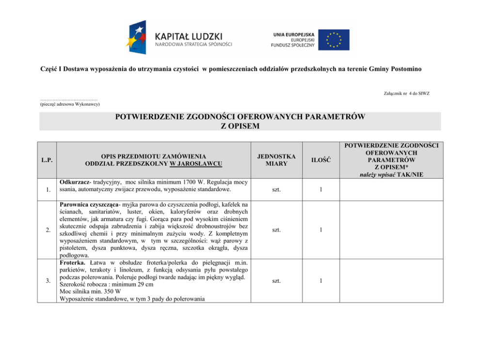 Część I Dostawa wyposaŜenia do utrzymania czystości w pomieszczeniach oddziałów przedszkolnych na terenie Gminy Postomino Załącznik nr 4 do SIWZ …………….…………………. (pieczęć adresowa Wykonawcy) POTWIERDZENIE ZGODNOŚCI OFEROWANYCH PARAMETRÓW Z OPISEM L.P. 1. 2. 3. OPIS PRZEDMIOTU ZAMÓWIENIA ODDZIAŁ PRZEDSZKOLNY W JAROSŁAWCU JEDNOSTKA MIARY ILOŚĆ Odkurzacz- tradycyjny, moc silnika minimum 1700 W. Regulacja mocy ssania, automatyczny zwijacz przewodu, wyposaŜenie standardowe. szt. 1 szt. 1 szt. 1 Parownica czyszcząca- myjka parowa do czyszczenia podłogi, kafelek na ścianach, sanitariatów, luster, okien, kaloryferów oraz drobnych elementów, jak armatura czy fugi. Gorąca para pod wysokim ciśnieniem skutecznie odspaja zabrudzenia i zabija większość drobnoustrojów bez szkodliwej chemii i przy minimalnym zuŜyciu wody. Z kompletnym wyposaŜeniem standardowym, w tym w szczególności: wąŜ parowy z pistoletem, dysza punktowa, dysza ręczna, szczotka okrągła, dysza podłogowa. Froterka. Łatwa w obsłudze froterka/polerka do pielęgnacji m.in. parkietów, terakoty i linoleum, z funkcją odsysania pyłu powstałego podczas polerowania. Poleruje podłogi twarde nadając im piękny wygląd. Szerokość robocza : minimum 29 cm Moc silnika min. 350 W WyposaŜenie standardowe, w tym 3 pady do polerowania POTWIERDZENIE ZGODNOŚCI OFEROWANYCH PARAMETRÓW Z OPISEM* naleŜy wpisać TAK/NIE Część I Dostawa wyposaŜenia do utrzymania czystości w pomieszczeniach oddziałów przedszkolnych na terenie Gminy Postomino L.P. OPIS PRZEDMIOTU ZAMÓWIENIA ODDZIAŁ PRZEDSZKOLNY W PIESZCZU JEDNOSTKA MIARY ILOŚĆ 4. Odkurzacz- tradycyjny, moc silnika minimum 1700 W. Regulacja mocy ssania, automatyczny zwijacz przewodu, wyposaŜenie standardowe. szt. 1 szt. 1 5. Zestaw myjący- w skład zestawu wchodzi: 1.dwuwiaderkowy wózek do sprzątania z dwoma 15-25 litrowymi wiaderkami - dzięki zastosowaniu dwóch wiader nie mieszamy czystej i brudnej wody. StelaŜ wózka wykonany jest z metalu a gumowe kółka nie rysują sprzątanej powierzchni. 2.Wyciskarka "szczękowa" wyciska mopy wszelkiego rodzaju. 3.Mop płaski 40 cm z ramą. L.P. OPIS PRZEDMIOTU ZAMÓWIENIA ODDZIAŁ PRZEDSZKOLNY W STANIEWICACH JEDNOSTKA MIARY ILOŚĆ 6. Odkurzacz do czyszczenia na sucho i mokro-odkurzacz z funkcją prania, odkurza zarówno na sucho jak i na mokro. Wystarczy spryskać wybraną powierzchnię środkiem piorącym a następnie odessać go wraz z rozpuszczonym brudem. Akcesoria i wyposaŜenie standardowe, moc min.1400 W. szt. 1 POTWIERDZENIE ZGODNOŚCI OFEROWANYCH PARAMETRÓW Z OPISEM* naleŜy wpisać TAK/NIE POTWIERDZENIE ZGODNOŚCI OFEROWANYCH PARAMETRÓW Z OPISEM* naleŜy wpisać TAK/NIE Część I Dostawa wyposaŜenia do utrzymania czystości w pomieszczeniach oddziałów przedszkolnych na terenie Gminy Postomino 7. Parownica czyszcząca- myjka parowa do czyszczenia podłogi, kafelek na ścianach, sanitariatów, luster, okien, kaloryferów oraz drobnych elementów, jak armatura czy fugi. Gorąca para pod wysokim ciśnieniem skutecznie odspaja zabrudzenia i zabija większość drobnoustrojów bez szkodliwej chemii i przy minimalnym zuŜyciu wody. Z kompletnym wyposaŜeniem standardowym, w tym w szczególności: wąŜ parowy z pistoletem, dysza punktowa, dysza ręczna, szczotka okrągła, dysza podłogowa szt. 1 *naleŜy wpisać TAK w przypadku zgodności oferowanego przedmiotu zamówienia z opisem lub NIE w przypadku, gdy oferowany przedmiot nie jest zgodny z opisem (podpis i pieczątka osoby(osób) uprawnionej(ych) do reprezentowania Wykonawcy) …………………………………………………………………………………………………… ………………………………… (miejscowość, data)