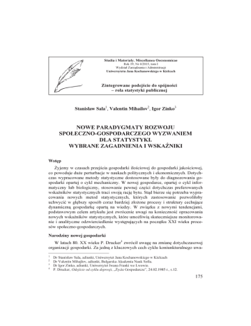 Studia i Materiały. Miscellanea Oeconomicae Rok 19, Nr 4/2015, tom I Wydział Zarządzania i Administracji Uniwersytetu Jana Kochanowskiego w Kielcach Zintegrowane podejście do spójności – rola statystyki publicznej Stanisław Sala1, Valentin Mihailov2, Igor Zinko3 NOWE PARADYGMATY ROZWOJU SPOŁECZNO-GOSPODARCZEGO WYZWANIEM DLA STATYSTYKI. WYBRANE ZAGADNIENIA I WSKAŹNIKI Wstęp Żyjemy w czasach przejścia gospodarki ilościowej do gospodarki jakościowej, co powoduje duże perturbacje w naukach politycznych i ekonomicznych. Dotychczas wypracowane metody statystyczne dostosowane były do diagnozowania gospodarki opartej o cykl mechaniczny. W nowej gospodarce, opartej o cykl informatyczny lub biologiczny, stosowanie pewnej części dotychczas preferowanych wskaźników statystycznych traci swoją rację bytu. Stąd bierze się potrzeba wypracowania nowych metod statystycznych, których zastosowanie pozwoliłoby uchwycić w głębszy sposób coraz bardziej złożone procesy i struktury cechujące dynamiczną gospodarkę opartą na wiedzy. W związku z nowymi tendencjami, podstawowym celem artykułu jest zwrócenie uwagi na konieczność opracowania nowych wskaźników statystycznych, które umożliwią skuteczniejsze monitorowanie i analityczne odzwierciedlenie występujących na początku XXI wieku procesów społeczno-gospodarczych. Narodziny nowej gospodarki W latach 80. XX wieku P. Drucker4 zwrócił uwagę na zmianę dotychczasowej organizacji gospodarki. Za jedną z kluczowych cech cyklu koniunkturalnego uwa1 2 3 4 Dr Stanisław Sala, adiunkt, Uniwersytet Jana Kochanowskiego w Kielcach Dr Valentin Mihajlov, adiunkt, Bułgarska Akademia Nauk Sofia. Dr Igor Zinko, adiunkt, Uniwersytet Iwana Franki we Lwowie. P. Drucker, Odejście od cyklu depresji, „Życie Gospodarcze”, 24.02.1985 r., s.12. 175 żano zależność gospodarek surowcowych od przemysłowych. Wiara była tak silna, że uznawano ją jako prawo mówiące, że długotrwała obniżka cen surowców mineralnych oraz produktów rolnych w ciągu 2-3 lat musi doprowadzić do ogólnoświatowej recesji. Drucker podaje przykład Wielkiej Depresji będącej konsekwencją załamania się cen surowców z 1927 roku. W latach 80. XX wieku gospodarki surowcowe pogrążone były w kryzysie. Spadek cen surowców porównywalny był do okresów z przed II wojny światowej tj. z 1927 czy 1932 roku. Pomimo niedożywienia wielu obszarów świata obserwowano zanik inwestycji w produkcję sprzętu rolniczego i górniczego. Górnictwo i rolnictwo zdradzały typowe cechy Wielkiej Depresji. Jednak kryzys gospodarek surowcowych nie znalazł przełożenia na gospodarki przemysłowe. Największe potęgi gospodarcze takie jak USA, Japonia, Francja czy ówczesny RFN przeżywały boom i nie uwzględniały w swoich planach rozwojowych depresji gospodarek surowcowych. Doszło do paradoksu polegającego na ożywieniu gospodarek wykorzystujących surowce mineralne pomimo stagnacji cen i popytu na surowce. Drucker zinterpretował przedstawione fakty jako zmianę paradygmatu rozwojowego w postaci przejścia od gospodarki opartej o cykl mechaniczny charakteryzującej się wzrostem proporcjonalnej zależności między wielkością produkcji a wydobyciem surowców, do gospodarki biologicznej, informatycznej, w której zależności między produkcją a zużyciem surowców są odwrotnie proporcjonalne. W nowej gospodarce wiedza urosła do rangi sił wytwórczych zasadniczo zmieniając stare wzorce rozwoju. Gospodarka zmieniła swoją strukturę z układu pionowego na układ sieciowy, uruchamiając cały szereg nowych zjawisk i procesów. Nigdy w historii gospodarczej świata różne kraje i regiony nie były tak współzależne między sobą jak obecnie. Gospodarka i społeczeństwo danego kraju współcześnie jest silnie skorelowana z rodzącą się gospodarką światową. Omawiany trend jest nieodwracalny, a wszelkie próby jego powstrzymania kończą się recesją, czyli wyrugowaniem kraju z głównego nurtu rozwojowego. Kraje są skazane na ścisłe związki z gospodarką światową, a nurty i kierunki rozwoju świata stają się nurtami krajowymi. W imię dobrze rozumianego rozwoju nie możemy tych trendów odrzucać. Fizyczna przestrzeń ulega kompresji, wszędzie jest blisko, relacje między dużymi miastami są ściślejsze niż między miastem a prowincją. Współcześnie fizyczna bliskość jest zastępowana bliskością sieci, mnożące interakcje łączą wszystko i wszędzie. Rozwój Internetu doprowadził do powstania nowej wirtualnej rzeczywistości, w której kwestie niematerialne zaczynają dominować nad materialnymi5. Kolejną cechą współczesnej gospodarki światowej jest dynamika i labilność zmian spowodowana wszechobecną rywalizacją6. Następuje koniec planowanego harmonijnego rozwoju. Obecnie nieprzewidywalność, turbulencje oraz niestabil5 6 S. Flejterski, P. Wahl, Ekonomia globalna. Synteza, Wydawnictwo Difin, Warszawa 2003, s. 97-150. B. Janik, Kapitalizm w ujęciu dynamicznym. Od państwa dobrobytu do globalizacji, Wydawnictwo Akademii Świętokrzyskiej, Kielce 2006, s. 17-95. 176 ność stają się normą7. Następuje homogenizacja świata, w której wybrane wartości przyjmujemy jako swoje, część traktujemy jako obce a inne adaptujemy do lokalnych warunków8. Okręgi przemysłowe starej generacji zastąpione zostały okręgami przemysłowymi nowej generacji, w których rozwija się elastyczna produkcja dostosowana do konkretnych potrzeb ilościowych i jakościowych wybranej grupy konsumentów. Stare zakłady przemysłowe były na zawsze związane swoją infrastrukturą z miejscem funkcjonowania, natomiast nowe są labilne. W razie potrzeby można w stosunkowo krótkim czasie przenieść zakład w dowolne miejsce na Ziemi. Procesy globalizacji9 niosą z sobą wiele procesów oddziałujących w sposób pozytywny i negatywny na poszczególne kraje. Dlatego bardzo istotną kwestią jest prawidłowa diagnoza tych zjawisk10 