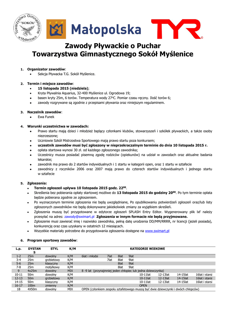 Zawody Pływackie o Puchar Towarzystwa Gimnastycznego Sokół Myślenice 1. Organizator zawodów: Sekcja Pływacka T.G. Sokół Myślenice. 2. Termin i miejsce zawodów: 15 listopada 2015 (niedziela); Kryta Pływalnia Aquarius, 32-400 Myślenice ul. Ogrodowa 19; basen kryty 25m, 6 torów. Temperatura wody 27oC. Pomiar czasu ręczny. Ilość torów 6; zawody rozgrywane są zgodnie z przepisami pływania oraz niniejszym regulaminem. 3. Naczelnik zawodów: Ewa Funek 4. Warunki uczestnictwa w zawodach: Prawo startu mają dzieci i młodzież będący członkami klubów, stowarzyszeń i szkółek pływackich, a także osoby niezrzeszone; Uczniowie Szkół Mistrzostwa Sportowego mają prawo startu poza konkursem; uczestnik zawodów musi być zgłoszony w nieprzekraczalnym terminie do dnia 10 listopada 2015 r. opłata startowa wynosi 30 zł. od każdego zgłoszonego zawodnika; Uczestnicy musza posiadać pisemną zgodę rodziców (opiekunów) na udział w zawodach oraz aktualne badania lekarskie; zawodnik ma prawo do 2 startów indywidualnych i 1 startu w kategorii open, oraz 1 startu w sztafecie zawodnicy z roczników 2006 oraz 2007 mają prawo do czterech startów indywidualnych i jednego startu w sztafecie 5. Zgłoszenia: Termin zgłoszeń upływa 10 listopada 2015 godz. 2200. Skreślenia bez pobierania opłaty startowej możliwe do 13 listopada 2015 do godziny 2000. Po tym terminie opłata będzie pobierana zgodnie ze zgłoszeniem. Po wyznaczonym terminie zgłoszenia nie będą uwzględniane, Po opublikowaniu potwierdzeń zgłoszeń oraz/lub listy zgłoszonych zawodników nie będą dokonywane jakiekolwiek zmiany za wyjątkiem skreśleń. Zgłoszenia muszą być przygotowane w edytorze zgłoszeń SPLASH Entry Editor. Wygenerowany plik lxf należy przesyłać na adres: [email protected] Zgłoszenia w innym formacie nie będą przyjmowane. Zgłoszenie musi zawierać imię i nazwisko zawodnika, pełną datę urodzenia DD/MM/RRRR, nr licencji (jeżeli posiada), konkurencję oraz czas uzyskany w ostatnich 12 miesiącach. Wszystkie materiały potrzebne do przygotowania zgłoszenia dostępne na www.swimart.pl 6. Program sportowy zawodów: L.p. 1-2 3-4 5-6 7-8 9 10-11 12-13 14-15 16-17 18 DYSTAN S 25m 25m 25m 25m 4x25m 50m 50m 50m 100m 4X50m STYL dowolny grzbietowy klasyczny motylkowy dowolny dowolny grzbietowy klasyczny zmienny dowolny K/M K/M K/M K/M K/M MIX K/M K/M K/M K/M MIX KATEGORIE WIEKOWE 6lat i młodsi 7lat 7lat 8lat 9lat 8lat 9lat 8lat 9lat 8lat 9lat 8 -9 lat (przynajmniej jeden chłopiec lub jedna dziewczynka) 10-11lat 12-13lat 10-11lat 12-13lat 10-11lat 12-13lat OPEN OPEN (członkiem zespołu sztafetowego muszą być dwie dziewczynki i 14-15lat 14-15lat 14-15lat 16lat i starsi 16lat i starsi 16lat i starsi dwóch chłopców) 7. Nagrody: Dla zwycięzców w poszczególnych grupach wiekowych w konkurencjach indywidualnych przyznawane będą medale i dyplomy za miejsca I – III. Dla zespołów sztafetowych przyznawane będą puchary i dyplomy za pierwsze trzy miejsca; Dla zawodników z roczników 2006 i 2007 będzie prowadzona dodatkowa klasyfikacja wielobojowa. Do wyniku końcowego będzie się liczyć suma czasów ze startów w czterech konkurencjach. Za miejsca I – III w klasyfikacji wielobojowej przyznawane będą puchary i dyplomy. 8. Sprawy porządkowe: za dyscyplinę i porządek w czasie trwania zawodów czyni się odpowiedzialnych Opiekunów drużyn; za dopuszczenie zawodnika do startu czyni się odpowiedzialnym Opiekuna drużyny; każdy uczestnik zawodów musi posiadać dokument tożsamości; 9. Sprawy organizacyjne: zawody są rozgrywane seriami na czas bez podziału na kategorie wiekowe. Wyniki końcowe będą podawane w podziale na kategorie wiekowe; w sprawach nie objętych niniejszym regulaminem decyduje naczelnik zawodów; zgłoszenie do zawodów jest równoznaczne z akceptacją postanowień niniejszego regulaminu; organizator zastrzega sobie prawo do zmiany terminu zawodów oraz korekty programu czasowego; potwierdzenie zgłoszeń i wyniki (w systemie on-line) będą dostępne na stronie www.swimart.pl; listę startową opiekunowie drużyn otrzymają po opłaceniu opłaty startowej. 10. Program czasowy zawodów: 900–920 rozgrzewka dla dziewcząt i chłopców (zawodnicy 10 lat i młodsi); 920– odprawa kierowników drużyn; potwierdzenie zgłoszeń oraz przekazanie załącznika nr 1; 925– otwarcie zawodów; 930–start pierwszej konkurencji Dekoracja zawodników 9 letnich i młodszych po zakończeniu konkurencji 4x25m st. dowolnym MIX. W tym samym czasie zostanie przeprowadzona rozgrzewka zawodników 10-letnich i starszych. Załącznik nr 1 Potwierdzam zgodność lekarską zawodników lub odbiór zgody rodziców (opiekunów) na udział dzieci i młodzieżyw zawodach pływackich w dniu 15/11/2015 roku, jednocześnie oświadczam, że biorę odpowiedzialność za dopuszczeniezawodników do startu. ................................................. Opiekun (kierownik) drużyny Załącznik nr 1 należy przedstawić na odprawie kierowników drużyn.